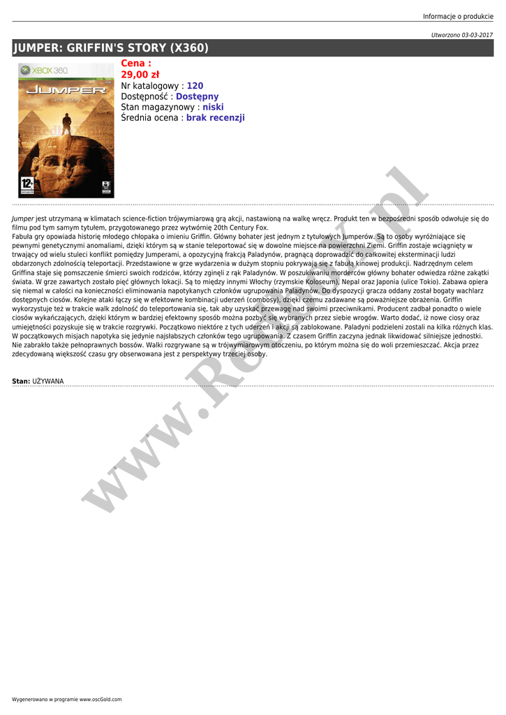 Informacje o produkcie Utworzono 03-03-2017 JUMPER: GRIFFIN'S STORY (X360) Cena : 29,00 zł .p l Nr katalogowy : 120 Dostępność : Dostępny Stan magazynowy : niski Średnia ocena : brak recenzji w .R w w Stan: UŻYWANA ed b oX Jumper jest utrzymaną w klimatach science-fiction trójwymiarową grą akcji, nastawioną na walkę wręcz. Produkt ten w bezpośredni sposób odwołuje się do filmu pod tym samym tytułem, przygotowanego przez wytwórnię 20th Century Fox. Fabuła gry opowiada historię młodego chłopaka o imieniu Griffin. Główny bohater jest jednym z tytułowych Jumperów. Są to osoby wyróżniające się pewnymi genetycznymi anomaliami, dzięki którym są w stanie teleportować się w dowolne miejsce na powierzchni Ziemi. Griffin zostaje wciągnięty w trwający od wielu stuleci konflikt pomiędzy Jumperami, a opozycyjną frakcją Paladynów, pragnącą doprowadzić do całkowitej eksterminacji ludzi obdarzonych zdolnością teleportacji. Przedstawione w grze wydarzenia w dużym stopniu pokrywają się z fabułą kinowej produkcji. Nadrzędnym celem Griffina staje się pomszczenie śmierci swoich rodziców, którzy zginęli z rąk Paladynów. W poszukiwaniu morderców główny bohater odwiedza różne zakątki świata. W grze zawartych zostało pięć głównych lokacji. Są to między innymi Włochy (rzymskie Koloseum), Nepal oraz Japonia (ulice Tokio). Zabawa opiera się niemal w całości na konieczności eliminowania napotykanych członków ugrupowania Paladynów. Do dyspozycji gracza oddany został bogaty wachlarz dostępnych ciosów. Kolejne ataki łączy się w efektowne kombinacji uderzeń (combosy), dzięki czemu zadawane są poważniejsze obrażenia. Griffin wykorzystuje też w trakcie walk zdolność do teleportowania się, tak aby uzyskać przewagę nad swoimi przeciwnikami. Producent zadbał ponadto o wiele ciosów wykańczających, dzięki którym w bardziej efektowny sposób można pozbyć się wybranych przez siebie wrogów. Warto dodać, iż nowe ciosy oraz umiejętności pozyskuje się w trakcie rozgrywki. Początkowo niektóre z tych uderzeń i akcji są zablokowane. Paladyni podzieleni zostali na kilka różnych klas. W początkowych misjach napotyka się jedynie najsłabszych członków tego ugrupowania. Z czasem Griffin zaczyna jednak likwidować silniejsze jednostki. Nie zabrakło także pełnoprawnych bossów. Walki rozgrywane są w trójwymiarowym otoczeniu, po którym można się do woli przemieszczać. Akcja przez zdecydowaną większość czasu gry obserwowana jest z perspektywy trzeciej osoby. Wygenerowano w programie www.oscGold.com