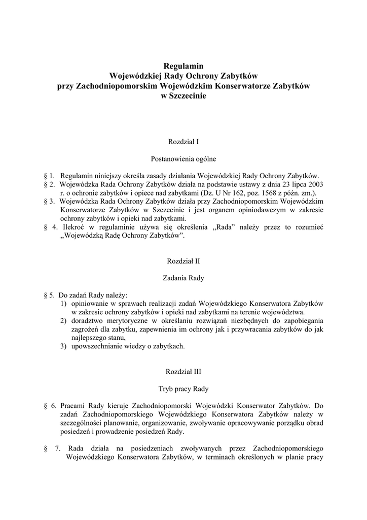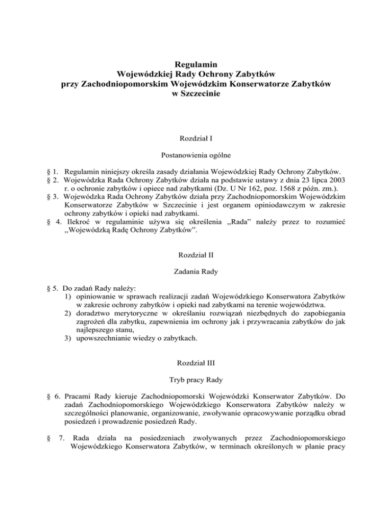 Regulamin Wojewódzkiej Rady Ochrony Zabytków przy Zachodniopomorskim Wojewódzkim Konserwatorze Zabytków w Szczecinie Rozdział I Postanowienia ogólne § 1. Regulamin niniejszy określa zasady działania Wojewódzkiej Rady Ochrony Zabytków. § 2. Wojewódzka Rada Ochrony Zabytków działa na podstawie ustawy z dnia 23 lipca 2003 r. o ochronie zabytków i opiece nad zabytkami (Dz. U Nr 162, poz. 1568 z późn. zm.). § 3. Wojewódzka Rada Ochrony Zabytków działa przy Zachodniopomorskim Wojewódzkim Konserwatorze Zabytków w Szczecinie i jest organem opiniodawczym w zakresie ochrony zabytków i opieki nad zabytkami. § 4. Ilekroć w regulaminie używa się określenia ,,Rada” należy przez to rozumieć ,,Wojewódzką Radę Ochrony Zabytków”. Rozdział II Zadania Rady § 5. Do zadań Rady należy: 1) opiniowanie w sprawach realizacji zadań Wojewódzkiego Konserwatora Zabytków w zakresie ochrony zabytków i opieki nad zabytkami na terenie województwa. 2) doradztwo merytoryczne w określaniu rozwiązań niezbędnych do zapobiegania zagrożeń dla zabytku, zapewnienia im ochrony jak i przywracania zabytków do jak najlepszego stanu, 3) upowszechnianie wiedzy o zabytkach. Rozdział III Tryb pracy Rady § 6. Pracami Rady kieruje Zachodniopomorski Wojewódzki Konserwator Zabytków. Do zadań Zachodniopomorskiego Wojewódzkiego Konserwatora Zabytków należy w szczególności planowanie, organizowanie, zwoływanie opracowywanie porządku obrad posiedzeń i prowadzenie posiedzeń Rady. § 7. Rada działa na posiedzeniach zwoływanych przez Zachodniopomorskiego Wojewódzkiego Konserwatora Zabytków, w terminach określonych w planie pracy § § § § § Rady, nie rzadziej niż raz na kwartał. W uzasadnionych przypadkach posiedzenia Rady zwołuje się w trybie pilnym. 8. 1. Zawiadomienia o terminie, miejscu i porządku posiedzenia Rady są przekazywane członkom Rady, pisemnie, nie później niż na 7 dni przed wyznaczonym terminem posiedzenia. 2. W przypadku zwołania posiedzenia w trybie pilnym zawiadomienie o terminie posiedzenia Rady, wraz z porządkiem obrad powinno być doręczone uczestnikom posiedzenia niezwłocznie po podjęciu przez Zachodniopomorskiego Wojewódzkiego Konserwatora Zabytków decyzji o zwołaniu posiedzenia. 9. 1. Obsługę administracyjną Rady wykonuje sekretarz, wyznaczony przez Zachodniopomorskiego Wojewódzkiego Konserwatora Zabytków w Szczecinie, spośród pracowników Wojewódzkiego Urzędu Ochrony Zabytków Szczecinie. 2. Do zadań sekretarza należy: a) sporządzania protokołu posiedzenia Rady, b) sporządzanie projektu rocznego sprawozdania z działalności Rady i przedstawienie go Zachodniopomorskiemu Wojewódzkiemu Konserwatorowi Zabytków. 10. 1. Rada wyraża swoje stanowisko w formie opinii. 2. Ustalenia stanowiska Rady dokonuje się w drodze uzgodnienia. 11. Z posiedzenia Rady sporządza się protokół, który podpisuje sekretarz i Zachodniopomorski Wojewódzki Konserwator Zabytków w Szczecinie. Protokół jest przechowywany w sekretariacie Wojewódzkiego Urzędu Ochrony Zabytków w Szczecinie. 12. Obsługę organizacyjno – biurową i finansową zapewnia Wojewódzki Urząd Ochrony Zabytków w Szczecinie. IV Postanowienia końcowe § 13. Zmiany regulaminu następują przy zastosowaniu procedury właściwej dla jego nadania. § 14. W sprawach nieuregulowanych w regulaminie stosuje się odpowiednio przepisy ustawy z dnia 23 lipca 2003 r. o ochronie zabytków i opiece nad zabytkami (Dz. U. Nr 162, poz. 1568 z późn.zm.).