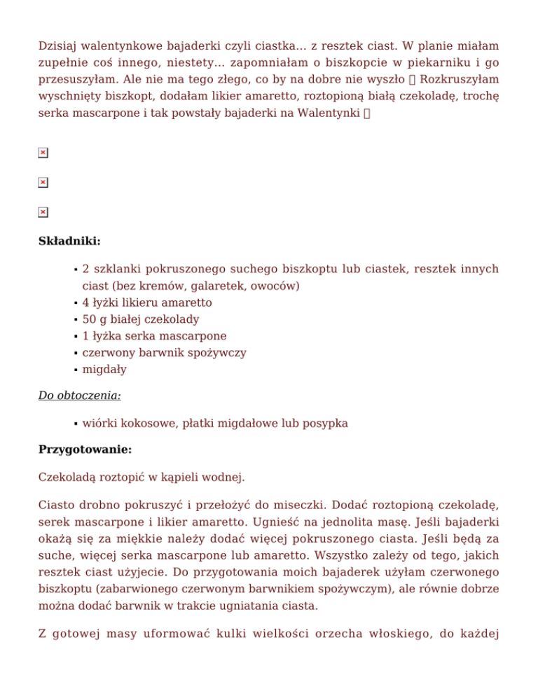 Dzisiaj walentynkowe bajaderki czyli ciastka… z resztek ciast. W planie miałam zupełnie coś innego, niestety… zapomniałam o biszkopcie w piekarniku i go przesuszyłam. Ale nie ma tego złego, co by na dobre nie wyszło Rozkruszyłam wyschnięty biszkopt, dodałam likier amaretto, roztopioną białą czekoladę, trochę serka mascarpone i tak powstały bajaderki na Walentynki Składniki: 2 szklanki pokruszonego suchego biszkoptu lub ciastek, resztek innych ciast (bez kremów, galaretek, owoców) 4 łyżki likieru amaretto 50 g białej czekolady 1 łyżka serka mascarpone czerwony barwnik spożywczy migdały Do obtoczenia: wiórki kokosowe, płatki migdałowe lub posypka Przygotowanie: Czekoladą roztopić w kąpieli wodnej. Ciasto drobno pokruszyć i przełożyć do miseczki. Dodać roztopioną czekoladę, serek mascarpone i likier amaretto. Ugnieść na jednolita masę. Jeśli bajaderki okażą się za miękkie należy dodać więcej pokruszonego ciasta. Jeśli będą za suche, więcej serka mascarpone lub amaretto. Wszystko zależy od tego, jakich resztek ciast użyjecie. Do przygotowania moich bajaderek użyłam czerwonego biszkoptu (zabarwionego czerwonym barwnikiem spożywczym), ale równie dobrze można dodać barwnik w trakcie ugniatania ciasta. Z gotowej masy uformować kulki wielkości orzecha włoskiego, do każdej wkładając po jednym migdale. Obtoczyć w wiórkach kokosowych, posypce lub płatkach migdałowych. Można też obtoczyć najpierw w polewie czekoladowej, a później w posypkach. Schłodzić. Smacznego Idealny pomysł na ciepłe, weekendowe śniadanie. Kokilki wypełniłam młodym szpinakiem z czosnkiem, odrobiną śmietany kremówki, pokrojonym w kostkę pomidorem i mozzarellą. Wbiłam po jednym jajku, doprawiłam solą i pieprzem i zapiekłam tak, aby żółtko pozostało płynne a białko ścięte. Voila! najlepiej smakują ze świeżym pieczywem lub grzankami Aaa… i Składniki (na 3 porcje): 125 g świeżego szpinaku „baby” 3 jajka 1 pomidor 1/2 kulki mozzarelli 1 ząbek czosnku 2 łyżki śmietany kremówki 30 % 1 łyżka oliwy z oliwek sól pieprz Przygotowanie: Pomidora sparzyć, ściągnąć skórkę i pokroić w kostkę. Na patelni rozgrzać oliwę z oliwek, wrzucić przeciśnięty przez praskę czosnek i lekko zeszklić. Dodać umyte i osuszone liście szpinaku oraz kremówkę. Mieszając podsmażać, aż szpinak zwiędnie i większość płynu odparuje (około 1 minuty). Wyłączyć gaz, dodać pokrojoną w kostkę mozzarellę i pomidora. Doprawić solą i pieprzem, wymieszać. Wypełnić kokilki, a na wierzch wbić po jednym jajku. Posolić i popieprzyć. Kokilki ustawić w naczyniu żaroodpornym wypełnionym wodą do połowy wysokości kokilek. Zapiekać w piekarniku nagrzanym do 190°C przez około 13-15 minut. Żółtka mają być płynne a białka ścięte. Smacznego Dzisiaj przepis na mini pączusie, które bardzo szybko przygotujecie. Zrobione są na proszku do pieczenia, wiec nie trzeba czekać aż wyrosną mięciutkie i na jeden kęs. Smaczne, Składniki: 300 g zmielonego twarogu (użyłam gotowego do sernika w wiaderku) 2 szklanki mąki 3 jajka 2 łyżki cukru pudru 2 płaskie łyżeczki proszku do pieczenia kieliszek wódki Dodatkowo: olej do smażenia cukier puder do posypania Przygotowanie: 1. Wszystkie składniki dokładnie ze sobą wymieszać na jednolitą masę. 2. W dużym i niskim garnku rozgrzać olej (około 170°C). 3. Łyżką nakładać ciasto (wielkości dużego orzecha włoskiego) na rozgrzany olej. Aby ciasto się nie kleiło należy zanurzać łyżkę w zimnym oleju. 4. Smażyć z dwóch stron na złoty kolor. 5. Wykładać na papierowe ręczniki i posypać cukrem pudrem. Smacznego Dzisiaj kuchnia marokańska, a dokładniej to pożywna, gęsta i rozgrzewająca zupa harira. Przygotowywana jest z baraniny, wołowiny lub kurczaka z dodatkiem soczewicy, ciecierzycy, grochu lub bobu. Niektórzy dodają do niej również ryż, makaron i kuskus, wszystko zależy od inwencji twórczej kucharza Zupę podaje się z pieczywem, jajkami ugotowanymi na twardo lub suszonymi daktylami do przegryzienia. Ja daktyle wkroiłam do zupy, dzięki czemu zyskała na smaku Składniki: 450 g wołowiny 200 g ciecierzycy 200 g czerwonej soczewicy 1 marchewka 2 łodygi selera naciowego 1 duża cebula 2 ząbki czosnku 500 g passaty pomidorowej 6-7 suszonych daktyli 2 litry bulionu 4 łyżki oliwy z oliwek 1 łyżka soku z limonki 1 i 1/2 łyżki suszonego imbiru 0,12 g szafranu 2 łyżeczki kminu rzymskiego 1 płaska łyżeczka cynamonu świeża kolendra do posypania sól pieprz Przygotowanie: Ciecierzycę wypłukać, zalać zimną wodą i odstawić na noc do namoczenia. Na drugi dzień lekko posolić i gotować do miękkości. Odcedzić. Na dużej patelni rozgrzać 2 łyżki oliwy z oliwek, wrzucić pokrojone w kostkę mięso i zrumienić. Przełożyć do garnka. Na tej samej patelni rozgrzać pozostałe 2 łyżki oliwy z oliwek, wrzucić posiekaną cebulę i zeszklić. Dodać przeciśnięty przez praskę czosnek, pokrojoną w kosteczkę marchewkę, drobniutko posiekany seler naciowy, utarty w moździerzu kmin rzymski, imbir i cynamon. Mieszając chwilę smażyć, następnie przełożyć do garnka z mięsem. Wlać bulion i dodać szafran. Gotować do miękkości mięsa. Gdy mięso będzie prawie miękkie, dodać opłukaną czerwoną soczewicę, drobno posiekane daktyle oraz passatę pomidorową. Gotować do miękkości składników. Dodać ugotowaną ciecierzycę, doprawić sokiem z limonki, solą i pieprzem. Gotową zupę posypać posiekaną kolendrą. Smacznego Makaron w kształcie muszli nadziewany tuńczykiem, świeżym szpinakiem i mozzarellą, zapiekany w sosie pomidorowym z dodatkiem serka mascarpone i odrobiny szałwii. Wyjątkowo pyszne połączenie smaków… Danie idealnie sprawdzi się na obiad lub ciepłą kolację. Polecam Składniki: 22 muszle makaronowe (około 250 g) 200 g świeżego szpinaku 2 puszki tuńczyka w oleju 2 kulki