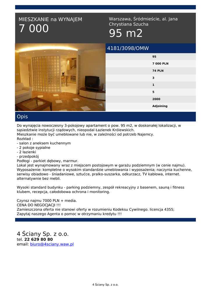 MIESZKANIE na WYNAJEM 7 000 Warszawa, Śródmieście, al. Jana Chrystiana Szucha 95 m2 4181/3098/OMW 95 7 000 PLN 74 PLN 3 1 5 2000 Adjoining Opis Do wynajęcia nowoczesny 3-pokojowy apartament o pow. 95 m2, w doskonałej lokalizacji, w sąsiedztwie instytucji rządowych, nieopodal Łazienek Królewskich. Mieszkanie może być umeblowane lub nie, w zależności od potrzeb Najemcy. Rozkład : - salon z aneksem kuchennym - 2 pokoje sypialne - 2 łazienki - przedpokój Podłogi - parkiet dębowy, marmur. Lokal jest wynajmowany wraz z miejscem postojowym w garażu podziemnym (w cenie najmu). Wyposażenie: kompletne o wysokim standardzie umeblowania i wyposażenia; naczynia kuchenne, serwisy obiadowo - śniadaniowe, sztućce, pralko-suszarka, odkurzacz, TV kablowa, internet. alternatywnie bez mebli. Wysoki standard budynku - parking podziemny, zespół rekreacyjny z basenem, sauną i fitness klubem, recepcja, całodobowa ochrona i monitoring. Czynsz najmu 7000 PLN + media. CENA DO NEGOCJACJI !!! Zamieszczona oferta nie stanowi oferty w rozumieniu Kodeksu Cywilnego. licencja 4355; Zapytaj naszego Agenta o pomoc w otrzymaniu kredytu !!! 4 Ściany Sp. z o.o. tel. 22 629 80 80 email: [email protected] 4 Ściany Sp. z o.o. Powered by TCPDF (www.tcpdf.org)