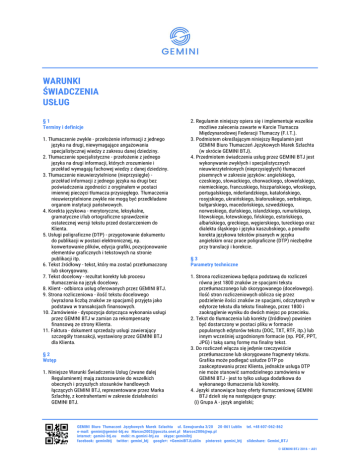 WARUNKI ŚWIADCZENIA USŁUG §1 Terminy i definicje 1. Tłumaczenie zwykłe - przełożenie informacji z jednego języka na drugi, niewymagające angażowania specjalistycznej wiedzy z zakresu danej dziedziny. 2. Tłumaczenie specjalistyczne - przełożenie z jednego języka na drugi informacji, których zrozumienie i przekład wymagają fachowej wiedzy z danej dziedziny. 3. Tłumaczenie nieuwierzytelnione (nieprzysięgłe) przekład informacji z jednego języka na drugi bez poświadczenia zgodności z oryginałem w postaci imiennej pieczęci tłumacza przysięgłego. Tłumaczenia nieuwierzytelnione zwykle nie mogą być przedkładane organom instytucji państwowych. 4. Korekta językowa - merytoryczne, leksykalne, gramatyczne i/lub ortograficzne sprawdzenie ostatecznej wersji tekstu przed dostarczeniem do Klienta. 5. Usługi poligraficzne (DTP) - przygotowanie dokumentu do publikacji w postaci elektronicznej, np. konwertowanie plików, edycja grafiki, pozycjonowanie elementów graficznych i tekstowych na stronie publikacji itp. 6. Tekst źródłowy - tekst, który ma zostać przetłumaczony lub skorygowany. 7. Tekst docelowy - rezultat korekty lub procesu tłumaczenia na język docelowy. 8. Klient - odbiorca usług oferowanych przez GEMINI BTJ. 9. Strona rozliczeniowa - ilość tekstu docelowego (wyrażona liczbą znaków ze spacjami) przyjęta jako podstawa w transakcjach finansowych. 10. Zamówienie - dyspozycja dotycząca wykonania usługi przez GEMINI BTJ w zamian za rekompensatę finansową ze strony Klienta. 11. Faktura - dokument sprzedaży usługi zawierający szczegóły transakcji, wystawiony przez GEMINI BTJ dla Klienta. §2 Wstęp 1. Niniejsze Warunki Świadczenia Usług (zwane dalej Regulaminem) mają zastosowanie do wszelkich obecnych i przyszłych stosunków handlowych łączących GEMINI BTJ, reprezentowane przez Marka Szlachtę, z kontrahentami w zakresie działalności GEMINI BTJ. 2. Regulamin niniejszy opiera się i implementuje wszelkie możliwe zalecenia zawarte w Karcie Tłumacza Międzynarodowej Federacji Tłumaczy (F.I.T.). 3. Podmiotem określającym niniejszy Regulamin jest GEMINI Biuro Tłumaczeń Językowych Marek Szlachta (w skrócie GEMINI BTJ). 4. Przedmiotem świadczenia usług przez GEMINI BTJ jest wykonywanie zwykłych i specjalistycznych nieuwierzytelnionych (nieprzysięgłych) tłumaczeń pisemnych w zakresie języków: angielskiego, czeskiego, słowackiego, chorwackiego, słoweńskiego, niemieckiego, francuskiego, hiszpańskiego, włoskiego, portugalskiego, niderlandzkiego, katalońskiego, rosyjskiego, ukraińskiego, białoruskiego, serbskiego, bułgarskiego, macedońskiego, szwedzkiego, norweskiego, duńskiego, islandzkiego, rumuńskiego, litewskiego, łotewskiego, fińskiego, estońskiego, albańskiego, greckiego, węgierskiego, tureckiego oraz dialektu śląskiego i języka kaszubskiego, a ponadto korekta językowa tekstów pisanych w języku angielskim oraz prace poligraficzne (DTP) niezbędne przy translacji i korekcie. §3 Parametry techniczne 1. Strona rozliczeniowa będąca podstawą do rozliczeń równa jest 1800 znaków ze spacjami tekstu przetłumaczonego lub skorygowanego (docelowego). Ilość stron rozliczeniowych oblicza się przez podzielenie ilości znaków ze spacjami, odczytanych w edytorze tekstu dla tekstu finalnego, przez 1800 i zaokrąglenie wyniku do dwóch miejsc po przecinku. 2. Tekst do tłumaczenia lub korekty (źródłowy) powinien być dostarczony w postaci pliku w formacie popularnych edytorów tekstu (DOC, TXT, RTF, itp.) lub innym wcześniej uzgodnionym formacie (np. PDF, PPT, JPG) i taką samą formę ma finalny tekst. 3. Do rozliczeń włącza się jedynie rzeczywiście przetłumaczone lub skorygowane fragmenty tekstu. Grafika może podlegać usłudze DTP po zaakceptowaniu przez Klienta, jednakże usługa DTP nie może stanowić samodzielnego zamówienia w GEMINI BTJ - jest to tylko usługa dodatkowa do wykonanego tłumaczenia lub korekty. 4. Języki stanowiące bazę oferty tłumaczeniowej GEMINI BTJ dzieli się na następujące grupy: (i) Grupa A - język angielski; GEMINI Biuro Tłumaczeń Językowych Marek Szlachta ul. Szwajcarska 3/20 20-861 Lublin e-mail: [email protected] [email protected] [email protected] internet: gemini-btj.eu mobi: m.gemini-btj.eu skype: geminibtj facebook: geminibtj twitter: gemini_btj google+: +GeminiBTJLublin pinterest: gemini_btj tel. +48 607-062-862 slideshare: Gemini_BTJ © GEMINI BTJ 2016 – A01 (ii) Grupa B - języki: czeski, słowacki, chorwacki i słoweński; (iii) Grupa C - języki: niemiecki, francuski, hiszpański, włoski, portugalski, niderlandzki i kataloński; (iv) Grupa D - języki: rosyjski, ukraiński, białoruski, serbski, bułgarski i macedoński; (v) Grupa E - języki: szwedzki, norweski, duński, islandzki, rumuński, litewski i łotewski; (vi) Grupa F - języki: fiński, estoński, albański, grecki, węgierski i turecki; (vii) Grupa G - dialekt śląski, język kaszubski. 5. Ceny tłumaczeń z języka polskiego na język obcy: (i) Grupa A - 32,00 zł za stronę rozliczeniową; (ii) Grupa B - 36,00 zł za stronę rozliczeniową; (iii) Grupa C - 38,00 zł za stronę rozliczeniową; (iv) Grupa D - 40,00 zł za stronę rozliczeniową; (v) Grupa E - 42,00 zł za stronę rozliczeniową; (vi) Grupa F - 46,00 zł za stronę rozliczeniową; (vii) Grupa G - usługa niedostępna. 6. Ceny tłumaczeń z języka obcego na język polski: (i) Grupa A - 27,00 zł za stronę rozliczeniową; (ii) Grupa B - 32,00 zł za stronę rozliczeniową; (iii) Grupa C - 33,00 zł za stronę rozliczeniową; (iv) Grupa D - 36,00 zł za stronę rozliczeniową; (v) Grupa E - 37,00 zł za stronę rozliczeniową; (vi) Grupa F - 41,00 zł za stronę rozliczeniową; (vii) Grupa G - 28,00 zł za stronę rozliczeniową. 7. Ceny tłumaczeń z języka polskiego na język obcy za każde zamówienie powyżej łącznej sumy 40 stron rozliczeniowych przetłumaczonych w danym roku kalendarzowym: (i) Grupa A -