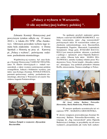 ,,Polacy z wyboru w Warszawie. O sile asymilacyjnej kultury polskiej ". Zebranie Komisji Historycznej pod powyższym tytułem odbyło się 19 marca 2010 r. w lokalu ZG TPW (Plac Zamkowy). Głównym powodem wyboru tego tematu była znakomita wystawa w Domu Spotkań z Historią na przy ul. Karowej pt. „Polacy z wyboru”, poświęcona rodzinom pochodzenia niemieckiego. Współtwórcą tej wystawy był nasz Kolega z Komisji Historycznej TADEUSZ ŚWIĄTEK, autor 70. filmów telewizyjnych o rodach warszawskich, a także wystawy poświęconej polskim ewangelikom. Jednym z bohaterów wystawy, jest także nasz Kolega z Komisji, WITOLD STRAUS, potomek spolszczonej rodziny pochodzenia niemieckiego, aktywnej w Warszawie od czasów Stanisława Augusta Poniatowskiego. Na spotkanie przybyli znakomici goście. Jednym z nich był OLGIERD BUDREWICZ wybitny varsavianista, autor ,,Sag warszawskich” poświęconych także 30 warszawskim rodom pochodzenia cudzoziemskiego, m.in. Bacciarellich, Hiszpańskich, Pugetów, Marconich, Łopieńskich, Semadenich. Drugi gość, RYSZARD BACCIARELLI jest znanym polskim aktorem, a pochodzi z jednego z opisanych przez Olgierda Budrewicza rodów. Obecna była także MARIA DIATŁOWICKA, autorka wydanej właśnie przez Wydawnictwo Nowy Świat książki ,,Mozaika rodzinna”, ukazującej losy polskich potomków Johanna Reiffa, mieszczanina, Niemca osiadłego w Polsce. Od lewej siedzą: Barbara PetrozolinSkowrońska, Maria Diatłowicka, Witold Straus. W naszym spotkaniu uczestniczyła też wiceprezes TPW - MARZENA GROCHOWSKA. Tadeusz Świątek w rozmowie z Ryszardem Bacciarellim. W słowie wstępnym przewodnicząca Komisji Historycznej Barbara Petrozolin-Skowrońska, nawiązując do ,,Sag warszawskich” pióra Olgierda Budrewicza (i dodając, że przydałoby się ich nowe wydanie!), przypomniała jak wielu było zasłużo- nych dla Warszawy Polaków cudzoziemskiego pochodzenia, poczynając od towarzyszącego spotkaniu na portrecie, Stanisława Lorentza, wieloletniego prezesa TPW, którego przodkowie pochodzili ze Skandynawii, Lothów – z Lotaryngii, Machlejdów – ze Szkocji, Semadenich – ze Szwajcarii, itd.. Głównym tematem obecnego spotkania są jednak liczne rodziny pochodzenia niemieckiego, a w spotkaniu uczestniczy trójka przedstawicieli tych rodzin. W spotkaniu uczestniczyli m.in.: (od lewej) Tadeusz Burchacki, Marzena Grochowska, Olgierd Budrewicz, Ryszard Bacciarelli. Pierwszy zabrał głos Tadeusz Świątek, potomek rodziny Rode, blisko spokrewniony też z Libeltami. Jako współtwórca wystawy w DSH mówił o jej koncepcji merytorycznej i wystawienniczej, o źródłach materiałów prezentowanych na wystawie, o kontaktach z rodzinami, zbiorach rodzinnych oraz pochodzących z rozproszonych zbiorów archiwalnych i muzealnych. Prezentował też materiały ikonograficzne związane z wystawą. Podkreślił, że dla varsavianistów szczególną atrakcją są fragmenty najstarszej fotograficznej panoramy stolicy z 1857 roku, wykonanej przez Karola Beyera z wieży kościoła ewangelicko-augsburskiego na pl. Małachowskiego, a także fotografie Karola Brandla, pokazujące miasto w drugiej połowie XIX wieku. Są też unikatowe dokumenty, jak np. dyplom majstra Adolfa Strausa z XIX w. po rosyjsku, polsku i niemiecku, zaświadczenie z 1926 roku z podpisem pierwszego dyrektora Polskiego Radia, Zygmunta JaxyChamca, o zatrudnieniu w Polskim Radiu Władysława Liebelta, czy listy polskich żołnierzy, przedstawicieli omawianych rodzin, z niemieckich obozów jenieckich z czasów II wojny światowej. W wypowiedzi Tadeusza Świątka sporo też było wspomnień dotyczących losów rodzin Rode i Libeltów, (w rodzinach tych dominowali aptekarze i kupcy), w tym opowieść o ewakuacji matki z niemowlęciem (a był nim on sam) po Powstaniu Warszawskim. Wypowiedź Witolda Starusa, przedstawiciela rodu pochodzenia niemieckiego, najdłużej mieszkającego w Polsce (ponad 250 lat) uczestnika Powstania Warszawskiego, jedynego – jak podkreślił – humanisty (jest historykiem) w tym rodzie (wywodzącym się od Krystiana Bogumiła Strausa, szatnego dworu króla Stanisława Augusta Poniatowskiego), dotyczyła m.in. bardzo mocnego związku uczuciowego tej rodziny z Polską, patriotyzmu polskiego połączonego z nienawiścią do hitlerowskiego okupanta, wstydem za zbrodniczą rolę Niemców w II wojnie światowej. Witold Straus, przedstawiciel rodziny polskiej o niemieckich korzeniach, mieszkającej w Polsce ponad 250 lat. Historię rodziny Strausów opisał Witold Straus w artykule dla ,,Almanachu Muzealnego” (wkrótce się ukaże). Nagrał też obszerną relację na użytek wystawy ,,Polacy z wyboru” (wybrano z niej kilka minut i jest do posłuchania i obejrzenia na wystawie). Rodzina Strausów, bardzo liczna w poprzednich pokoleniach, przelewała krew za Polskę walcząc m.in. w Legionach Piłsudskiego, bitwie warszawskiej, wojnie obronnej w 1939 r., a także w Powstaniu Warszawskim. Mówiąc ogólnie o wkładzie spolszczonych Niemców w kulturę polską Witold Strauss przypomniał historię ,,Tygodnika Ilustrowanego” i nazwiska powiązane z tą historią osób pochodzenia niemieckiego (Unger, Gebethner, Oppman, Gerson). Maria Diatłowicka zwróciła uwagę na postawy Reiffów – angażujących się w niepodległościową walkę Polaków już od Powstania Styczniowego. Trwała dyskusja o udziale Polaków cudzoziemskiego pochodzenia w rozwoju Polski. Na zdjęciu, obok osób wymienionych już wyżej, Mikołaj Madurowicz. W dyskusji zastanawialiśmy się nad fenomenem – nie tyle ,,polonizacji” co ,,spolszczenia” rodzin pochodzenia niemieckiego i innych rodzinpochodzenia cudzoziemskiego (na różnicę między tymi dwoma słowami wskazał Witold Starus ,,spolszczenie” to proces dobrowolny, słowo,,polonizacja”- jak ,,rusyfikacja”, ,,germanizacja” – zakłada odgórnie zaplanowane procesy). Spolszczenie rodzin pochodzenia cudzoziemskiego związane było nie tylko z 