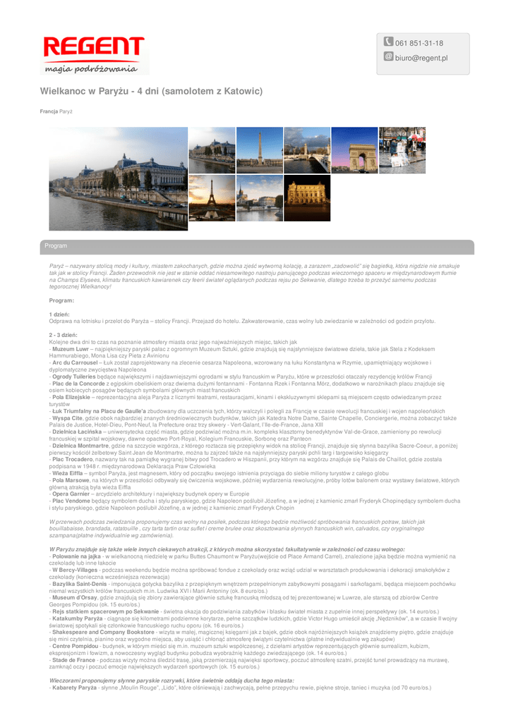 061 851-31-18 [email protected] Wielkanoc w Paryżu - 4 dni (samolotem z Katowic) Francja Paryż Program Paryż – nazywany stolicą mody i kultury, miastem zakochanych, gdzie można zjeść wytworną kolację, a zarazem „zadowolić” się bagietką, która nigdzie nie smakuje tak jak w stolicy Francji. Żaden przewodnik nie jest w stanie oddać niesamowitego nastroju panującego podczas wieczornego spaceru w międzynarodowym tłumie na Champs Elysees, klimatu francuskich kawiarenek czy feerii świateł oglądanych podczas rejsu po Sekwanie, dlatego trzeba to przeżyć samemu podczas tegorocznej Wielkanocy! Program: 1 dzień: Odprawa na lotnisku i przelot do Paryża – stolicy Francji. Przejazd do hotelu. Zakwaterowanie, czas wolny lub zwiedzanie w zależności od godzin przylotu. 2 - 3 dzień: Kolejne dwa dni to czas na poznanie atmosfery miasta oraz jego najważniejszych miejsc, takich jak - Muzeum Luwr – najpiękniejszy paryski pałac z ogromnym Muzeum Sztuki, gdzie znajdują się najsłynniejsze światowe dzieła, takie jak Stela z Kodeksem Hammurabiego, Mona Lisa czy Pieta z Avinionu - Arc du Carrousel – Łuk został zaprojektowany na zlecenie cesarza Napoleona, wzorowany na łuku Konstantyna w Rzymie, upamiętniający wojskowe i dyplomatyczne zwycięstwa Napoleona - Ogrody Tuileries będące największymi i najdawniejszymi ogrodami w stylu francuskim w Paryżu, które w przeszłości otaczały rezydencję królów Francji - Plac de la Concorde z egipskim obeliskiem oraz dwiema dużymi fontannami - Fontanna Rzek i Fontanna Mórz, dodatkowo w narożnikach placu znajduje się osiem kobiecych posągów będących symbolami głównych miast francuskich - Pola Elizejskie – reprezentacyjna aleja Paryża z licznymi teatrami, restauracjami, kinami i ekskluzywnymi sklepami są miejscem często odwiedzanym przez turystów - Łuk Triumfalny na Placu de Gaulle'a zbudowany dla uczczenia tych, którzy walczyli i polegli za Francję w czasie rewolucji francuskiej i wojen napoleońskich - Wyspa Cite, gdzie obok najbardziej znanych średniowiecznych budynków, takich jak Katedra Notre Dame, Sainte Chapelle, Conciergerie, można zobaczyć także Palais de Justice, Hotel-Dieu, Pont-Neuf, la Prefecture oraz trzy skwery - Vert-Galant, l’Ile-de-France, Jana XIII - Dzielnica Łacińska – uniwersytecka część miasta, gdzie podziwiać można m.in. kompleks klasztorny benedyktynów Val-de-Grace, zamieniony po rewolucji francuskiej w szpital wojskowy, dawne opactwo Port-Royal, Kolegium Francuskie, Sorbonę oraz Panteon - Dzielnica Montmartre, gdzie na szczycie wzgórza, z którego roztacza się przepiękny widok na stolicę Francji, znajduje się słynna bazylika Sacre-Coeur, a poniżej pierwszy kościół żelbetowy Saint Jean de Montmartre, można tu zajrzeć także na najsłynniejszy paryski pchli targ i targowisko księgarzy - Plac Trocadero, nazwany tak na pamiątkę wygranej bitwy pod Trocadero w Hiszpanii, przy którym na wzgórzu znajduje się Palais de Chaillot, gdzie została podpisana w 1948 r. międzynarodowa Deklaracja Praw Człowieka - Wieża Eiffla – symbol Paryża, jest magnesem, który od początku swojego istnienia przyciąga do siebie miliony turystów z całego globu - Pola Marsowe, na których w przeszłości odbywały się ćwiczenia wojskowe, później wydarzenia rewolucyjne, próby lotów balonem oraz wystawy światowe, których główną atrakcją była wieża Eiffla - Opera Garnier – arcydzieło architektury i największy budynek opery w Europie - Plac Vendome będący symbolem ducha i stylu paryskiego, gdzie Napoleon poślubił Józefinę, a w jednej z kamienic zmarł Fryderyk Chopinędący symbolem ducha i stylu paryskiego, gdzie Napoleon poślubił Józefinę, a w jednej z kamienic zmarł Fryderyk Chopin W przerwach podczas zwiedzania proponujemy czas wolny na posiłek, podczas którego będzie możliwość spróbowania francuskich potraw, takich jak bouillabaisse, brandada, ratatouille , czy tarta tartin oraz suflet i creme brulee oraz skosztowania słynnych francuskich win, calvados, czy oryginalnego szampana(płatne indywidualnie wg zamówienia). W Paryżu znajduje się także wiele innych ciekawych atrakcji, z których można skorzystać fakultatywnie w zależności od czasu wolnego: - Polowanie na jajka - w wielkanocną niedzielę w parku Buttes Chaumont w Paryżu(wejście od Place Armand Carrel), znalezione jajka będzie można wymienić na czekoladę lub inne łakocie - W Bercy-Villages - podczas weekendu będzie można spróbować fondue z czekolady oraz wziąć udział w warsztatach produkowania i dekoracji smakołyków z czekolady (konieczna wcześniejsza rezerwacja) - Bazylika Saint-Denis - imponująca gotycka bazylika z przepięknym wnętrzem przepełnionym zabytkowymi posągami i sarkofagami, będąca miejscem pochówku niemal wszystkich królów francuskich m.in. Ludwika XVI i Marii Antoniny (ok. 8 euro/os.) - Museum d’Orsay, gdzie znajdują się zbiory zawierające głównie sztukę francuską młodszą od tej prezentowanej w Luwrze, ale starszą od zbiorów Centre Georges Pompidou (ok. 15 euro/os.) - Rejs statkiem spacerowym po Sekwanie - świetna okazja do podziwiania zabytków i blasku świateł miasta z zupełnie innej perspektywy (ok. 14 euro/os.) - Katakumby Paryża - ciągnące się kilometrami podziemne korytarze, pełne szczątków ludzkich, gdzie Victor Hugo umieścił akcję „Nędzników”, a w czasie II wojny światowej spotykali się członkowie francuskiego ruchu oporu (ok. 16 euro/os.) - Shakespeare and Company Bookstore - wizyta w małej, magicznej księgarni jak z bajek, gdzie obok najróżniejszych książek znajdziemy piętro, gdzie znajduje się mini czytelnia, pianino oraz wygodne miejsca, aby usiąść i chłonąć atmosferę świątyni czytelnictwa (płatne indywidualnie wg zakupów) - Centre Pompidou - budynek, w którym mieści się m.in. muzeum sztuki współczesnej, z dziełami artystów reprezentujących główni