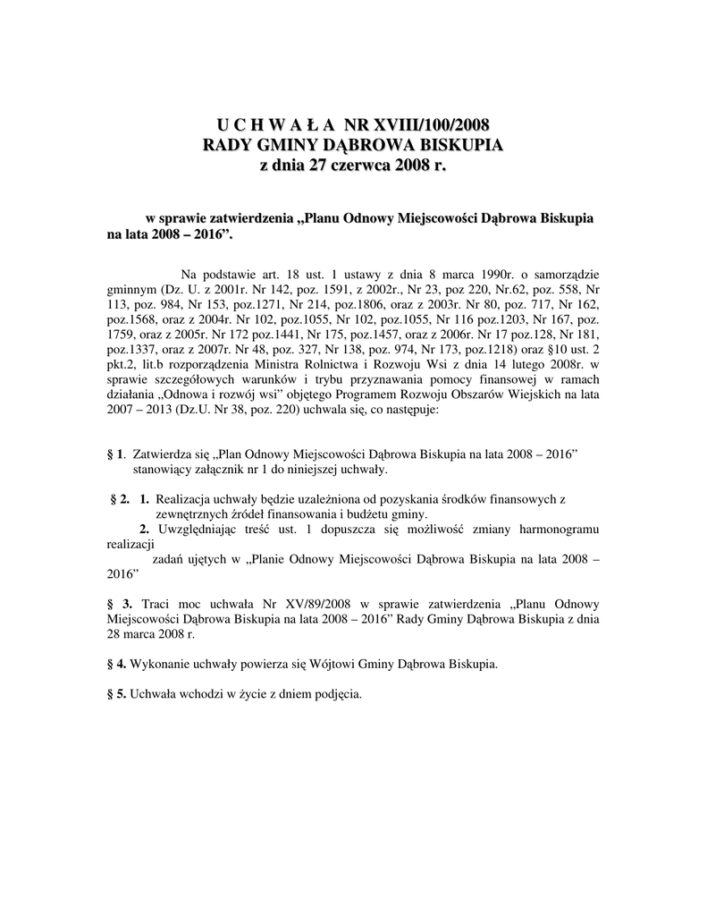 U C H W A Ł A NR XVIII/100/2008 RADY GMINY DĄBROWA BISKUPIA z dnia 27 czerwca 2008 r. w sprawie zatwierdzenia „Planu Odnowy Miejscowości Dąbrowa Biskupia na lata 2008 – 2016”. Na podstawie art. 18 ust. 1 ustawy z dnia 8 marca 1990r. o samorządzie gminnym (Dz. U. z 2001r. Nr 142, poz. 1591, z 2002r., Nr 23, poz 220, Nr.62, poz. 558, Nr 113, poz. 984, Nr 153, poz.1271, Nr 214, poz.1806, oraz z 2003r. Nr 80, poz. 717, Nr 162, poz.1568, oraz z 2004r. Nr 102, poz.1055, Nr 102, poz.1055, Nr 116 poz.1203, Nr 167, poz. 1759, oraz z 2005r. Nr 172 poz.1441, Nr 175, poz.1457, oraz z 2006r. Nr 17 poz.128, Nr 181, poz.1337, oraz z 2007r. Nr 48, poz. 327, Nr 138, poz. 974, Nr 173, poz.1218) oraz §10 ust. 2 pkt.2, lit.b rozporządzenia Ministra Rolnictwa i Rozwoju Wsi z dnia 14 lutego 2008r. w sprawie szczegółowych warunków i trybu przyznawania pomocy finansowej w ramach działania „Odnowa i rozwój wsi” objętego Programem Rozwoju Obszarów Wiejskich na lata 2007 – 2013 (Dz.U. Nr 38, poz. 220) uchwala się, co następuje: § 1. Zatwierdza się „Plan Odnowy Miejscowości Dąbrowa Biskupia na lata 2008 – 2016” stanowiący załącznik nr 1 do niniejszej uchwały. § 2. 1. Realizacja uchwały będzie uzależniona od pozyskania środków finansowych z zewnętrznych źródeł finansowania i budżetu gminy. 2. Uwzględniając treść ust. 1 dopuszcza się możliwość zmiany harmonogramu realizacji zadań ujętych w „Planie Odnowy Miejscowości Dąbrowa Biskupia na lata 2008 – 2016” § 3. Traci moc uchwała Nr XV/89/2008 w sprawie zatwierdzenia „Planu Odnowy Miejscowości Dąbrowa Biskupia na lata 2008 – 2016” Rady Gminy Dąbrowa Biskupia z dnia 28 marca 2008 r. § 4. Wykonanie uchwały powierza się Wójtowi Gminy Dąbrowa Biskupia. § 5. Uchwała wchodzi w życie z dniem podjęcia. Uzasadnienie do Uchwały Nr XVIII/100/2008 Rady Gminy Dąbrowa Biskupia z dnia 27 czerwca 2008 r. W związku z wdrożeniem przez Urząd Marszałkowski w Toruniu Programu Rozwoju Obszarów Wiejskich na lata 2007 – 2013 Działania „Odnowa i Rozwój Wsi”, podjęto działania zmierzające do ubiegania się o środki finansowe z powyższego programu. Opracowany został „Plan Odnowy Miejscowości Dąbrowa Biskupia na lata 2008 – 2016”, który w swej treści zawiera przedsięwzięcia na rzecz poprawy warunków jakości życia mieszkańców miejscowości Dąbrowa Biskupia. Stopień realizacji „ Planu…” będzie uzależniony przede wszystkim od przyznanych środków finansowych ze źródeł zewnętrznych np.: w ramach działania Odnowa i rozwój wsi” objętego Programem Rozwoju Obszarów Wiejskich na lata 2007 – 2013, a także z budżetu gminy. Dopuszcza się możliwość zmiany harmonogramu realizacji zadań ujętych w „Planie Odnowy Miejscowości Dąbrowa Biskupia na lata 2008 – 2016” w zależności od warunków współfinansowania ze źródeł zewnętrznych. W związku z ubieganiem się o dofinansowanie w ramach działania Odnowa i rozwój wsi” objętego Programem Rozwoju Obszarów Wiejskich na lata 2007 – 2013 niezbędne jest przyjęcie opracowanego przez grupę odnowy miejscowości i zatwierdzonego uchwałą zebrania wiejskiego „Planów Odnowy Miejscowości”. Załącznik Nr 1 do Uchwały Nr XVIII/100/2008 Rady Gminy Dąbrowa Biskupia z dnia 27 czerwca 2008 r. PLAN ODNOWY MIEJSCOWOŚCI DĄBROWA BISKUPIA 2008 – 2016 Dąbrowa Biskupia marzec 2008r. Spis treści: 1. Charakterystyka miejscowości. 2. Inwentaryzacja zasobów służących odnowie miejscowości Dąbrowa Biskupia. a) Arkusz 1: Analiza zasobów miejscowości Dąbrowa Biskupia 3. Ocena mocnych i słabych stron miejscowości Dąbrowa Biskupia. 4. Wizja odnowy miejscowości Dąbrowa Biskupia a) Arkusz 2: Jacy jesteśmy?– Diagnoza aktualnej sytuacji naszej wsi. b) Arkusz 3: Wizja stanu docelowego 5. Planowane zadania inwestycyjne i przedsięwzięcia aktywizujące społeczność miejscowości Dąbrowa Biskupia. 6. Harmonogram wdrażania Planu Odnowy Miejscowości Dąbrowa Biskupia. 7. Szacunkowy kosztorys. 1. Charakterystyka miejscowości. Wieś: Dąbrowa Biskupia, nr terytorialny 4050702205 Pradzieje Pierwsze ślady osadnictwa pochodzą ze schyłku starszej epoki kamienia i początku mezolitu (około 8000 p.n.e.). W młodszej epoce kamienia pojawiła się ludność kultur cyklu wstęgowego (około 4500-2800 p.n.e.) oraz kultury pucharów lejkowatych. Odkryto dwie osady ludności tej kultury: starszą z około 2900-2800 p.n.e. i młodszą z około 2500-2400 p.n.e. Ujawniono dwie strefy zasiedlenia: mieszkalną, składającą się głównie z niewielkich rozmiarów budowli typu szałasowego, które są interpretowane jako relikty wielokrotnych i krótkotrwałych miejsc pobytu ludności tej kultury oraz strefą przydomowej działalności gospodarczej, w skład, której wchodził m.in. warsztat kamieniarski. Unikalnym odkryciem z młodszej epoki kamienia jest piec garncarski. Badania archeologiczne przyniosły także odkrycie bogatego zespołu grobowego ludności kultury późnej ceramiki sznurowej (około 1800-1750 p.n.e.). W skład wyposażenia grobu wchodziły: 2 naczynia, topór kamienny, wisior bursztynowy oraz 20 grocików strzał do łuku. W epoce brązu pojawiła się ludność kultury łużyckiej ( 1200/1100-250 p.n.e.). Z epoki żelaza znane są znaleziska zabytków kultury przeworskiej ( II w. p.n.e.- V w. n.e.). Nazewnictwo Wieś występuje w źródłach pod nazwą: Dąbrowa, niem. Luisenfelde (Louisenfelde). Rys historyczny Obszar obecnej wsi był porośnięty dąbrową, tzn. krzewami i chrustami, między którymi spotyka się pojedyncze dęby. Teren ten był w średniowieczu własnością biskupstwa włocławskiego. Wykorzystywali go mieszkańcy okolicznych wsi np. do hodowli drobiu, za co musieli składać świadczenia w naturze biskupowi włocławskiemu. Znaleziska ceramiki średniowiecznej wskazują, że na tym terenie w średniowieczu mogły istnieć nietrwałe siedliska związane z sezono