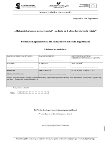 Matematyka kodem nowoczesności Załącznik nr 1 do Regulaminu „Matematyka kodem nowoczesności” - zadanie nr 4 „Przedsiębiorczość i staże” Formularz zgłoszeniowy dla kandydatów na staże zagraniczne I. Informacje o kandydacie: IMIĘ I NAZWISKO KANDYDATA: DATA URODZENIA: ................................................................ ........................................................ WYDZIAŁ: KIERUNEK: SPECJALNOŚĆ: ................................................................ ................................................................ ................................................................ STUDENT ROK STUDIÓW: PLANOWANY TERMIN STAŻU STUDIA STACJONARNE ................................................................ ……………………………………………. ORZECZENIE O STOPNIU NIEPEŁNOSPRAWNOŚCI (TAK/NIE*) Średnia ocen końcowych z modułów ustalona na ostatniej, poprzedzającej spotkanie Komisji, liście stypendialnej (rankingowej) - zgodnie z § 3 ust. 6 pkt 1 „Regulaminu organizacji staży (…)” …………………………………………………………………………………………………………………………. * niepotrzebne skreślić PESEL: II. Potwierdzenie powyższych danych przez dziekanat Potwierdzam prawdziwość podanych danych Projekt współfinansowany ze środków Unii Europejskiej w ramach Europejskiego Funduszu Społecznego Strona1 ………………………………… pieczęć i podpis pracownika dziekanatu Matematyka kodem nowoczesności III. Dane kontaktowe kandydata TELEFON KOMÓRKOWY: E-MAIL: -- ADRES ZAMIESZKANIA: ……………………………………………………………………………………………. IV. Oświadczenia kandydata 1. Oświadczenie o znajomości języka angielskiego w skali 1 do 5, gdzie 5 oznacza biegłą znajomość ……………………………………………………………………………………………………………………….. 2. Oświadczam, że zapoznałem(-am) się i zobowiązuję się do przestrzegania postanowień Regulaminu organizacji staży zagranicznych w ramach Projektu pt. „Matematyka kodem nowoczesności” zadanie nr 4 „Przedsiębiorczość i staże”. …………………………………………………… podpis kandydata Wyrażam zgodę na przetwarzanie moich danych osobowych dla potrzeb niezbędnych do realizacji procesu naboru na staże, zgodnie z przepisami ustawy z dnia 29 sierpnia 1997 r. o ochronie danych osobowych (tekst jednolity Dz. U. z 2002 r. Nr 101, poz. 926, z późn. zm.). Powyższe dane osobowe podaję dobrowolnie. Oświadczam, że zostałem poinformowany o prawie dostępu do treści podanych danych osobowych oraz ich poprawiania. ……………………………………………….. podpis kandydata V. Załączniki 1. Certyfikat potwierdzający znajomość języka angielskiego, jeśli kandydat posiada □ Strona2 2. Proponowany program stażu □ Projekt współfinansowany ze środków Unii Europejskiej w ramach Europejskiego Funduszu Społecznego