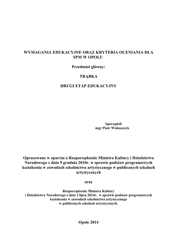WYMAGANIA EDUKACYJNE ORAZ KRYTERIA OCENIANIA DLA SPM W OPOLU Przedmiot główny: TRĄBKA DRUGI ETAP EDUKACYJNY Sporządził mgr Piotr Waloszczyk Opracowane w oparciu o Rozporządzenie Ministra Kultury i Dziedzictwa Narodowego z dnia 9 grudnia 2010r. w sprawie podstaw programowych kształcenia w zawodach szkolnictwa artystycznego w publicznych szkołach artystycznych oraz Rozporządzenie Ministra Kultury i Dziedzictwa Narodowego z dnia 2 lipca 2014r. w sprawie podstaw programowych kształcenia w zawodach szkolnictwa artystycznego w publicznych szkołach artystycznych. Opole 2014 Wymagania edukacyjne dla klasy trąbki PSM II stopnia w Opolu 1. Doskonalenie gry na instrumencie Uczeń utrwala i rozwija umiejętności gry na instrumencie. 2. Kształcenie umiejętności samodzielnej pracy Uczeń odpowiedzialnie wykorzystuje czas przeznaczony na pracę z instrumentem. Przygotowuje i wykonuje dzieła muzyczne, zgodnie z kanonami stylu i formy muzycznej. 3. Kształcenie rozwoju i przygotowanie do aktywnego udziału w życiu muzycznym Uczeń występuje publicznie jako solista i kameralista. Posiada umiejętność pracy w dużym zespole wykonawczym. Jest świadomym odbiorcą sztuki. Wykorzystuje techniki informacyjne i komunikacyjne w procesie kształcenia i własnego rozwoju artystycznego. 4. Przygotowanie do kontynuowania nauki na poziomie akademickim. Uczeń jest przygotowany merytorycznie do podjęcia dalszej nauki na poziomie akademickim oraz czynnego uczestnictwa w życiu muzycznym. 5. Udział w przesłuchaniach CEA odbywających się co dwa lata, do których typuje szkoła. 6. Obowiązkowy udział w koncertach szkolnych, audycjach sekcyjnych i klasowych i przesłuchaniach co najmniej raz w każdym semestrze. Uczniom wyjątkowo zdolnym pedagog ma prawo rozszerzyć wymagania edukacyjne o elementy wykraczające poza wymagania przewidziane dla realizowanej przez ucznia klasy. KL. I Zadania techniczno – wykonawcze Semestr I • • • • • • • • poznanie historia trąbki – uczniowie rozpoczynający naukę poznanie sposobów konserwacji i użytkowania instrumentu – uczniowie rozpoczynający naukę omówienie i korekty dotyczące zadęcia, oddechu, postawy, układu rąk w zależności od stopnia zaawansowania ucznia i potrzeby przeprowadzenia koniecznych zmian. opanowanie skali do g2. kształtowanie prawidłowego oddechu i dźwięku. opanowanie gam do 4 znaków (tercje, pasaż, D7) ćwiczenia i etiudy w semestrze (5-15) umiejętność strojenia do fortepianu • • utwory z towarzyszeniem fortepianu udział w audycji klasowej (omówienie mocnych i słabych stron w grze poszczególnych uczniów przez nauczyciela, próba samooceny dokonywana przez uczniów, ocena współpracy z akompaniatorem Semestr II • • • • • • • • korekty dotyczące zadęcia, oddechu, postawy, układu rąk w zależności od stopnia zaawansowania ucznia i potrzeby przeprowadzenia koniecznych zmian. opanowanie skali do g2. kształtowanie prawidłowego oddechu i dźwięku. opanowanie gam do 4 znaków (tercje, pasaż, D7) ćwiczenia i etiudy w semestrze (5-15) umiejętność strojenia do fortepianu utwory z towarzyszeniem fortepianu udział w audycji klasowej (omówienie mocnych i słabych stron w grze poszczególnych uczniów przez nauczyciela, próba samooceny dokonywana przez uczniów, ocena współpracy z akompaniatorem Program przesłuchania śródrocznego: • • • • • Przygotowana gama durowa i mollowa. Jedna przygotowana wcześniej etiuda Jedna etiuda wylosowana spośród przerobionych Utwór z towarzyszeniem fortepianu gra a vista Program egzaminu promocyjnego: • • • • • Przygotowana gama durowa i mollowa. Jedna przygotowana wcześniej etiuda Jedna etiuda wylosowana spośród przerobionych Utwór z towarzyszeniem fortepianu gra a vista KL. II Zadania techniczno - wykonawcze Semestr I • • • • • • opanowanie wdechu i wydechu przez ustnik instrumentu basing ćwiczenia na rozgrywanie ćwiczenia wyrabiające biegłość palców doskonalenie czytania nut praca nad rytmem, intonacją, artykulacją • • • • • granie duetów rozwijanie umiejętności gry pamięciowej poszerzenie skali (drugi rok nauki) gamy do 4 znaków (tercje, kwarty, pasaż, D7, pasaże w przewrotach) etiudy i ćwiczenia w semestrze (5-15) • udział ucznia w popisie klasy lub popisie szkolnym (minimum jeden raz w semestrze) Semestr II • • • • • • • • • • • opanowanie wdechu i wydechu przez ustnik instrumentu basing ćwiczenia na rozgrywanie ćwiczenia wyrabiające biegłość palców doskonalenie czytania nut praca nad rytmem, intonacją, artykulacją granie duetów rozwijanie umiejętności gry pamięciowej poszerzenie skali (drugi rok nauki) gamy do 4 znaków (tercje, kwarty, pasaż, D7, pasaże w przewrotach) etiudy i ćwiczenia w semestrze (5-15) • udział ucznia w popisie klasy lub popisie szkolnym (minimum jeden raz w semestrze) Program przesłuchania śródrocznego: • • • • • Przygotowana gama durowa i mollowa. Jedna przygotowana wcześniej etiuda Jedna etiuda wylosowana spośród przerobionych Utwór z towarzyszeniem fortepianu – co najmniej jedna część utworu cyklicznego oraz utwór dowolny gra a vista Program egzaminu promocyjnego: • • • • • Przygotowana gama durowa i mollowa. Jedna przygotowana wcześniej etiuda Jedna etiuda wylosowana spośród przerobionych Utwór z towarzyszeniem fortepianu – co najmniej jedna część utworu cyklicznego oraz utwór dowolny gra a vista KL.III Zadania techniczno – wykonawcze Semestr I *opanowanie ćwiczeń oddechowych *basing *ćwiczenia na rozgrywanie *ozdobniki: tryl, mordent, przednutka *ćwiczenia wyrabiające biegłość palców *stopniowanie dynamiki *zagadnienia interpretacji utworów *rozwijanie umiejętności gry z akompaniamentem *rozwijanie gry pamięciowej *opanowanie skali do b dwukreślnego *praca nad intonacja i artykulacją *gamy do 7 znaków (tercje, kwarty, kwinty, pasaż, D7
