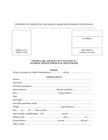 UNIWERSYTET MEDYCZNY IM. KAROLA MARCINKOWSKIEGO W POZNANIU --------------------------------------nr albumu zdjęcie 2 szt. format 35x45 --------------------------------------data wpływu wypełnia uczelnia FORMULARZ APLIKACYJNY SŁUCHACZA STUDIÓW PODYPLOMOWYCH ARTETERAPII Podanie Proszę o przyjęcie na Studia Podyplomowe ……………. edycja ………………………….. Ankieta osobowa Imiona………………………………………………………………………………………. Nazwisko……………………………………………………………………..…………….. Nazwisko panieńskie……………………………………………………………………….. Data urodzenia……………………………………Miejsce urodzenia……………………… Kraj………………………………………………….Województwo……………………….. Imię ojca/matki…………………………………………………………………………………… Nazwisko panieńskie matki…………………………………………………………………. PESEL………………………………………………….Obywatelstwo……………………… Płeć…….K……..M…….Stan cywilny………………………………………………………… Adres stałego zameldowania: kod…………………..…poczta……………………………… Miejscowość………………………………………………ulica……………………nr……… Województwo…………………………………….. tel.dom ………………… tel.kom……… Adres e-mail………………………………………………………………………………… Adres korespondencyjny: kod…………………..…poczta…………………………………. Miejscowość………………………………………………ulica……………………nr……… Ukończona wyższa uczelnia Nazwa uczelni………………………………………………………….……………………… Miejscowość…………………………………………………………………………………… Kierunek………………………………………………………………………………………… Specjalność…………………………………………………………………………………… Data ukończenia………………………………………………………………………………… Do podania załączam: Rodzaj dokumentu Potwierdzenie złożenia Pokwitowanie odbioru Odpis lub poświadczona przez uczelnię kserokopia dyplomu ukończenia studiów Oświadczenie dot. zapoznania się z Regulaminem Studiów Podyplomowych Uniwersytetu Medycznego im. Karola Marcinkowskiego w Poznaniu oraz akceptacji warunków płatności za studia Poświadczona przez uczelnię kopia dowodu osobistego lub innego dokumentu potwierdzającego tożsamość kandydata 2 aktualne fotografie kandydata (35 mm x 45mm) Prawidłowość danych zawartych w ankiecie potwierdzam własnoręcznym podpisem, akceptuje warunki przyjęcia na studia podyplomowe oraz zobowiązuję się wypełniać ankiety związane z oceną jakości zajęć dydaktycznych prowadzonych w ramach studiów podyplomowych. ------------------------------------------------miejscowość i data --------------------------------------------------podpis kandydata