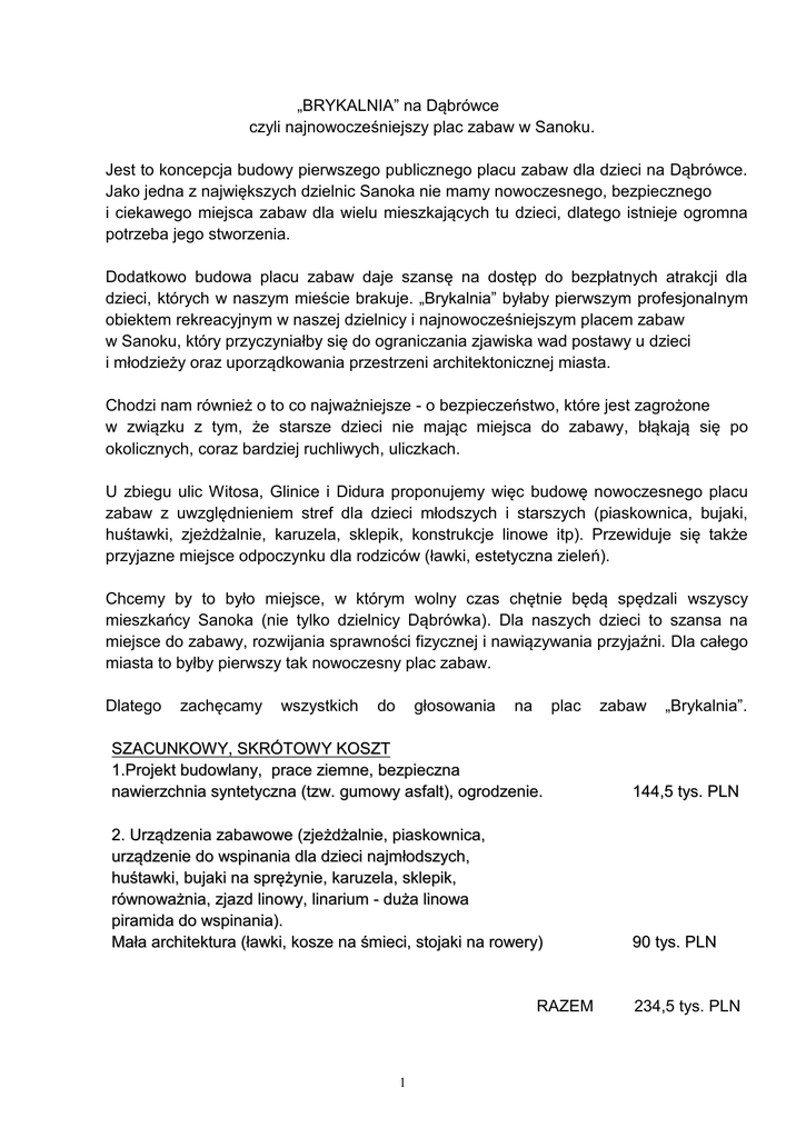 „BRYKALNIA” na Dąbrówce czyli najnowocześniejszy plac zabaw w Sanoku. Jest to koncepcja budowy pierwszego publicznego placu zabaw dla dzieci na Dąbrówce. Jako jedna z największych dzielnic Sanoka nie mamy nowoczesnego, bezpiecznego i ciekawego miejsca zabaw dla wielu mieszkających tu dzieci, dlatego istnieje ogromna potrzeba jego stworzenia. Dodatkowo budowa placu zabaw daje szansę na dostęp do bezpłatnych atrakcji dla dzieci, których w naszym mieście brakuje. „Brykalnia” byłaby pierwszym profesjonalnym obiektem rekreacyjnym w naszej dzielnicy i najnowocześniejszym placem zabaw w Sanoku, który przyczyniałby się do ograniczania zjawiska wad postawy u dzieci i młodzieży oraz uporządkowania przestrzeni architektonicznej miasta. Chodzi nam również o to co najważniejsze - o bezpieczeństwo, które jest zagrożone w związku z tym, że starsze dzieci nie mając miejsca do zabawy, błąkają się po okolicznych, coraz bardziej ruchliwych, uliczkach. U zbiegu ulic Witosa, Glinice i Didura proponujemy więc budowę nowoczesnego placu zabaw z uwzględnieniem stref dla dzieci młodszych i starszych (piaskownica, bujaki, huśtawki, zjeżdżalnie, karuzela, sklepik, konstrukcje linowe itp). Przewiduje się także przyjazne miejsce odpoczynku dla rodziców (ławki, estetyczna zieleń). Chcemy by to było miejsce, w którym wolny czas chętnie będą spędzali wszyscy mieszkańcy Sanoka (nie tylko dzielnicy Dąbrówka). Dla naszych dzieci to szansa na miejsce do zabawy, rozwijania sprawności fizycznej i nawiązywania przyjaźni. Dla całego miasta to byłby pierwszy tak nowoczesny plac zabaw. Dlatego zachęcamy wszystkich do głosowania na plac zabaw „Brykalnia”. SZACUNKOW Y, SKRÓTOW Y KOSZT 1.Projekt budowlany, prace ziemne, bezpieczna nawierzchnia syntetyczna (tzw. gumowy asfalt), ogrodzenie. 144,5 tys. PLN 2. Urządzenia zabawowe (zjeżdżalnie, piaskownica, urządzenie do wspinania dla dzieci najmłodszych, huśtawki, bujaki na sprężynie, karuzela, sklepik, równoważnia, zjazd linowy, linarium - duża linowa piramida do wspinania). Mała architektura (ławki, kosze na śmieci, stojaki na rowery) 90 tys. PLN RAZEM 1 234,5 tys. PLN