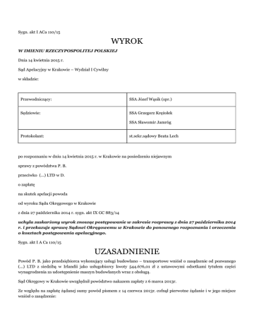 Sygn. akt I ACa 110/15 WYROK W IMIENIU RZECZYPOSPOLITEJ POLSKIEJ Dnia 14 kwietnia 2015 r. Sąd Apelacyjny w Krakowie – Wydział I Cywilny w składzie: Przewodniczący: SSA Józef Wąsik (spr.) Sędziowie: SSA Grzegorz Krężołek SSA Sławomir Jamróg Protokolant: st.sekr.sądowy Beata Lech po rozpoznaniu w dniu 14 kwietnia 2015 r. w Krakowie na posiedzeniu niejawnym sprawy z powództwa P. B. przeciwko (...) LTD w D. o zapłatę na skutek apelacji powoda od wyroku Sądu Okręgowego w Krakowie z dnia 27 października 2014 r. sygn. akt IX GC 883/14 uchyla zaskarżony wyrok znosząc postępowanie w zakresie rozprawy z dnia 27 października 2014 r. i przekazuje sprawę Sądowi Okręgowemu w Krakowie do ponownego rozpoznania i orzeczenia o kosztach postępowania apelacyjnego. Sygn. akt I A Ca 110/15 UZASADNIENIE Powód P. B. jako przedsiębiorca wykonujący usługi budowlano – transportowe wniósł o zasądzenie od pozwanego (...) LTD z siedzibą w Irlandii jako usługobiorcy kwoty 544.676,01 zł z ustawowymi odsetkami tytułem części wynagrodzenia za udostępnienie maszyn budowlanych wraz z obsługą. Sąd Okręgowy w Krakowie uwzględnił powództwo nakazem zapłaty z 6 marca 2013r. Ze względu na zapłatę żądanej sumy powód pismem z 14 czerwca 2013r. cofnął pierwotne żądanie i w jego miejsce wniósł o zasądzenie: a/ 298.679,95 zł z ustawowymi odsetkami tytułem wynagrodzenia za udostępnienie maszyn budowlanych z obsługą (za świadczenia nieobjęte pierwotnym żądaniem), b/ 68.970 zł z ustawowymi odsetkami od dnia zmiany powództwa tytułem odsetek od sumy 544.676,01 zł. Ze względu na niemożność doręczenia nakazu w Polsce Sąd postanowieniem z 10 lipca 2013r. uchylił nakaz zapłaty, a postanowieniem z 29 lipca 2013r. umorzył postępowanie w zakresie pierwotnego żądania i zarządzeniem z 29 lipca 2013r. nadał bieg zmienionemu żądaniu. W odpowiedzi na pozew pozwany wniósł o oddalenie powództwa, zarzucając, że: a/ strony umówiły się, że za wynagrodzenie powoda pozwany odpowiada po połowie z (...) S.A., a powód dochodzi części wynagrodzenia obciążającą (...) b/ powód nie wykazał kartami pracy sprzętu potwierdzonymi przez uprawnione osoby spełnienia swoich świadczeń. Pismem z 6 lutego 2014r. pozwany wniósł o zawieszenie postępowania ze względu na ogłoszenie upadłości, co sąd uwzględnił postanowieniem z 4 marca 2014r., którym jednocześnie na podstawie art. 71 i 174 § 2 K.p.c. zniósł postępowanie za okres od ogłoszenia upadłości i ustanowienia zarządcy sądowego (skoro wyłączną zdolność sądową w sprawach dotyczących masy zyskał zarządca sądowy. Po zawarciu przez pozwanego układu sąd na wniosek pozwanego podjął postępowanie postanowieniem z 22 września 2014r. Pozwany jednak wnosił o podjęcie postępowania tylko w celu jego umorzenia, dołączając pełnomocnictwo dla pełnomocników z Kancelarii (...) ściśle ograniczone do złożenia w imieniu pozwanej spółki wniosku o umorzenie postępowania sądowego wszczętego na terenie Rzeczypospolitej Polski przez P. B.. Sąd Okręgowy mimo wskazanego zakresu pełnomocnictwa na rozprawie w dniu 27 października 2014r przeprowadził postępowanie dowodowe, w wyniku którego ustalił, co następuje: Umową nr (...) z 20 stycznia 2011r. [k.38 akt IX.GC.342/13] powód zobowiązał się do świadczenia usług transportowych za wynagrodzeniem wg stawek za przewiezienie 1 m3 kruszywa na odległość 1 km lub wg stawki za godzinę pracy wywrotki. Umowami nr (...) z 6 czerwca 2011r. [k.44 akt GC.342/13], nr (...) z 16 sierpnia 2011r. [k.42 akt GC.342/13] i nr (...) z 3 listopada 2011r. [k.29 akt GC.342/13] powód zobowiązał się do świadczenia pracy sprzętem budowlanym za wynagrodzeniem wg stawek za godzinę pracy i odrębnych za godzinę postoju. We wszystkich umowach - z wyjątkiem umowy nr (...) - jako zamawiający zostały określone cztery spółki tworzące konsorcjum reprezentowane przez pozwanego i (...) S.A. i tylko przedstawiciele tych ostatnich spółek podpisali umowy. Wszystkie umowy przewidywały zapłatę wynagrodzenia z rachunku lidera konsorcjum, tj. (...) S.A., w imieniu (...) i pozwanego (§ 5.9 tych umów). Natomiast w umowie nr (...) zamawiającym był pozwany jako lider konsorcjum i (...) S.A. We wszystkich umowach - w tym w umowie nr (...) - powód zobowiązał się do wystawiania na każde wynagrodzenie dwóch faktur, z których każda miała obejmować połowę wynagrodzenia: jedną na (...) i drugą na pozwanego (§ 6.3 umowy nr (...) i § 5.8 pozostałych umów. Powód zgodnie z umową wystawiał na każde wynagrodzenie dwie faktury po 50%. Sąd uznał, że praca koparki, walca itp. sprzętu budowlanego jest świadczeniem niepodzielnym. Sprzęt ten nie pracował połowy godzin dla (...) i połowy dla pozwanego. To samo dotyczy kruszywa. Każdy transport kruszywa był dla obydwu zamawiających. Dlatego co do zasady (...) i pozwany na podstawie art. 380 § 2 K.c. solidarnie odpowiadają za wynagrodzenie powoda. Jednakże przepis wyraźnie przewiduje możliwość zawarcia odmiennej umowy. Przewidując odrębne faktury po 50% strony przewidziały, iż za połowę wynagrodzenia odpowiada (...), a za połowę pozwany. Połowy wynagrodzenia należnej od pozwanego powód dochodził w sprawie IX.GC.342/13. W niniejszej sprawie powód dochodził połowy wynagrodzenia należnej od (...), a skoro pozwany na mocy powołanych wyżej umów nie odpowiada za tę połowę, powództwo zostało oddalone. Wg. pozwanego skutkiem zawarcia przez pozwanego układu powinno być umorzenie postępowania. Jednakże niniejszy proces został wszczęty przed wszczęciem postępowania upadłościowego pozwanego, co nie jest przeszkodą do kontynuacji niniejszego postępowania. W ocenie Sądu I Instancji, strona może pozbawić pełnomocnika prawa do niektórych czynności określonych zgodnie z art. 91 k.p.c., lecz nie może żądać dokonywania części doręczeń sobi