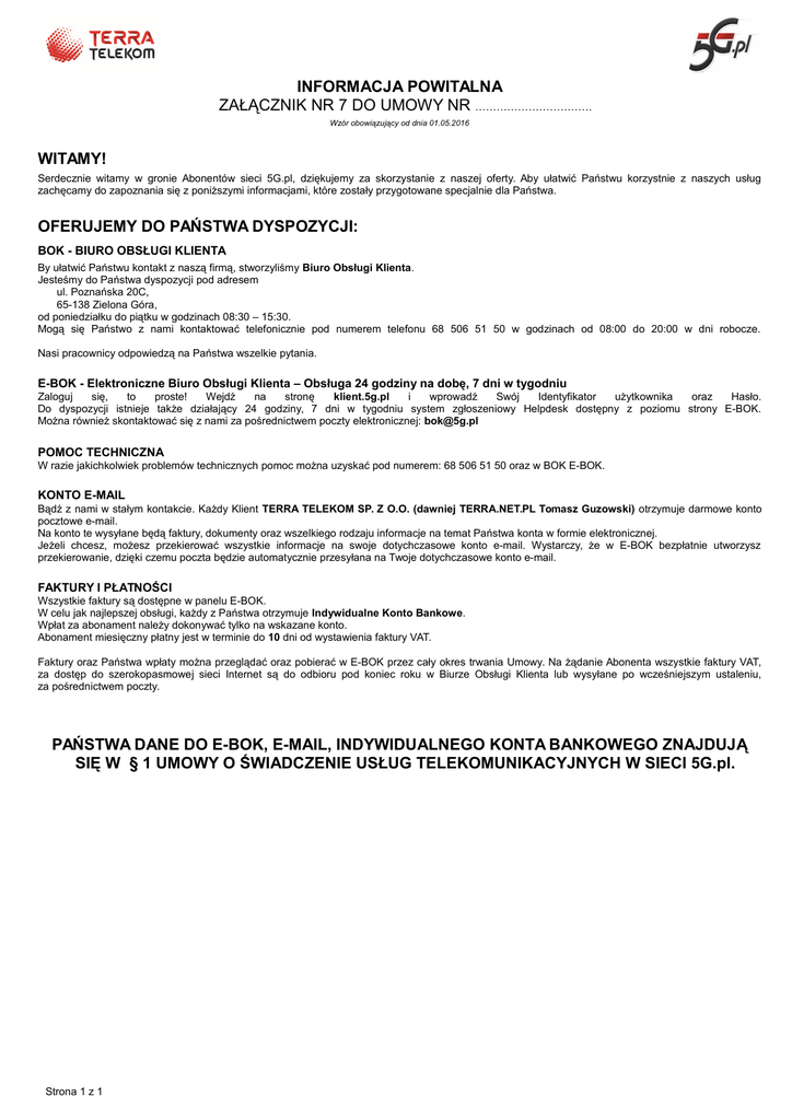 INFORMACJA POWITALNA ZAŁĄCZNIK NR 7 DO UMOWY NR …………………………… Wzór obowiązujący od dnia 01.05.2016 WITAMY! Serdecznie witamy w gronie Abonentów sieci 5G.pl, dziękujemy za skorzystanie z naszej oferty. Aby ułatwić Państwu korzystnie z naszych usług zachęcamy do zapoznania się z poniższymi informacjami, które zostały przygotowane specjalnie dla Państwa. OFERUJEMY DO PAŃSTWA DYSPOZYCJI: BOK - BIURO OBSŁUGI KLIENTA By ułatwić Państwu kontakt z naszą firmą, stworzyliśmy Biuro Obsługi Klienta. Jesteśmy do Państwa dyspozycji pod adresem ul. Poznańska 20C, 65-138 Zielona Góra, od poniedziałku do piątku w godzinach 08:30 – 15:30. Mogą się Państwo z nami kontaktować telefonicznie pod numerem telefonu 68 506 51 50 w godzinach od 08:00 do 20:00 w dni robocze. Nasi pracownicy odpowiedzą na Państwa wszelkie pytania. E-BOK - Elektroniczne Biuro Obsługi Klienta – Obsługa 24 godziny na dobę, 7 dni w tygodniu Zaloguj się, to proste! Wejdź na stronę klient.5g.pl i wprowadź Swój Identyfikator użytkownika oraz Hasło. Do dyspozycji istnieje także działający 24 godziny, 7 dni w tygodniu system zgłoszeniowy Helpdesk dostępny z poziomu strony E-BOK. Można również skontaktować się z nami za pośrednictwem poczty elektronicznej: [email protected] POMOC TECHNICZNA W razie jakichkolwiek problemów technicznych pomoc można uzyskać pod numerem: 68 506 51 50 oraz w BOK E-BOK. KONTO E-MAIL Bądź z nami w stałym kontakcie. Każdy Klient TERRA TELEKOM SP. Z O.O. (dawniej TERRA.NET.PL Tomasz Guzowski) otrzymuje darmowe konto pocztowe e-mail. Na konto te wysyłane będą faktury, dokumenty oraz wszelkiego rodzaju informacje na temat Państwa konta w formie elektronicznej. Jeżeli chcesz, możesz przekierować wszystkie informacje na swoje dotychczasowe konto e-mail. Wystarczy, że w E-BOK bezpłatnie utworzysz przekierowanie, dzięki czemu poczta będzie automatycznie przesyłana na Twoje dotychczasowe konto e-mail. FAKTURY I PŁATNOŚCI Wszystkie faktury są dostępne w panelu E-BOK. W celu jak najlepszej obsługi, każdy z Państwa otrzymuje Indywidualne Konto Bankowe. Wpłat za abonament należy dokonywać tylko na wskazane konto. Abonament miesięczny płatny jest w terminie do 10 dni od wystawienia faktury VAT. Faktury oraz Państwa wpłaty można przeglądać oraz pobierać w E-BOK przez cały okres trwania Umowy. Na żądanie Abonenta wszystkie faktury VAT, za dostęp do szerokopasmowej sieci Internet są do odbioru pod koniec roku w Biurze Obsługi Klienta lub wysyłane po wcześniejszym ustaleniu, za pośrednictwem poczty. PAŃSTWA DANE DO E-BOK, E-MAIL, INDYWIDUALNEGO KONTA BANKOWEGO ZNAJDUJĄ SIĘ W § 1 UMOWY O ŚWIADCZENIE USŁUG TELEKOMUNIKACYJNYCH W SIECI 5G.pl. Strona 1 z 1
