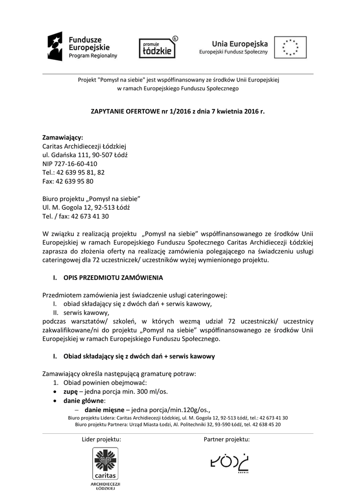 Projekt "Pomysł na siebie" jest współfinansowany ze środków Unii Europejskiej w ramach Europejskiego Funduszu Społecznego ZAPYTANIE OFERTOWE nr 1/2016 z dnia 7 kwietnia 2016 r. Zamawiający: Caritas Archidiecezji Łódzkiej ul. Gdańska 111, 90-507 Łódź NIP 727-16-60-410 Tel.: 42 639 95 81, 82 Fax: 42 639 95 80 Biuro projektu „Pomysł na siebie” Ul. M. Gogola 12, 92-513 Łódź Tel. / fax: 42 673 41 30 W związku z realizacją projektu „Pomysł na siebie” współfinansowanego ze środków Unii Europejskiej w ramach Europejskiego Funduszu Społecznego Caritas Archidiecezji Łódzkiej zaprasza do złożenia oferty na realizację zamówienia polegającego na świadczeniu usługi cateringowej dla 72 uczestniczek/ uczestników wyżej wymienionego projektu. I. OPIS PRZEDMIOTU ZAMÓWIENIA Przedmiotem zamówienia jest świadczenie usługi cateringowej: I. obiad składający się z dwóch dań + serwis kawowy, II. serwis kawowy, podczas warsztatów/ szkoleń, w których wezmą udział 72 uczestniczki/ uczestnicy zakwalifikowane/ni do projektu „Pomysł na siebie” współfinansowanego ze środków Unii Europejskiej w ramach Europejskiego Funduszu Społecznego. I. Obiad składający się z dwóch dań + serwis kawowy Zamawiający określa następującą gramaturę potraw: 1. Obiad powinien obejmować: zupę – jedna porcja min. 300 ml/os. danie główne: danie mięsne – jedna porcja/min.120g/os., Biuro projektu Lidera: Caritas Archidiecezji Łódzkiej, ul. M. Gogola 12, 92-513 Łódź, tel.: 42 673 41 30 Biuro projektu Partnera: Urząd Miasta Łodzi, Al. Politechniki 32, 93-590 Łódź, tel. 42 638 45 20 Lider projektu: Partner projektu: Projekt "Pomysł na siebie" jest współfinansowany ze środków Unii Europejskiej w ramach Europejskiego Funduszu Społecznego danie niemięsne – jedna porcja/min.120g/os. (o konieczności przygotowania dania nie mięsnego Wykonawca zostanie poinformowany niezwłocznie po otrzymaniu informacji od Uczestniczki/Uczestnika projektu), dodatki do dań na gorąco – np. ziemniaki gotowane, ziemniaki opiekane, ryż, kluski śląskie – jedna porcja/min.150g/os. dodatek warzywny – np. warzywa blanszowane, surówki, sałaty jedna porcja/min.120g/os., Obiad (pierwsze i drugie danie) powinien być dostarczony w styropianowym jednorazowym opakowaniu. Do niego dołączone powinny być jednorazowe, papierowe serwetki i jednorazowe sztućce (łyżka, widelec, nóż). Obiad powinien być ciepły i dostarczony w dniu i o godzinie określonej przez Wykonawcę (o terminach Zamawiający poinformuje Wykonawcę min. 3 dni przed rozpoczęciem warsztatów/szkoleń). 2. Serwis kawowy (dostępny przez cały czas trwania spotkania) powinien obejmować: kawę (mielona i rozpuszczalna), herbatę (czarna, zielona i owocowa), śmietanka/mleko do kawy, świeża cytryna do herbaty (całe plasterki), cukier w saszetkach (min. 5 g) – bez ograniczeń na uczestnika, woda mineralna niegazowana i gazowana do wyboru w butelkach do 0,5 l (500 ml/os.), ciastka kruche bankietowe min. 3 rodzaje (łącznie min. 100 g/os.), słone przekąski w ilościach min. 100 g/os., bakalie w ilości min. 100 g/os. W ramach serwisu kawowego powinny zostać dostarczone: talerzyki jednorazowe, łyżeczki jednorazowe, kubki styropianowe do gorących napojów, serwetki. Produkty mogą być dostarczone 2 dni wcześniej przed realizacją warsztatów/ szkoleń na miejsce wskazane przez Zamawiającego. II. Serwis kawowy Serwis kawowy, który stanowi drugą część zamówienia dotyczy warsztatów/szkoleń, które będą trwać min. 4 h i powinien obejmować: Biuro projektu Lidera: Caritas Archidiecezji Łódzkiej, ul. M. Gogola 12, 92-513 Łódź, tel.: 42 673 41 30 Biuro projektu Partnera: Urząd Miasta Łodzi, Al. Politechniki 32, 93-590 Łódź, tel. 42 638 45 20 Lider projektu: Partner projektu: Projekt "Pomysł na siebie" jest współfinansowany ze środków Unii Europejskiej w ramach Europejskiego Funduszu Społecznego • kawę (mielona i rozpuszczalna), herbatę (czarna, zielona i owocowa), śmietanka/mleko do kawy, świeża cytryna do herbaty (całe plasterki), cukier w saszetkach (min. 5 g) – bez ograniczeń na uczestnika, • woda mineralna niegazowana i gazowana do wyboru w butelkach do 0,5 l (500 ml/os.), • ciastka kruche bankietowe min. 3 rodzaje (łącznie min. 100 g/os.), • słone przekąski w ilościach łącznie min. 100 g/os., • bakalie w ilości min. 100 g/os. W ramach serwisu kawowego powinny zostać dostarczone: talerzyki jednorazowe, łyżeczki jednorazowe, kubki styropianowe do gorących napojów, serwetki. Produkty mogą być dostarczone 2 dni wcześniej przed realizacją warsztatów/ szkoleń na miejsce wskazane przez Zamawiającego. Warsztaty/szkolenia odbywać się będą w Łodzi, w jednej z trzech podanych lokalizacji (ul. M. Gogola 12; ul. Gdańska 111, Al. Politechniki 32) lub innej o której Wykonawca zostanie poinformowany min. 3 dni przed ich rozpoczęciem. Zamówienie będzie realizowane od maja 2016 r. do marca 2017 r. Zajęcia odbywać się będą od poniedziałku do piątku w godzinach 8:00 – 19:00. Zamawiający przewiduje, że dzienne zamówienie zarówno obiadów jak i produktów potrzebnych do przygotowania przerw kawowych powinno wynosić od 12 do 36 porcji. Maksymalnie w trakcie trwania całego projektu Zamawiający przewiduje możliwość przygotowania 2184 porcji obiadowych i 2616 kawowych. Składając ofertę Oferent zobowiązuje się do: świadczenia usługi cateringowej z wykorzystaniem: świeżych produktów żywnościowych, przyrządzania posiłków obiadowych w dniu świadczenia usług cateringowych, przygotowywania potraw z surowców wysokiej jakości, świeżych, naturalnych, mało przetworzonych, z ograniczoną ilością substancji konserwujących, zagęszczających, barwiących lub sztucznie aromatyzowanych. Posiłki nie mogą być wykonywane z produktów typu instant, np. zupy w proszku i sosy w posiłku oraz produktów gotowych. W p