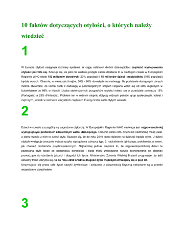 10 faktów dotyczących otyłości, o których należy wiedzieć 1 W Europie otyłość osiągnęła rozmiary epidemii. W ciągu ostatnich dwóch dziesięcioleci częstość występowania otyłości potroiła się. Szacuje się, że jeśli nie zostaną podjęte żadne działania to w niedługim czasie w Europejskim Regionie WHO około 150 milionów dorosłych (20% populacji) i 15 milionów dzieci i nastolatków (10% populacji) będzie otyłych. Obecnie, w większości krajów, 30% - 80% dorosłych ma nadwagę. Na podstawie dostępnych danych można stwierdzić, że liczba osób z nadwagą w poszczególnych krajach Regionu waha się od 28% mężczyzn w Uzbekistanie do 66% w Irlandii. Liczba stwierdzonych przypadków otyłości mieści się w przedziale pomiędzy 13% (Portugalia) a 23% (Finlandia). Problem ten w różnym stopniu dotyczy różnych państw, grup społecznych, kobiet i mężczyzn, jednak w niemalże wszystkich częściach Europy liczba osób otyłych wzrasta. 2 Dzieci w sposób szczególny są zagrożone otyłością. W Europejskim Regionie WHO nadwaga jest najpowszechniej występującym problemem zdrowotnym wieku dziecięcego. Obecnie około 20% dzieci ma nadmierną masę ciała, a jedna trzecia z nich to dzieci otyłe. Szacuje się, że do roku 2010 jedno dziecko na dziesięć będzie otyłe. U dzieci otyłych występuje znacznie wyższe ryzyko wystąpienia cukrzycy typu 2, nadciśnienia tętniczego, problemów ze snem, jak również problemów psychospołecznych. Najbardziej jednak niepokoi to, że najprawdopodobniej dzieci te pozostaną otyłe także po osiągnięciu dorosłości i będą miały zwiększone ryzyko zachorowania na choroby prowadzące do obniżenia jakości i długości ich życia. Ministerstwo Zdrowia Wielkiej Brytanii prognozuje, że jeśli aktualny trend utrzyma się, to do roku 2050 średnia długość życia mężczyzn zmniejszy się o pięć lat. Utrzymujące się przez całe życie nawyki żywieniowe i związane z aktywnością fizyczną nabywane są w przede wszystkim w dzieciństwie. 3 Otyłość jest rezultatem niepożądanego przyrostu masy ciała, spowodowanego dodatnim bilansem energetycznym – spożywaniem większej ilości kalorii niż jest zużywane przez daną osobę. Ludzie otyli mają zwiększone ryzyko rozwoju wielu poważnych schorzeń, takich jak cukrzyca insulinoniezależna (typu 2), choroba wieńcowa, nadciśnienie tętnicze i udary mózgu, choroby pęcherzyka żółciowego, niektóre rodzaje raka (raka endometrium, jajników, piersi, szyjki macicy, prostaty, jelita grubego, pęcherzyka żółciowego, trzustki, wątroby i nerek) oraz pojawienia się problemów psychospołecznych. Najczęściej stosowanym wskaźnikiem stanu odżywienia, pozwalającym określić występowanie otyłości, jest wskaźnika masy ciała (BMI Body Mass Index). BMI to stosunek masy ciała wyrażony w kilogramach do wzrostu 2 mierzonego w metrach podniesionego do kwadratu (BMI = masa ciała kg/ wzrost m ). W przypadku osób dorosłych prawidłowy BMI mieści się w przedziale od 18,5 do 24,9. BMI równy bądź większy niż 25, ale mniejszy niż 30 wskazuje na nadwagę, zaś równy bądź wyższy niż 30 – na otyłość. W Europejskim Regionie WHO nadmierna masa ciała stanowi przyczynę jednego miliona zgonów rocznie. 4 Społeczne koszty otyłości są ogromne. W Europejskim Regionie WHO aż do 6% wydatków na zdrowie ponoszone jest na leczenie chorób osób dorosłych spowodowanych właśnie otyłością. Na przykład w Hiszpanii całkowite koszty, powiązane z otyłością szacowane są na kwotę około 2,5 miliarda EUR rocznie. Dane ze Stanów Zjednoczonych wskazują, że w porównaniu z osobami o prawidłowej masie ciała, roczne wydatki na opiekę zdrowotną osób otyłych są o 36% wyższe. Ludzie otyli, między innymi z powodu złego stanu zdrowia, są dużo częściej nieobecni w pracy. W ostatecznym rozrachunku należy również uwzględnić inne koszty społeczne, takie jak na przykład osiąganie słabych wyników w szkole czy też dyskryminacja w miejscu pracy. 5 W większości krajów Europejskiego Regionu WHO otyłość jest dużo częstsza w środowiskach najuboższych, które charakteryzują się niższym dochodem, niższym poziomem wykształcenia i gorszym dostępem do opieki. Przypuszcza się, że otyłość jest z jednej strony wyrazem nierówności, a z drugiej strony dodatkowo ją pogłębia. Stanowi to swoiste błędne koło. Wybory dotyczące racjonalnego odżywiania się i aktywności fizycznej dokonywane przez ludzi (w szczególności tych, którzy znajdują się w niekorzystnej sytuacji życiowej) podlegają ograniczeniom strukturalnym, społecznym, organizacyjnym, finansowym i innym. Na przykład we Francji porcja owoców i warzyw dostarczająca 100 kilokalorii, ma około pięć razy wyższą wartość odżywczą niż równoważna pod względem energetycznym ilość innej żywności, ale jest także pięć razy droższa. Ludzie posiadający niskie dochody mają zwykle ograniczony dostęp do obiektów sportowych i klubów fitness, a okolice, w których mieszkają nie zawsze sprzyjają podejmowaniu aktywności fizycznej. Badania wskazują, że w szybko rozwijających się uboższych krajach występuje gwałtowny wzrost liczby przypadków otyłości. Najwięcej otyłych żyje natomiast w krajach zamożniejszych, które charakteryzują się większą przepaścią pomiędzy dochodami bogatych i biednych. 6 Przyczyny epidemii otyłości są złożone. Wiele zjawisk składa się na pojęcie tzw. „środowiska sprzyjającego otyłości”. Są to przede wszystkim takie czynniki jak polityka gospodarcza, struktura współczesnego społeczeństwa, rozwój społeczno-ekonomiczny (większa liczba osób mieszkająca w miasteczkach i miastach, jeżdżąca samochodami, prowadząca siedzący tryb życia w pracy i w domu, kupująca żywność przetworzoną itd.) W Europejskim Regionie WHO dwie trzecie populacji mieszka w miastach i miasteczkach