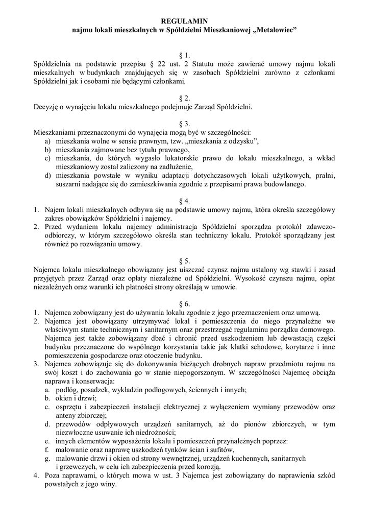 REGULAMIN najmu lokali mieszkalnych w Spółdzielni Mieszkaniowej „Metalowiec” § 1. Spółdzielnia na podstawie przepisu § 22 ust. 2 Statutu może zawierać umowy najmu lokali mieszkalnych w budynkach znajdujących się w zasobach Spółdzielni zarówno z członkami Spółdzielni jak i osobami nie będącymi członkami. § 2. Decyzję o wynajęciu lokalu mieszkalnego podejmuje Zarząd Spółdzielni. § 3. Mieszkaniami przeznaczonymi do wynajęcia mogą być w szczególności: a) mieszkania wolne w sensie prawnym, tzw. „mieszkania z odzysku”, b) mieszkania zajmowane bez tytułu prawnego, c) mieszkania, do których wygasło lokatorskie prawo do lokalu mieszkalnego, a wkład mieszkaniowy został zaliczony na zadłużenie, d) mieszkania powstałe w wyniku adaptacji dotychczasowych lokali użytkowych, pralni, suszarni nadające się do zamieszkiwania zgodnie z przepisami prawa budowlanego. § 4. 1. Najem lokali mieszkalnych odbywa się na podstawie umowy najmu, która określa szczegółowy zakres obowiązków Spółdzielni i najemcy. 2. Przed wydaniem lokalu najemcy administracja Spółdzielni sporządza protokół zdawczoodbiorczy, w którym szczegółowo określa stan techniczny lokalu. Protokół sporządzany jest również po rozwiązaniu umowy. § 5. Najemca lokalu mieszkalnego obowiązany jest uiszczać czynsz najmu ustalony wg stawki i zasad przyjętych przez Zarząd oraz opłaty niezależne od Spółdzielni. Wysokość czynszu najmu, opłat niezależnych oraz warunki ich płatności strony określają w umowie. § 6. 1. Najemca zobowiązany jest do używania lokalu zgodnie z jego przeznaczeniem oraz umową. 2. Najemca jest obowiązany utrzymywać lokal i pomieszczenia do niego przynależne we właściwym stanie technicznym i sanitarnym oraz przestrzegać regulaminu porządku domowego. Najemca jest także zobowiązany dbać i chronić przed uszkodzeniem lub dewastacją części budynku przeznaczone do wspólnego korzystania takie jak klatki schodowe, korytarze i inne pomieszczenia gospodarcze oraz otoczenie budynku. 3. Najemca zobowiązuje się do dokonywania bieżących drobnych napraw przedmiotu najmu na swój koszt i do zachowania go w stanie niepogorszonym. W szczególności Najemcę obciąża naprawa i konserwacja: a. podłóg, posadzek, wykładzin podłogowych, ściennych i innych; b. okien i drzwi; c. osprzętu i zabezpieczeń instalacji elektrycznej z wyłączeniem wymiany przewodów oraz anteny zbiorczej; d. przewodów odpływowych urządzeń sanitarnych, aż do pionów zbiorczych, w tym niezwłoczne usuwanie ich niedrożności; e. innych elementów wyposażenia lokalu i pomieszczeń przynależnych poprzez: f. malowanie oraz naprawę uszkodzeń tynków ścian i sufitów, g. malowanie drzwi i okien od strony wewnętrznej, urządzeń kuchennych, sanitarnych i grzewczych, w celu ich zabezpieczenia przed korozją. 4. Poza naprawami, o których mowa w ust. 3 Najemca jest zobowiązany do naprawienia szkód powstałych z jego winy. 5. Za powstałą szkodę o której mowa w ust. 4 odpowiadają solidarnie z Najemcą osoby stale z nim zamieszkujące. 6. W razie awarii wywołującej szkodę lub grożącej bezpośrednio powstaniem szkody, Najemca jest obowiązany do natychmiastowego udostępnienia lokalu. Spółdzielnia ma prawo wejść do lokalu w obecności funkcjonariusza policji lub straży miejskiej, a gdy wymaga to pomocy straży pożarnej, także przy jej udziale. 7. Jeżeli otwarcie lokalu nastąpiło pod nieobecność Najemcy lub pełnoletniej osoby stale z nim zamieszkującej, Spółdzielnia jest obowiązana zabezpieczyć lokal i znajdujące się w nim rzeczy do czasu przybycia Najemcy. Z czynności tych sporządza się protokół. § 7. 1. Najemca może wprowadzić w lokalu ulepszenia tylko za pisemną zgodą Spółdzielni i na podstawie umowy określającej sposób rozliczeń z tego tytułu. 2. Jeżeli Najemca wprowadzi w lokalu ulepszenia bez zgody Spółdzielni i bez zawarcia umowy określającej sposób rozliczeń z tego tytułu, po zakończeniu najmu jest on zobowiązany do usunięcia wprowadzonych ulepszeń i przywrócenia lokalu do stanu poprzedniego. W przypadku nie usunięcia ulepszeń nie ma prawa do zwrotu ich wartości. § 8. Najemca może oddać lokal w podnajem lub bezpłatne użytkowanie tylko za uprzednią zgodą Spółdzielni wyrażoną na piśmie. § 9. 1. Rozwiązanie umowy może nastąpić: a) w każdym czasie na mocy porozumienia stron, b) z przyczyn i na zasadach określonych w ustawie z 21.06.2001 r. o ochronie praw lokatorów, mieszkaniowym zasobie gminy i o zmianie Kodeksu cywilnego (Dz.U. z 2005 r. Nr 31, poz 266). § 10. 1. Po ustaniu stosunku najmu Najemca zobowiązany jest niezwłocznie zwrócić lokal Spółdzielni w stanie niepogorszonym. 2. W przypadku nie wykonania obowiązku, o którym mowa w ust. 1, Najemca zobowiązany będzie do zapłaty odszkodowania z tytułu bezumownego korzystania z lokalu. § 11. 1. W sprawach nie uregulowanych w niniejszym Regulaminie mają odpowiednio zastosowanie przepisy kodeksu cywilnego, ustawy z 21.06.2001 r. o ochronie praw lokatorów, mieszkaniowym zasobie gminy i o zmianie Kodeksu cywilnego (Dz.U. z 2005 r. Nr 31, poz 266), Statutu oraz stosownych regulaminów obowiązujących w Spółdzielni. 2. Umowy najmu lokali mieszkalnych zawarte przed wejściem w życie niniejszego regulaminu zachowują nadal swą moc prawną, a ich dalsza realizacja winna odbywać się na warunkach w nich określonych. § 12. Niniejszy Regulamin został uchwalony przez Radę Nadzorczą Spółdzielni Mieszkaniowej „Metalowiec” w Kraśniku w dniu 14.04.2008 r. i obowiązuje od dnia podjęcia uchwały. ………………………. Sekretarz Rady Nadzorczej ……………………………. Przewodniczący Rady Nadzorczej
