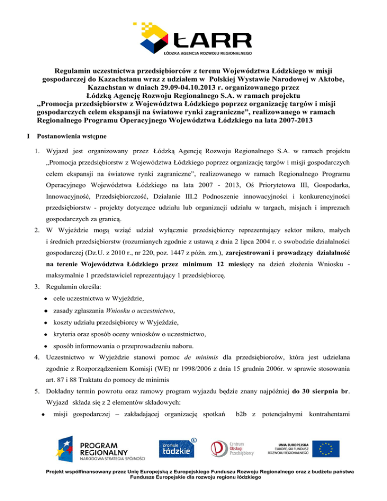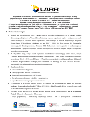 Regulamin uczestnictwa przedsiębiorców z terenu Województwa Łódzkiego w misji gospodarczej do Kazachstanu wraz z udziałem w Polskiej Wystawie Narodowej w Aktobe, Kazachstan w dniach 29.09-04.10.2013 r. organizowanego przez Łódzką Agencję Rozwoju Regionalnego S.A. w ramach projektu „Promocja przedsiębiorstw z Województwa Łódzkiego poprzez organizację targów i misji gospodarczych celem ekspansji na światowe rynki zagraniczne”, realizowanego w ramach Regionalnego Programu Operacyjnego Województwa Łódzkiego na lata 2007-2013 I Postanowienia wstępne 1. Wyjazd jest organizowany przez Łódzką Agencję Rozwoju Regionalnego S.A. w ramach projektu „Promocja przedsiębiorstw z Województwa Łódzkiego poprzez organizację targów i misji gospodarczych celem ekspansji na światowe rynki zagraniczne”, realizowanego w ramach Regionalnego Programu Operacyjnego Województwa Łódzkiego na lata 2007 - 2013, Oś Priorytetowa III, Gospodarka, Innowacyjność, Przedsiębiorczość, Działanie III.2 Podnoszenie innowacyjności i konkurencyjności przedsiębiorstw - projekty dotyczące udziału lub organizacji udziału w targach, misjach i imprezach gospodarczych za granicą. 2. W Wyjeździe mogą wziąć udział wyłącznie przedsiębiorcy reprezentujący sektor mikro, małych i średnich przedsiębiorstw (rozumianych zgodnie z ustawą z dnia 2 lipca 2004 r. o swobodzie działalności gospodarczej (Dz.U. z 2010 r., nr 220, poz. 1447 z późn. zm.), zarejestrowani i prowadzący działalność na terenie Województwa Łódzkiego przez minimum 12 miesięcy na dzień złożenia Wniosku maksymalnie 1 przedstawiciel reprezentujący 1 przedsiębiorcę. 3. Regulamin określa: cele uczestnictwa w Wyjeździe, zasady zgłaszania Wniosku o uczestnictwo, koszty udziału przedsiębiorcy w Wyjeździe, kryteria oraz sposób oceny wniosków o uczestnictwo, sposób informowania o przeprowadzeniu naboru. 4. Uczestnictwo w Wyjeździe stanowi pomoc de minimis dla przedsiębiorców, która jest udzielana zgodnie z Rozporządzeniem Komisji (WE) nr 1998/2006 z dnia 15 grudnia 2006r. w sprawie stosowania art. 87 i 88 Traktatu do pomocy de minimis 5. Dokładny termin powrotu oraz ramowy program wyjazdu będzie znany najpóźniej do 30 sierpnia br. Wyjazd składa się z 2 elementów składowych: misji gospodarczej – zakładającej organizację spotkań b2b z potencjalnymi kontrahentami Projekt współfinansowany przez Unię Europejską z Europejskiego Funduszu Rozwoju Regionalnego oraz z budżetu państwa Fundusze Europejskie dla rozwoju regionu łódzkiego kazachskimi. Szczegółowy program spotkań zostanie przygotowany we współpracy z partnerami wyjazdu. udziału w Polskiej Wystawie Narodowej w Aktobe, Kazachstan. II Cele uczestnictwa w Wyjeździe Celem uczestnictwa w Wyjeździe jest prezentacja i promocja potencjału gospodarczego firm Województwa Łódzkiego oraz nawiązanie kontaktów handlowych z partnerami zagranicznymi. III Zasady zgłaszania Wniosku o uczestnictwo 1. Przedsiębiorca składa Formularz zgłoszeniowy wraz z wymaganymi załącznikami. 2. Wzór Formularza zgłoszeniowego stanowi Załącznik nr 1 do niniejszego Regulaminu. Formularz zgłoszeniowy należy składać do 9 sierpnia 2013 r., do godz. 15:00 osobiście, na adres email: [email protected], pocztą tradycyjną, przesyłką kurierską pod adresem: Łódzka Agencja Rozwoju Regionalnego S.A. Departament Doradztwa dla Biznesu i Sektora Publicznego ul. Tuwima 22/26, 90-002 Łódź wraz z dopiskiem: „Polska Wystawa Narodowa w Aktobe” IV Kryteria oraz sposób oceny Wniosków o uczestnictwo 1. Do udziału w Wyjeździe zostanie zakwalifikowanych 5 przedsiębiorstw. ŁARR S.A. zastrzega sobie prawo do zwiększenia bądź zmniejszenia liczby uczestników Wyjazdu. 2. W przypadku wpłynięcia większej ilości formularzy zgłoszeniowych, do oceny kwalifikowalności przedsiębiorcy powołana zostanie Komisja Oceniająca, która dokona szczegółowej analizy zgłoszonych Formularzy zgodnie z kryteriami wyboru stanowiącymi załącznik nr 4 do niniejszego Regulaminu. 3. W Wyjeździe może wziąć udział maksymalnie 1 przedstawiciel reprezentujący 1 przedsiębiorcę. Przedsiębiorca może wydelegować dodatkowego przedstawiciela na własny koszt. 4. Z każdym zakwalifikowanym przedsiębiorcą biorącym udział w Wyjeździe zawierana jest umowa o dofinansowanie jego udziału w Wyjeździe. Wzór umowy stanowi Załącznik nr 2 do niniejszego Regulaminu. Projekt współfinansowany przez Unię Europejską z Europejskiego Funduszu Rozwoju Regionalnego oraz z budżetu państwa Fundusze Europejskie dla rozwoju regionu łódzkiego V Koszt udziału przedsiębiorców w Wyjeździe 1. Koszty uczestnictwa 1 przedsiębiorcy w Wyjeździe pokrywane przez ŁARR S.A. z budżetu na realizację projektu realizowanego w ramach Regionalnego Programu Operacyjnego Województwa Łódzkiego obejmują maksymalnie 50%: kosztu przelotu/przejazdu na trasie Warszawa – Aktobe – Warszawa dla 1 osoby; kosztu zakwaterowania w hotelu**** wskazanym przez ŁARR S.A. dla 1 osoby; kosztu przygotowania materiałów informacyjno-promocyjnych tj. wspólnego katalogu uczestników wyjazdu; kosztu zakupu powierzchni wystawienniczej 10 m2 dla jednego przedsiębiorcy; kosztu projektu i zabudowy standardowej stoiska zgodnie z ustaleniami zawartymi przez ŁARR S.A. z Organizatorem przypadającego proporcjonalnie na 1 Przedsiębiorcę; kosztu opłat targowych, wpisu do katalogu targowego, wejściówek, usług technicznych (sprzątanie); kosztu zapewnienia tłumaczenia podczas spotkań b2b; kosztu organizacji misji gospodarczej – spotkań b2b. 2. Ubezpieczenie osobowe, diety pobytowe, wyżywienie, koszt wyrobienia wizy, transportu materiałów Przedsiębiorcy, koszt dojazdu do/z Warszawy, oraz ewentualne inne koszty dodatkowe związane z uczestnictwem w Wyjeździe, Przedsiębiorcy pokrywają we własnym zakresie. 3. W przypadku rezygnacji z udziału w Wyjeździe w terminie póź