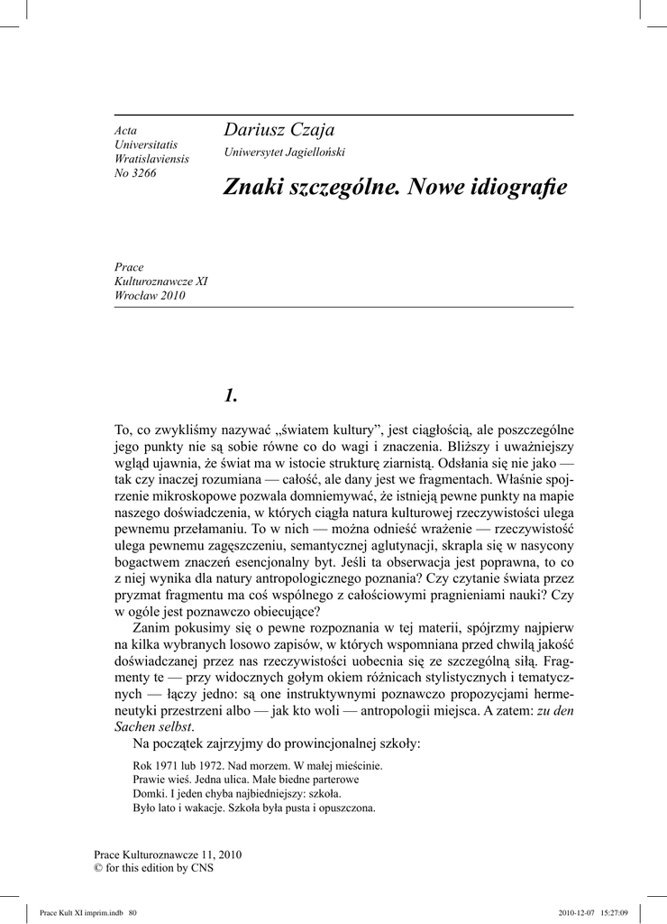 Acta Universitatis Wratislaviensis No 3266 Dariusz Czaja Uniwersytet Jagielloński Znaki szczególne. Nowe idiografie Prace Kulturoznawcze XI Wrocław 2010 1. To, co zwykliśmy nazywać „światem kultury”, jest ciągłością, ale poszczególne jego punkty nie są sobie równe co do wagi i znaczenia. Bliższy i uważniejszy wgląd ujawnia, że świat ma w istocie strukturę ziarnistą. Odsłania się nie jako — tak czy inaczej rozumiana — całość, ale dany jest we fragmentach. Właśnie spojrzenie mikroskopowe pozwala domniemywać, że istnieją pewne punkty na mapie naszego doświadczenia, w których ciągła natura kulturowej rzeczywistości ulega pewnemu przełamaniu. To w nich — można odnieść wrażenie — rzeczywistość ulega pewnemu zagęszczeniu, semantycznej aglutynacji, skrapla się w nasycony bogactwem znaczeń esencjonalny byt. Jeśli ta obserwacja jest poprawna, to co z niej wynika dla natury antropologicznego poznania? Czy czytanie świata przez pryzmat fragmentu ma coś wspólnego z całościowymi pragnieniami nauki? Czy w ogóle jest poznawczo obiecujące? Zanim pokusimy się o pewne rozpoznania w tej materii, spójrzmy najpierw na kilka wybranych losowo zapisów, w których wspomniana przed chwilą jakość doświadczanej przez nas rzeczywistości uobecnia się ze szczególną siłą. Fragmenty te — przy widocznych gołym okiem różnicach stylistycznych i tematycznych — łączy jedno: są one instruktywnymi poznawczo propozycjami hermeneutyki przestrzeni albo — jak kto woli — antropologii miejsca. A zatem: zu den Sachen selbst. Na początek zajrzyjmy do prowincjonalnej szkoły: Rok 1971 lub 1972. Nad morzem. W małej mieścinie. Prawie wieś. Jedna ulica. Małe biedne parterowe Domki. I jeden chyba najbiedniejszy: szkoła. Było lato i wakacje. Szkoła była pusta i opuszczona. Prace Kulturoznawcze 11, 2010 © for this edition by CNS Prace Kult XI imprim.indb 80 2010-12-07 15:27:09 81 Znaki szczególne Miała tylko jedną klasę. Można ją było oglądać Przez zakurzone szyby dwu małych nędznych okien, Umieszczonych nisko tuż nad trotuarem. Robiło to Wrażenie, że szkoła się zapadła poniżej poziomu ulicy. Przylepiłem twarz do szyb. Bardzo długo zaglądałem W głąb ciemną i zmąconą mojej pamięci. Byłem znowu małym chłopcem, siedziałem w biednej wiejskiej klasie, w ławce pokaleczonej kozikami, poplamionymi Atramentem palcami śliniąc kartki elementarza, deski Podłogi miały od ciągłego szorowania głęboko wytarte słoje, Bose nogi wiejskich chłopaków jakoś z tą podłogą dobrze Korespondowały. Bielone ściany, tynk opadający dołem. Na ścianie czarny krzyż. Dziś wiem, że tam przy tym oknie stało się coś Ważnego. Dokonałem pewnego odkrycia. Jakoś niezwykle Jaskrawo uzmysłowiłem sobie Istnienie Wspomnienia. […] Nagle odkryłem jego tajemniczą, niewyobrażalną siłę. Odkryłem, że jest żywiołem, który potrafi niszczyć i tworzyć, Że stoi u początku kreacji, tworzenia. U początku sztuki. Wszystko nagle stało się jasne, jakby otwarły się liczne Drzwi na dalekie nieskończone przestrzenie i pejzaże. […] Wspomnienie żyje poza zasięgiem naszego wzroku, Rodzi się, rozrasta w rejonach naszego uczucia I wzruszenia I płaczu. Nie można było gorzej wybrać, w czasach gdy niepodzielne Rządy sprawował trybunał rozumu. Było się posądzonym nie tylko o odstępstwo, ale I o zacofanie1. A teraz wejdźmy do jakiejś zwyczajnej, podrzędnej knajpy: Czym jest knajpa, knajpa w moim rozumieniu? To pomieszczenie, które wprawdzie ma pewne reguły, pewien rytuał, pewne zastygłe dogmaty, ale jednocześnie jest pomieszczeniem, gdzie oprócz game goście nie tyle cieszą się, ile pod wrażeniem chwil oddają się play, zabawie, zabawom dorosłych dzieci. […] Knajpa jest także miejscem, gdzie kończy się praca i zahamowania, gdzie ludzie zgrywają się, udając tego, kim chcieliby być, jest więc miejscem, w którym poprzez ożywioną grę i żywe obrazy można przedstawić to nieosiągalne, gdzie dzięki nieświadomości można osiągnąć godne potępienia dostojeństwo, jak również obalić samooskarżenie. […] Knajpa jest również zbiorowym teatrem, happeningiem. Każdego dnia miliony knajp i knajpek rozświetlają ludzkimi twarzami miasta, wsie i odludzia, zwyczajni ludzie wynoszą tu swoje 1 T. Kantor, Klasa szkolna, [w:] idem, Pisma. Teatr śmierci. Teksty z lat 1975–1984, t. 2, Wrocław 2004, s. 24, 26. Prace Kulturoznawcze 11, 2010 © for this edition by CNS Prace Kult XI imprim.indb 81 2010-12-07 15:27:09 82 Dariusz Czaja zwyczajne żywoty aż do granicy życia i śmierci. I wszystko tutaj zaczyna się od gry i pierwszego zdania, które zawsze jest rozumiane inaczej. Przez to „inaczej” rozmywają się znaczenia, bo ludzka rozmowa jest pracującą maszyną, która jednak produkuje buble. I te buble dają początek happeningu. Odwrotny rozpad domku z kart. […] To miejsce najbardziej przeciwne wojnie. Bywalec knajpy nie pragnie znaleźć się w innym kraju jako żołnierz, a nawet nie pragnie polec w swoim kraju, nie chce polec nawet w tym mieście, miasteczku, wsi, gdzie jest jego gospoda. Spełnieniem jego życia, gdy już nastanie ten czas, jest śmierć w swojej knajpie. […] Knajpa, kołyszące się wahadło, na przemian piękno i brzydota, nudy na pudy i podniecenie, królestwo niezbadanej banalności2. I jeszcze rzut oka na przestrzeń prowincjonalnej stacji benzynowej: W moim powiatowym mieście jest duża stacja benzynowa. Wieczorami, zwłaszcza w piątki i soboty, spotykają się tam młodzi ludzie. Przed pawilonem mieszczącym sklep i bar stoi czasami kilkadziesiąt samochodów. Te samochody to wielki symbol europejskiego zjednoczenia. Wszystkimi wcześniej jeździli obywatele „Starej Europy”. […] W cieniu stacji uprawia się miłość, pije i załatwia interesy. Słychać krzyki, przekleństwa, niekiedy brzęk tłuczonego szkła. Czasami zjawia się patrol p