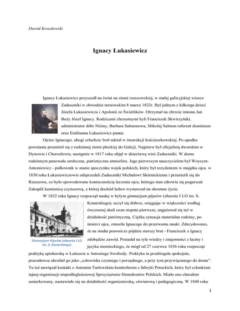 Dawid Kowalewski Ignacy Łukasiewicz Ignacy Łukasiewicz przyszedł na świat na ziemi rzeszowskiej, w małej galicyjskiej wiosce Zaduszniki w obwodzie tarnowskim 8 marca 1822r. Był jednym z kilkorga dzieci Józefa Łukasiewicza i Apolonii ze Świetlików. Otrzymał na chrzcie imiona Jan Boży Józef Ignacy. Rodzicami chrzestnymi byli Franciszek Skwirzyński, administrator dóbr Niziny, Barbara Salmonowa, Mikołaj Salmon referent dominium oraz Emilianna Łukasiewicz panna. Ojciec Ignacego, ubogi szlachcic brał udział w insurekcji kościuszkowskiej. Po upadku powstania przeniósł się z rodzinnej ziemi płockiej do Galicji. Najpierw był oficjalistą dworskim w Dynowie i Chorzelewie, następnie w 1817 roku objął w dzierżawę wieś Zaduszniki. W domu rodzinnym panowała serdeczna, patriotyczna atmosfera. Jego pierwszym nauczycielem był WoysymAntoniewicz - pułkownik w stanie spoczynku wojsk polskich, który był rezydentem w majątku ojca. w 1830 roku Łukasiewiczowie odsprzedali Zaduszniki Michałowi Skórnickiemu i przenieśli się do Rzeszowa, co było spowodowane koniecznością leczenia ojca, którego stan zdrowia się pogarszał. Zakupili kamienicę czynszową, z której dochód ledwo wystarczał na skromne życie. W 1832 roku Ignacy rozpoczął naukę w byłym gimnazjum pijarów (obecnie I LO im. S. Konarskiego), uczył się dobrze, osiągając w większości według ówczesnej skali ocen stopnie pierwsze, angażował się też w działalność patriotyczną. Ciężka sytuacja materialna rodziny, po śmierci ojca, zmusiła Ignacego do przerwania nauki. Zdecydowano, że na studia prawnicze pójdzie starszy brat - Franciszek a Ignacy Gimnazjum Pijarów (obecnie I LO im. S. Konarskiego) zdobędzie zawód. Posiadał na tyle wiedzy i znajomości z łaciny i języka niemieckiego, że mógł od 27 czerwca 1836 roku rozpocząć praktykę aptekarską w Łańcucie u Antoniego Swobody. Praktyka ta przebiegała spokojnie, pracodawca określał go jako „człowieka czynnego i porządnego, a przy tym przywiązanego do domu”. Tu też nawiązał kontakt z Antonim Tarłowskim-kontrolerem z fabryki Potockich, który był członkiem tajnej organizacji niepodległościowej Sprzysiężenie Demokratów Polskich. Miało ono charakter umiarkowany, nastawiało się na działalność organizatorską, oświatową i pedagogiczną. W 1840 roku 1 aresztowano Tarłowskiego. Młodemu wiekowi i brakowi obciążającego materiału zawdzięczał Łukasiewicz, że skończyło się na protokolarnym przesłuchaniu i odnotowaniu go w aktach policyjnych jako „podejrzanego politycznie”. Po 4 latach pracy przystąpił do egzaminu tyrocynalnego, który obejmował znajomość receptury, bezbłędne odczytywanie recept, tłumaczenie farmakognacji, chemię farmaceutyczną, analizę chemiczną prostych związków oraz wiadomości z praktycznej farmacji i ustawodawstwa. Po zdaniu egzaminu przed Gremium Aptekarskim Obwodowym w Rzeszowie, awansował na pomocnika aptekarskiego. Powrócił do apteki łańcuckiej jako pomocnik i pracował tam jeszcze 14 miesięcy. 6 października 1841 roku przeniósł się do apteki obwodowej mgra Edwarda Hübla w Rzeszowie. Praca w tej aptece dała mu możliwość pogłębiania wiedzy fachowej. W tym okresie nawiązał współpracę z Edwardem Dembowskim, który zaprzysiągł go jako rejonowego agenta Centralizacji Towarzystwa Demokratycznego Polskiego na Rzeszów i Apteka obwodowa mgr. Edwarda Hübla w Rzeszowie. Łańcut oraz zobowiązał do przygotowania powstania w Rzeszowie i okolicy. Apteka była doskonałym punktem kontaktowym, jej umeblowanie nadawało się do ukrywania w szufladach i różnych schowkach zakazanej literatury. Łukasiewicz posiadał osobiste kontakty z mieszczaństwem i urzędnikami Rzeszowa, Łańcuta, Leżajska a także wśród niższego personelu okolicznych majątków ziemskich. w samym Rzeszowie znalazł ludzi oddanych wśród gimnazjalistów, rzemieślników, subiektów sklepowych, urzędników.Rozprowadzał wśród nich m.in. „Księgi narodu polskiego i pielgrzymstwa polskiego” Mickiewicza, „Psalmy przyszłości” Krasińskiego, i in. Wybuch powstania w Rzeszowie planowano na połowę lutego. 17 lutego 1846 roku na bal fantowy mieli przybyć uczestnicy powstania i przemycić broń palną, aby za kilka dni zaatakować koszary. Jednak tego dnia do miasta wkroczyły silne oddziały wojska, zakazano balu, a szlachtę wyłapywano i częściowo aresztowano. 19 lutego aresztowano także I. Łukasiewicza. Od początku przesłuchań przyjął taktykę zaprzeczania wszystkiemu, był opanowany, na wszystko miał logiczną odpowiedź, zgodnie z zeznaniami innych przesłuchiwanych, co wskazuje iż licząc się z możliwością aresztowania z góry uzgodnili zeznania. Władze rzeszowskie uznając go za uciążliwego, sprytnego i wytrzymałego przestępcę przekazały 8 maja 1847 roku do osławionego więzienia „karmelitańskiego” we Lwowie. Jednak z braku dowodów sąd umorzył śledztwo. 27 grudnia 1847 roku wypuszczono Łukasiewicza na wolność z obowiązkiem stałego zamieszkania we Lwowie i meldowania się w sądzie w razie wezwania, oraz roztoczono nad nim nadzór policyjny. Zamieszkał u brata Franciszka, urzędnika magistrackiego we Lwowie. Dopiero po 8 miesiącach 15 sierpnia 1848 roku został przyjęty na pomocnika aptekarskiego do „Apteki pod Złotą Gwiazdą”, należącej do Piotra Mikolascha. 2 Była to wówczas najlepsza apteka lwowska o dobrze rozbudowanym zapleczu laboratoryjnym. Prowadzono w niej nie tylko typowe badania farmaceutyczne, ale również analizy chemiczne dla celów gospodarczych i wojskowych. Fakt, iż Łukasiewicz został pracownikiem tej apteki, było dużym sukcesem osobistym i zawodowym. Z relacji Anczyca wiemy, że Mikolasch „ poznawszy jego zdolności i wykształcenie fachowe, bardzo Apteki pod Złotą Gwiazdą go polubił i do różnych badań analitycznych pod swoim okiem wprawiał. Okres pracy w tej aptece miną