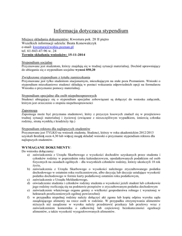Informacja dotycząca stypendium Miejsce składania dokumentów: Kwestura pok. 28 II piętro Wszelkich informacji udziela: Beata Konowalczyk e-mail: [email protected] tel. 61-843-47-96 w. 24 Termin składania wniosków: 15-11-2014 Stypendium socjalne Przyznawane jest studentom, którzy znajdują się w trudnej sytuacji materialnej. Dochód uprawniający do ubiegania się o stypendium socjalne wynosi 850,20 Zwiększone stypendium z tytułu zamieszkania Przyznawane jest tylko studentom stacjonarnym, mieszkającym na stałe poza Poznaniem. Wnioski o stypendium mieszkaniowe studenci składają w postaci wskazania odpowiednich opcji na formularzu Wniosku o przyznanie pomocy materialnej. Stypendium specjalne dla osób niepełnosprawnych Studenci ubiegający się o stypendium specjalne zobowiązani są dołączyć do wniosku załącznik, którym jest orzeczenie o stopniu niepełnosprawności Zapomoga Zapomoga może być przyznana studentowi, który z przyczyn losowych znalazł się w przejściowo trudnej sytuacji materialnej i życiowej (związane z nieszczęśliwym wypadkiem, śmiercią członka rodziny, stratą wynikłą z kradzieży itp.) Stypendium rektora dla najlepszych studentów Przyznawane jest TYLKO na wniosek studenta. Studenci, którzy w roku akademickim 2012/2013 uzyskali średnią ocen 4,30 lub więcej mogą składać wnioski o przyznanie stypendium rektora dla najlepszych studentów. WYMAGANE DOKUMENTY: Do wniosku dołączamy: a) zaświadczenia z Urzędu Skarbowego o wysokości dochodów uzyskanych przez studenta i członków rodziny w poprzednim roku kalendarzowym, opodatkowanych podatkiem od osób fizycznych na zasadach ogólnych – dla wszystkich członków rodziny, którzy ukończyli 18 rok życia, b) zaświadczenia z Urzędu Skarbowego o wysokości należnego zryczałtowanego podatku dochodowego w ostatnim roku rozliczeniowym, albo decyzję lub decyzje ustalające wysokość podatku dochodowego w formie karty podatkowej ostatnim roku podatkowym, c) zaświadczenie z Urzędu Meldunkowego, d) oświadczenie studenta i członków rodziny studenta o wysokości jeżeli student lub członkowie jego rodziny rozliczają się na podstawie przepisów o zryczałtowanym podatku dochodowym e) zaświadczenie właściwego organu gminy o wielkości gospodarstwa rolnego ( wyrażonej w hektarach przeliczeniowych ogólnej powierzchni) f) w przypadku niepełnej rodziny należy dołączyć akt zgonu lub kopię odpisu wyroku sądu zasądzającego alimenty na rzecz osób w rodzinie. W przypadku otrzymywania alimentów niższych niż zasądzone w wyroku należy przedstawić przekazy lub przelewy wraz z zaświadczeniem komornika o całkowitej lub częściowej bezskuteczności egzekucji alimentów, a także wysokość wyegzekwowanych alimentów. g) Zaświadczenie o uczącym się rodzeństwie (szkoły ponadpodstawowe) w wieku do ukończenia 25 roku życia. h) Zaświadczenie z ZUS-u o wielkości odprowadzonej składki na ubezpieczenie zdrowotne w poprzednim roku kalendarzowym i) Oświadczenie rodziny studenta o wysokości uzyskanych w okresie wymaganym do udokumentowania wniosku o pomoc materialną innych dochodów nie podlegających opodatkowaniu