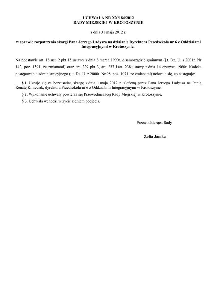 UCHWAŁA NR XX/184/2012 RADY MIEJSKIEJ W KROTOSZYNIE z dnia 31 maja 2012 r. w sprawie rozpatrzenia skargi Pana Jerzego Ładysza na działanie Dyrektora Przedszkola nr 6 z Oddziałami Integracyjnymi w Krotoszynie. Na podstawie art. 18 ust. 2 pkt 15 ustawy z dnia 8 marca 1990r. o samorządzie gminnym (j.t. Dz. U. z 2001r. Nr 142, poz. 1591, ze zmianami) oraz art. 229 pkt 3, art. 237 i art. 238 ustawy z dnia 14 czerwca 1960r. Kodeks postępowania administracyjnego (j.t. Dz. U. z 2000r. Nr 98, poz. 1071, ze zmianami) uchwala się, co następuje: § 1. Uznaje się za bezzasadną skargę z dnia 1 maja 2012 r. złożoną przez Pana Jerzego Ładysza na Panią Renatę Kmieciak, dyrektora Przedszkola nr 6 z Oddziałami Integracyjnymi w Krotoszynie. § 2. Wykonanie uchwały powierza się Przewodniczącej Rady Miejskiej w Krotoszynie. § 3. Uchwała wchodzi w życie z dniem podjęcia. Przewodnicząca Rady Zofia Jamka Uzasadnienie W dniu 2 maja 2012r. wpłynęła do Urzędu Miejskiego w Krotoszynie skarga złożona przez Pana Jerzego Ładysza na Panią Renatę Kmieciak, dyrektora Przedszkola nr 6 z Oddziałami Integracyjnymi w Krotoszynie. Zgodnie z art. 229 ust. 3 ustawy z dnia 14 czerwca 1960r. - Kodeks postępowania administracyjnego (j.t. Dz. U. z 2000r. Nr 98, poz. 1071, ze zmianami) organem właściwym do rozpatrzenia skargi dotyczącej zadań lub działalności kierownika gminnej jednostki organizacyjnej jest rada gminy. Mając powyższe na uwadze oraz uwzględniając zapisy obowiązującej w Urzędzie procedury, Przewodnicząca Rady Miejskiej w Krotoszynie skierowała przedmiotową skargę do Komisji Rewizyjnej Rady Miejskiej w Krotoszynie, w celu jej rozpatrzenia. Komisja Rewizyjna, na posiedzeniu w dniu 29 maja 2012r., dokonała szczegółowej analizy całości dokumentacji dotyczącej przedmiotowej sprawy i ustaliła, co następuje. Pani Renata Kmieciak, dyrektor Przedszkola nr 6 z Oddziałami Integracyjnymi w Krotoszynie – jednostki prowadzonej przez Miasto i Gminę Krotoszyn, w dniu 31 sierpnia 2011r. podpisała z matką dziecka, wykonującą zgodnie z wyrokiem o rozwód władzę rodzicielską nad małoletnią córką skarżącego, umowę w sprawie regulowania odpłatności za świadczenia Przedszkola. Z treści wyroku o rozwód wynika, że Panu Jerzemu Ładyszowi pozostawiono współdecydowanie o istotnych sprawach w szczególności związanych z leczeniem i realizacją obowiązku szkolnego córki. Wysokość opłat za przedszkole, które chce wnosić Pan Jerzy Ładysz, taką sprawą nie jest. Z uwagi na fakt, że Pan Jerzy Ładysz nie jest stroną ww. umowy, nie ma podstaw do wnoszenia opłat za Przedszkole. Dokonywane przez Pana Jerzego Ładysza wpłaty, zgodnie z art. 410 § 2 ustawy z dnia 23 kwietnia 1964r. - Kodeks cywilny (t.j. Dz. U. Nr 16, poz. 93, ze zmianami), są świadczeniem nienależnym. Ze względu na treść art. 411 pkt 1 Kodeksu cywilnego, po dokonaniu takich wpłat Pan Jerzy Ładysz nie będzie miał podstaw do żądania ich zwrotu. Komisja Rewizyjna Rady Miejskiej w Krotoszynie, przy uwzględnieniu aktualnego stanu prawnego, przekazała Radzie Miejskiej w Krotoszynie wniosek o uznanie skargi Pana Jerzego Ładysza za bezzasadną. Przewodnicząca Rady Zofia Jamka