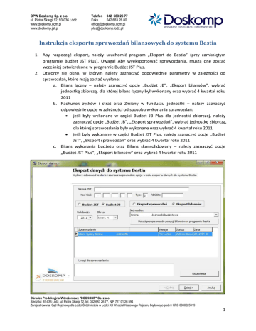 OPW Doskomp Sp. z o.o. ul. Piotra Skargi 12, 93-036 Łódź www.doskomp.com.pl www.doskomp.jst.pl Telefon 042 683 26 77 Faks 042 683 26 80 [email protected] [email protected] Instrukcja eksportu sprawozdań bilansowych do systemu Bestia 1. Aby rozpocząć eksport, należy uruchomić program „Eksport do Bestia” (przy zamkniętym programie Budżet JST Plus). Uwaga! Aby wyeksportować sprawozdania, muszą one zostać wcześniej zatwierdzone w programie Budżet JST Plus. 2. Otworzy się okno, w którym należy zaznaczyć odpowiednie parametry w zależności od sprawozdań, które mają zostać wysłane: a. Bilans łączny – należy zaznaczyć opcje „Budżet JB”, „Eksport bilansów”, wybrać jednostkę zbiorczą, dla której bilans łączny był wykonany oraz wybrać 4 kwartał roku 2011 b. Rachunek zysków i strat oraz Zmiany w funduszu jednostki – należy zaznaczyć odpowiednie opcje w zależności od sposobu wykonania sprawozdań: jeśli były wykonane w części Budżet JB Plus dla jednostki zbiorczej, należy zaznaczyć opcje „Budżet JB”, „Eksport sprawozdań”, wybrać jednostkę zbiorczą, dla której sprawozdania były wykonane oraz wybrać 4 kwartał roku 2011 jeśli były wykonane w części Budżet JST Plus, należy zaznaczyć opcje „Budżet JST”, „Eksport sprawozdań” oraz wybrać 4 kwartał roku 2011 c. Bilans wykonania budżetu oraz Bilans skonsolidowany – należy zaznaczyć opcje „Budżet JST Plus”, „Eksport bilansów” oraz wybrać 4 kwartał roku 2011 Ośrodek Produkcyjno-Wdrożeniowy "DOSKOMP" Sp. z o.o. Siedziba: 93-036 Łódź, ul. Piotra Skargi 12, tel. 042 683 26 77, NIP 727 01 26 594 Zarejestrowana: Sąd Rejonowy dla Łodzi-Śródmieścia w Łodzi XX Wydział Krajowego Rejestru Sądowego pod nr KRS 0000225919 1 OPW Doskomp Sp. z o.o. ul. Piotra Skargi 12, 93-036 Łódź www.doskomp.com.pl www.doskomp.jst.pl Telefon 042 683 26 77 Faks 042 683 26 80 [email protected] [email protected] 3. W przypadku eksportu sprawozdań typu bilans należy wykonać mapowanie pozycji bilansu – należy kliknąć „Pokaż przypisania do pozycji bilansów w programie Bestia” 4. Otworzy się okno: 5. Należy sprawdzić czy wszystkie pozycje dla danego bilansu mają przypisane pozycje w programie Bestia. Jeśli nie, najlepiej kliknąć „Usuń wszystkie przypisania”, a następnie „Przypisz automatycznie”. (Uwaga! Rodzaj bilansu wybieramy z listy w pozycji „Pokaż przypisania dla:”) Po przypisaniu pozycji klikamy „Zamknij”. 6. Po wybraniu właściwych opcji i ew. przypisaniu pozycji bilansu, klikamy „Dalej” Ośrodek Produkcyjno-Wdrożeniowy "DOSKOMP" Sp. z o.o. Siedziba: 93-036 Łódź, ul. Piotra Skargi 12, tel. 042 683 26 77, NIP 727 01 26 594 Zarejestrowana: Sąd Rejonowy dla Łodzi-Śródmieścia w Łodzi XX Wydział Krajowego Rejestru Sądowego pod nr KRS 0000225919 2 OPW Doskomp Sp. z o.o. ul. Piotra Skargi 12, 93-036 Łódź www.doskomp.com.pl www.doskomp.jst.pl Telefon 042 683 26 77 Faks 042 683 26 80 [email protected] [email protected] 7. W kolejnym oknie zaznaczamy sprawozdania, które mają zostać wyeksportowane i klikamy „Dalej” 8. Ukaże nam się podsumowanie, z informację gdzie zostaną zapisane eksportowane pliki – klikamy „Dalej”, a następnie „Zakończ” 9. Tak wyeksportowane pliki można wczytać do systemu Bestia. Ośrodek Produkcyjno-Wdrożeniowy "DOSKOMP" Sp. z o.o. Siedziba: 93-036 Łódź, ul. Piotra Skargi 12, tel. 042 683 26 77, NIP 727 01 26 594 Zarejestrowana: Sąd Rejonowy dla Łodzi-Śródmieścia w Łodzi XX Wydział Krajowego Rejestru Sądowego pod nr KRS 0000225919 3