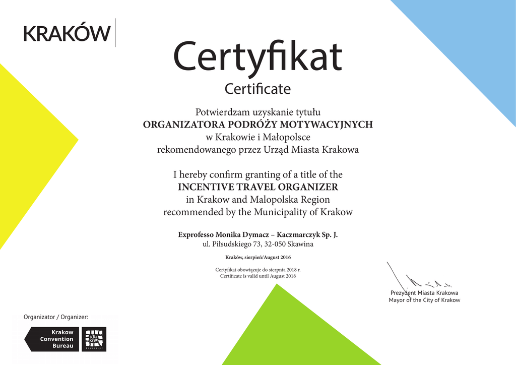 Certyfikat Certificate Potwierdzam uzyskanie tytułu ORGANIZATORA PODRÓŻY MOTYWACYJNYCH w Krakowie i Małopolsce rekomendowanego przez Urząd Miasta Krakowa I hereby confirm granting of a title of the INCENTIVE TRAVEL ORGANIZER in Krakow and Malopolska Region recommended by the Municipality of Krakow Exprofesso Monika Dymacz – Kaczmarczyk Sp. J. ul. Piłsudskiego 73, 32-050 Skawina Kraków, sierpień/August 2016 Certyfikat obowiązuje do sierpnia 2018 r. Certificate is valid until August 2018 Prezydent Miasta Krakowa Mayor of the City of Krakow Organizator / Organizer: