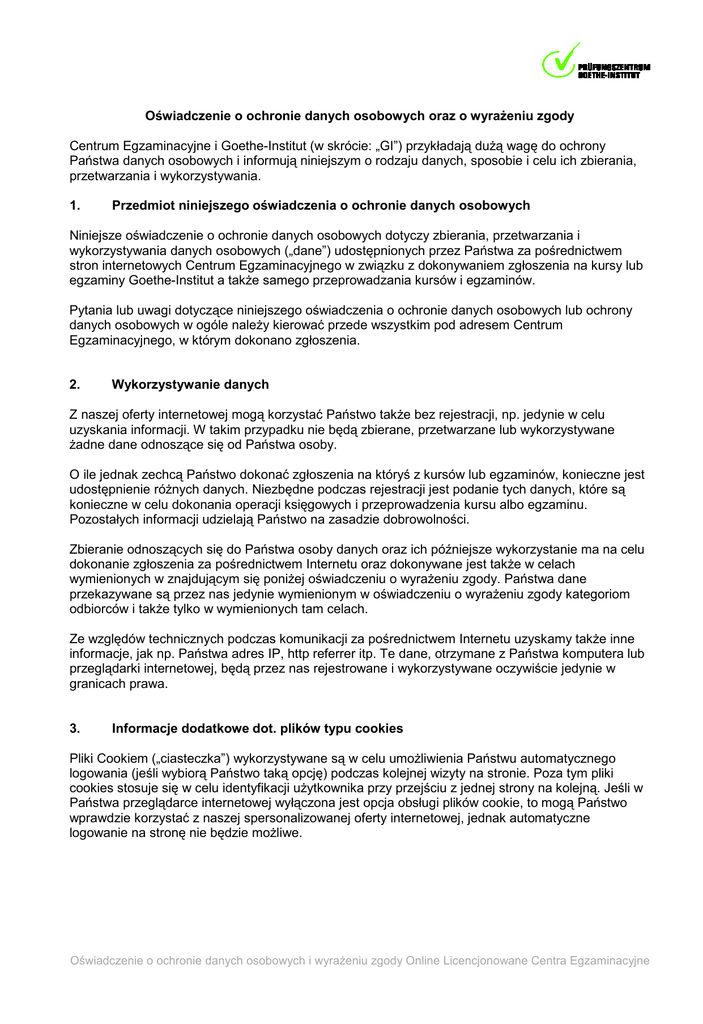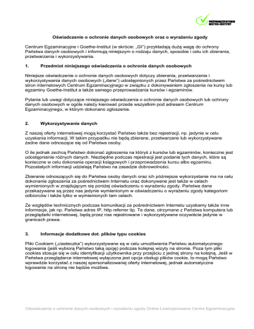 Oświadczenie o ochronie danych osobowych oraz o wyrażeniu zgody Centrum Egzaminacyjne i Goethe-Institut (w skrócie: „GI”) przykładają dużą wagę do ochrony Państwa danych osobowych i informują niniejszym o rodzaju danych, sposobie i celu ich zbierania, przetwarzania i wykorzystywania. 1. Przedmiot niniejszego oświadczenia o ochronie danych osobowych Niniejsze oświadczenie o ochronie danych osobowych dotyczy zbierania, przetwarzania i wykorzystywania danych osobowych („dane”) udostępnionych przez Państwa za pośrednictwem stron internetowych Centrum Egzaminacyjnego w związku z dokonywaniem zgłoszenia na kursy lub egzaminy Goethe-Institut a także samego przeprowadzania kursów i egzaminów. Pytania lub uwagi dotyczące niniejszego oświadczenia o ochronie danych osobowych lub ochrony danych osobowych w ogóle należy kierować przede wszystkim pod adresem Centrum Egzaminacyjnego, w którym dokonano zgłoszenia. 2. Wykorzystywanie danych Z naszej oferty internetowej mogą korzystać Państwo także bez rejestracji, np. jedynie w celu uzyskania informacji. W takim przypadku nie będą zbierane, przetwarzane lub wykorzystywane żadne dane odnoszące się od Państwa osoby. O ile jednak zechcą Państwo dokonać zgłoszenia na któryś z kursów lub egzaminów, konieczne jest udostępnienie różnych danych. Niezbędne podczas rejestracji jest podanie tych danych, które są konieczne w celu dokonania operacji księgowych i przeprowadzenia kursu albo egzaminu. Pozostałych informacji udzielają Państwo na zasadzie dobrowolności. Zbieranie odnoszących się do Państwa osoby danych oraz ich późniejsze wykorzystanie ma na celu dokonanie zgłoszenia za pośrednictwem Internetu oraz dokonywane jest także w celach wymienionych w znajdującym się poniżej oświadczeniu o wyrażeniu zgody. Państwa dane przekazywane są przez nas jedynie wymienionym w oświadczeniu o wyrażeniu zgody kategoriom odbiorców i także tylko w wymienionych tam celach. Ze względów technicznych podczas komunikacji za pośrednictwem Internetu uzyskamy także inne informacje, jak np. Państwa adres IP, http referrer itp. Te dane, otrzymane z Państwa komputera lub przeglądarki internetowej, będą przez nas rejestrowane i wykorzystywane oczywiście jedynie w granicach prawa. 3. Informacje dodatkowe dot. plików typu cookies Pliki Cookiem („ciasteczka”) wykorzystywane są w celu umożliwienia Państwu automatycznego logowania (jeśli wybiorą Państwo taką opcję) podczas kolejnej wizyty na stronie. Poza tym pliki cookies stosuje się w celu identyfikacji użytkownika przy przejściu z jednej strony na kolejną. Jeśli w Państwa przeglądarce internetowej wyłączona jest opcja obsługi plików cookie, to mogą Państwo wprawdzie korzystać z naszej spersonalizowanej oferty internetowej, jednak automatyczne logowanie na stronę nie będzie możliwe. Oświadczenie o ochronie danych osobowych i wyrażeniu zgody Online Licencjonowane Centra Egzaminacyjne 4. Prawo sprzeciwu W każdej chwili mogą Państwo sprzeciwić się wykorzystywaniu swoich danych w celu badania rynku a także w celach reklamowych i marketingowych. Wystarczy w tym celu przesłać pocztą elektroniczną wiadomość zawierającą odpowiednią informację na adres właściwego dla Państwa Centrum Egzaminacyjnego: [nazwa centrum egzaminacyjnego] Oświadczenie o wyrażeniu zgody Nazwisko, imię:____________________________________________________________ Niniejszym wyrażam zgodę na przekazanie przez Centrum Egzaminacyjne moich danych osobowych („dane”) udostępnionych przeze mnie podczas rejestracji oraz moich danych osobowych udostępnionych w związku z realizacją zawartych ze mną w przyszłości umów do centralnej bazy danych klientów Goethe-Institut e.V. (pol.: stowarzyszenie zarejestrowane) z siedzibą w Monachium / Niemcy w celu zapisania ich tam, oraz na dokonanie scalenia tych danych ze znajdującymi się tam już ewentualnie innymi danymi dotyczącymi mojej osoby. Ponadto wyrażam zgodę na obszerne wykorzystywanie moich danych przez Centrum Egzaminacyjne i Goethe-Institut oprócz wykonywania zobowiązań wynikających z umów także do przeprowadzania badań rynkowych oraz w celach reklamowych i marketingowych dotyczących każdorazowo oferty Centrum Egzaminacyjnego i Goethe-Institut, w szczególności w celu dostarczania na podane przeze mnie dane teleadresowe odpowiednich informacji reklamowych i zapytań („informacje”). Informacje mogą być przesyłane pocztą, telefonicznie, faksem, pocztą elektroniczną i/lub w formie wiadomości tekstowych SMS. W celu kontroli autentyczności i wystawiania duplikatów zaświadczeń zgadzam się ponadto na przekazywanie do Centrali, przechowywanie tam w centralnym archiwum egzaminów (przez maksymalnie 10 lat) oraz przetwarzanie danych dotyczących egzaminów, w których brałem/łam udział. O ile są to informacje dotyczące egzaminów upoważniających do osiedlenia się w Niemczech małżonka w ramach łączenia rodzin, wyrażam zgodę na to, żeby Goethe-Institut na żądanie niemieckich urzędów potwierdził autentyczność przedłożonego przeze mnie urzędowi świadectwa. Moje dane nie będą przez Centrum Egzaminacyjne i Goethe-Institut wykorzystywane lub przekazywane osobom trzecim w celach innych niż wymienione powyżej w treści oświadczenia, chyba że w odniesieniu do tych danych istnieje uzasadnione podejrzenie popełnienia nadużycia. Jest mi wiadome, że w każdej chwili mogę sprzeciwić się wykorzystywaniu moich danych w celu badania rynku a także w celach reklamowych i marketingowych. Oświadczenie o ochronie danych osobowych i wyrażeniu zgody Online Licencjonowane Centra Egzaminacyjne