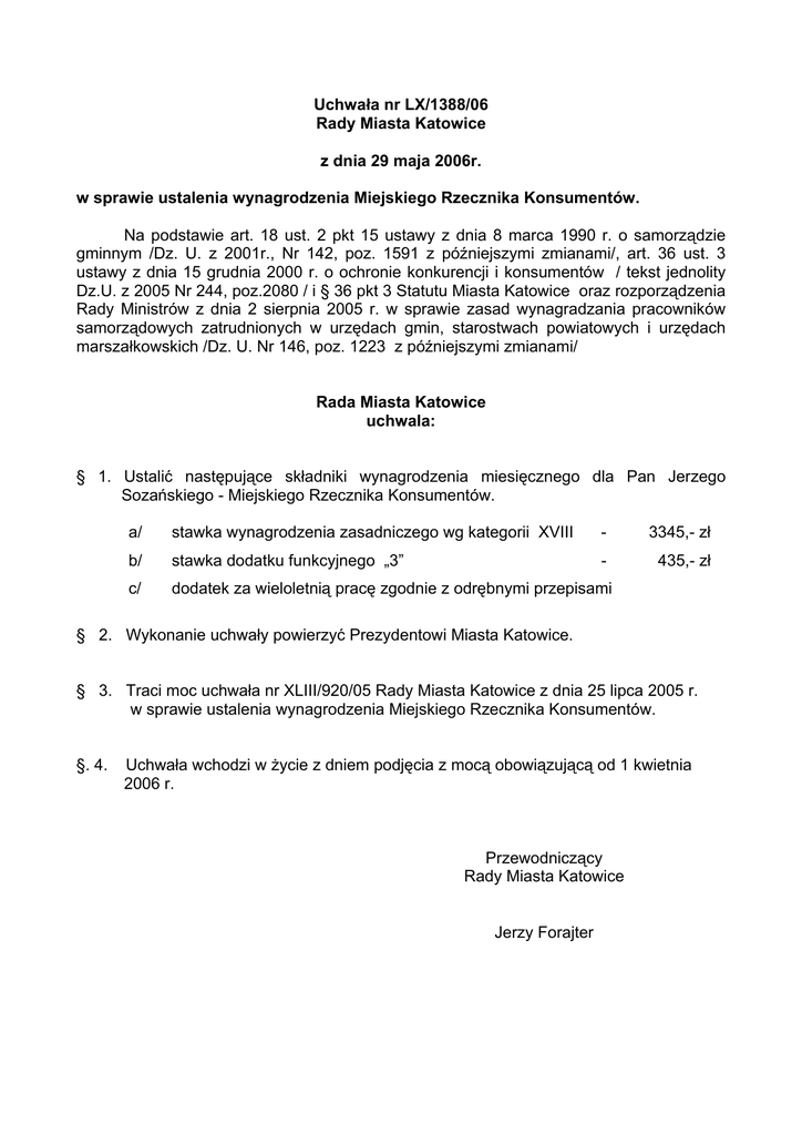 Uchwała nr LX/1388/06 Rady Miasta Katowice z dnia 29 maja 2006r. w sprawie ustalenia wynagrodzenia Miejskiego Rzecznika Konsumentów. Na podstawie art. 18 ust. 2 pkt 15 ustawy z dnia 8 marca 1990 r. o samorządzie gminnym /Dz. U. z 2001r., Nr 142, poz. 1591 z późniejszymi zmianami/, art. 36 ust. 3 ustawy z dnia 15 grudnia 2000 r. o ochronie konkurencji i konsumentów / tekst jednolity Dz.U. z 2005 Nr 244, poz.2080 / i § 36 pkt 3 Statutu Miasta Katowice oraz rozporządzenia Rady Ministrów z dnia 2 sierpnia 2005 r. w sprawie zasad wynagradzania pracowników samorządowych zatrudnionych w urzędach gmin, starostwach powiatowych i urzędach marszałkowskich /Dz. U. Nr 146, poz. 1223 z późniejszymi zmianami/ Rada Miasta Katowice uchwala: § 1. Ustalić następujące składniki wynagrodzenia miesięcznego dla Pan Jerzego Sozańskiego - Miejskiego Rzecznika Konsumentów. a/ stawka wynagrodzenia zasadniczego wg kategorii XVIII - 3345,- zł b/ stawka dodatku funkcyjnego „3” - 435,- zł c/ dodatek za wieloletnią pracę zgodnie z odrębnymi przepisami § 2. Wykonanie uchwały powierzyć Prezydentowi Miasta Katowice. § 3. Traci moc uchwała nr XLIII/920/05 Rady Miasta Katowice z dnia 25 lipca 2005 r. w sprawie ustalenia wynagrodzenia Miejskiego Rzecznika Konsumentów. §. 4. Uchwała wchodzi w życie z dniem podjęcia z mocą obowiązującą od 1 kwietnia 2006 r. Przewodniczący Rady Miasta Katowice Jerzy Forajter
