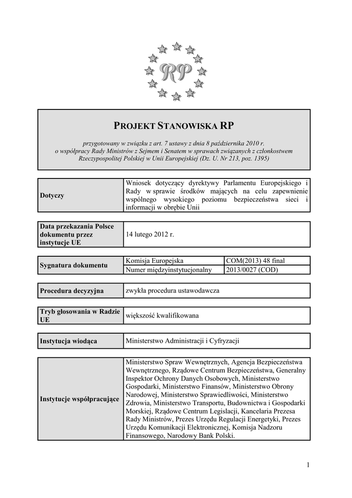PROJEKT STANOWISKA RP przygotowany w związku z art. 7 ustawy z dnia 8 października 2010 r. o współpracy Rady Ministrów z Sejmem i Senatem w sprawach związanych z członkostwem Rzeczypospolitej Polskiej w Unii Europejskiej (Dz. U. Nr 213, poz. 1395) Dotyczy Wniosek dotyczący dyrektywy Parlamentu Europejskiego i Rady w sprawie środków mających na celu zapewnienie wspólnego wysokiego poziomu bezpieczeństwa sieci i informacji w obrębie Unii Data przekazania Polsce dokumentu przez instytucje UE 14 lutego 2012 r. Sygnatura dokumentu Komisja Europejska Numer międzyinstytucjonalny Procedura decyzyjna zwykła procedura ustawodawcza COM(2013) 48 final 2013/0027 (COD) Tryb głosowania w Radzie większość kwalifikowana UE Instytucja wiodąca Ministerstwo Administracji i Cyfryzacji Ministerstwo Spraw Wewnętrznych, Agencja Bezpieczeństwa Wewnętrznego, Rządowe Centrum Bezpieczeństwa, Generalny Inspektor Ochrony Danych Osobowych, Ministerstwo Gospodarki, Ministerstwo Finansów, Ministerstwo Obrony Narodowej, Ministerstwo Sprawiedliwości, Ministerstwo Instytucje współpracujące Zdrowia, Ministerstwo Transportu, Budownictwa i Gospodarki Morskiej, Rządowe Centrum Legislacji, Kancelaria Prezesa Rady Ministrów, Prezes Urzędu Regulacji Energetyki, Prezes Urzędu Komunikacji Elektronicznej, Komisja Nadzoru Finansowego, Narodowy Bank Polski. 1 Data przyjęcia przez KSE 2 I. Cel projektu aktu prawnego Zasadniczym celem proponowanej dyrektywy jest zapewnienie wspólnego wysokiego poziomu bezpieczeństwa sieci telekomunikacyjnych i przetwarzanych w nich informacji. Rozumie się przez to zwiększenie bezpieczeństwa publicznych sieci telekomunikacyjnych w warstwie aplikacyjnej oraz systemów informatycznych stanowiących podstawę funkcjonowania naszych społeczeństw i gospodarek. Zdaniem projektodawcy cel ten zostanie osiągnięty poprzez nałożenie na państwa członkowskie obowiązku zwiększenia gotowości i ulepszenia wzajemnej współpracy oraz poprzez nałożenie na operatorów infrastruktury krytycznej, w takich dziedzinach jak energetyka, transport i kluczowe usługi społeczeństwa informacyjnego (platformy handlu elektronicznego, serwisy społecznościowe itd.), jak również na organy administracji publicznej, obowiązku podjęcia odpowiednich działań mających na celu przeciwdziałanie zagrożeniom bezpieczeństwa oraz obowiązku zgłaszania poważnych incydentów właściwym organom krajowym. Projekt dyrektywy został przedstawiony łącznie ze wspólnym komunikatem Komisji i Wysokiego Przedstawiciela Unii do Spraw Zagranicznych i Polityki Bezpieczeństwa w sprawie europejskiej strategii bezpieczeństwa cybernetycznego 1. Strategia bezpieczeństwa cybernetycznego zatytułowana: „Otwarta, bezpieczna i chroniona cyberprzestrzeń” odzwierciedla wizję UE w odniesieniu do zapobiegania zakłóceniom i atakom oraz reagowania na takie zakłócenia i ataki. Strategia ma na celu propagowanie wartości, takich jak wolność i demokracja, oraz zapewnianie bezpiecznego wzrostu gospodarki cyfrowej. Konkretne działania są ukierunkowane na zwiększenie odporności w dziedzinie bezpieczeństwa cybernetycznego systemów teleinformatycznych, ograniczenie cyberprzestępczości oraz wzmocnienie międzynarodowej polityki UE w dziedzinie bezpieczeństwa cybernetycznego i obrony cybernetycznej. Unijna wizja bezpieczeństwa cybernetycznego przedstawiona w strategii składa się z pięciu strategicznych priorytetów: 1. osiągnięcie odporności w dziedzinie bezpieczeństwa cybernetycznego; 2. radykalne ograniczenie cyberprzestępczości; 3. opracowanie polityki obrony cybernetycznej i rozbudowa zdolności w dziedzinie bezpieczeństwa cybernetycznego w powiązaniu ze wspólną polityką bezpieczeństwa i obrony (WPBiO); 4. rozbudowa zasobów przemysłowych i technologicznych na potrzeby bezpieczeństwa cybernetycznego; 5. ustanowienie spójnej międzynarodowej polityki w zakresie cyberprzestrzeni dla Unii Europejskiej i promowanie podstawowych wartości UE. Unijna międzynarodowa polityka w zakresie cyberprzestrzeni wspiera przestrzeganie podstawowych wartości UE, definiuje normy odpowiedzialnego zachowania, promuje przestrzeganie istniejących już przepisów międzynarodowych w dziedzinie cyberprzestrzeni, a jednocześnie pomaga państwom członkowskim poza UE w zakresie budowy zdolności w dziedzinie bezpieczeństwa cybernetycznego i propaguje współpracę międzynarodową w tym zakresie. 1 http://europa.eu/rapid/press-release_IP-13-94_pl.htm 3 Zdaniem projektodawcy, Unia Europejska poczyniła znaczne postępy w kierunku lepszej ochrony obywateli przed przestępczością internetową, w tym poprzez: 1. ustanowienie Europejskiego Centrum ds. Walki z Cyberprzestępczością2, 2. przedstawienie wniosku legislacyjnego w sprawie ataków na systemy informatyczne 3 oraz 3. poprzez utworzenie światowego sojuszu przeciwko niegodziwemu traktowaniu dzieci w internecie w celach seksualnych4. Strategia ma także na celu rozwinięcie i finansowanie krajowych centrów doskonałości w zakresie cyberprzestępczości, tak by ułatwić szkolenia i budowę zdolności. Dalsze działania w ramach strategii w tej dziedzinie koncentrują się na szerzeniu wiedzy, rozwijaniu rynku wewnętrznego produktów i usług związanych z bezpieczeństwem cybernetycznym oraz wspieraniu inwestycji w badania i rozwój. Jednocześnie projektodawca wskazuje, że działania te zostaną uzupełnione innymi działaniami mającymi na celu intensyfikację walki z cyberprzestępczością oraz opracowanie międzynarodowej polityki w zakresie bezpieczeństwa cybernetycznego dla UE. Zdaniem projektodawcy, zaproponowana dyrektywa jest kluczowym elementem ogólnej strategii i nakładałaby na wszystkie państwa członkowskie, podmioty świadczące kluczowe usługi świadczone drogą elektronczną i operatorów infrastruktury krytycznej, takich jak platformy handlu elektronicznego i portale społecznościowe oraz przedsiębiorstwa z 