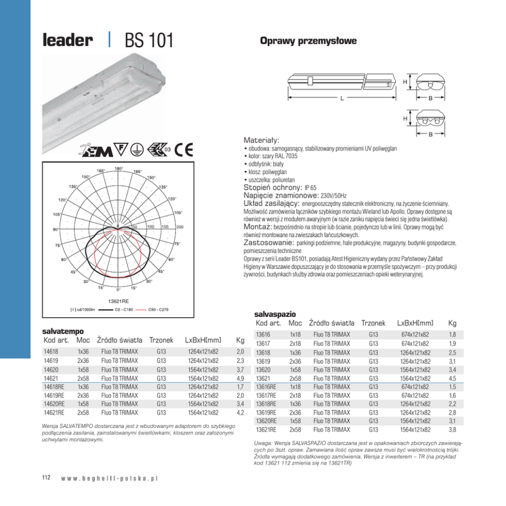leader BS 101 Oprawy przemysłowe Oprawy przemysłowe Materiały: Materiały: 50 100 150 • obudowa: samogasnący, stabilizowany promieniami UV poliwęglan obudowa: samogasnący, stabilizowany promieniami UV poliwęglan • kolor:• szary RAL 7035 • kolor: szary RAL 7035 • odbłyśnik: biały odbłyśnik: biały • klosz:•poliwęglan • klosz: poliwęglan • uszczelka: poliuretan • uszczelka: poliuretan Stopień ochrony: IP 65 Stopień ochrony: IP230V/50Hz 65 Napięcie znamionowe: UkładNapięcie zasilający: energooszczędny230V/50Hz statecznik elektroniczny, na życzenie ściemniany. znamionowe: Możliwość zamówienia łącznikówenergooszczędny szybkiego montażu Wielandelektroniczny, lub Apollo. Oprawy dostępne są Układ zasilający: statecznik na życzenie ściemniany. również w wersji z modułem awaryjnym (w razie zaniku napięcia świeci się jedna świetlówka). Możliwość zamówienia łączników szybkiego montażu Wieland lub Apollo. Oprawy dostępne są Montaż: bezpośrednio na stropie lub ścianie, pojedynczo lub w linii. Oprawy mogą być również w wersji z modułem awaryjnym (w razie zaniku napięcia świeci się jedna świetlówka). również montowane na zwieszakach łańcuszkowych. Montaż: bezpośrednio na stropie lub ścianie, pojedynczo lub w linii. Oprawy mogą być Zastosowanie: parkingi podziemne, hale produkcyjne, magazyny, budynki gospodarcze, równieżtechniczne montowane na zwieszakach łańcuszkowych. pomieszczenia parkingi podziemne, hale produkcyjne, budynki OprawyZastosowanie: z serii Leader BS101, posiadają Atest Higieniczny wydany przezmagazyny, Państwowy Zakładgospopomieszczenia techniczne Higienydarcze, w Warszawie dopuszczający je do stosowania w przemyśle spożywczym – przy produkcji Oprawy z serii służby Leaderzdrowia BS101, oraz posiadają Atest Higieniczny przez Państwowy Zakład żywności, budynkach pomieszczeniach opiekiwydany weterynaryjnej. 200 Higieny w Warszawie dopuszczający je do stosowania w przemyśle spożywczym – przy produkcji żywności, budynkach służby zdrowia oraz pomieszczeniach opieki weterynaryjnej. 13621RE salvaspazio Kod art. Moc salvatempo salvatempo Kod art. art. Moc Moc Źródło Źródłoświatła światła Trzonek Trzonek LxBxH (mm) Kod LxBxH[mm] KgKg 14618 14618 14619 14619 14620 14620 14621 14621 14618RE 14618RE 14619RE 14619RE 14620RE 14620RE 14621RE 14621RE 2,02,0 2,32,3 3,73,7 4,94,9 1,71,7 2,02,0 3,43,4 4,24,2 1x36 1x36 2x36 2x36 1x58 1x58 2x58 2x58 1x36 1x36 2x36 2x36 1x58 1x58 2x58 2x58 FluoT8T8TRIMAX TRIMAX Fluo FluoT8T8TRIMAX TRIMAX Fluo FluoT8T8TRIMAX TRIMAX Fluo FluoT8T8TRIMAX TRIMAX Fluo FluoT8T8TRIMAX TRIMAX Fluo Fluo FluoT8T8TRIMAX TRIMAX Fluo FluoT8T8TRIMAX TRIMAX Fluo FluoT8T8TRIMAX TRIMAX G13 G13 G13 G13 G13 G13 G13 G13 G13 G13 G13 G13 G13 G13 G13 G13 1264x121x82 1264x121x82 1264x121x82 1264x121x82 1564x121x82 1564x121x82 1564x121x82 1264x121x82 1264x121x82 1264x121x82 1264x121x82 1564x121x82 1564x121x82 1564x121x82 1564x121x82 Wersja SALVATEMPO dostarczana jest z wbudowanym adaptorem do szybkiego podłączenia Wersja SALVATEMPO dostarczana jest z wbudowanym adaptorem do szybkiego zasilania, zainstalowanymi świetlówkami, kloszem oraz założonymi uchwytami montażowymi. podłączenia zasilania, zainstalowanymi świetlówkami, kloszem oraz założonymi uchwytami montażowymi. Źródło światła Trzonek LxBxH[mm] Kg Fluo T8 TRIMAX G13 674x121x82 1,8 salvaspazio 1x18 Kod art. 2x18Moc 13617 13616 Źródło światła G13 Trzonek 674x121x82 LxBxH (mm) Fluo T8 TRIMAX Kg 1,9 13616 T8 TRIMAX G13G13 674x121x82 1,8 13618 1x361x18 FluoFluo T8 TRIMAX 1264x121x82 2,5 13617 2x18 Fluo T8 TRIMAX G13 674x121x82 1,9 13619 2x36 Fluo T8 TRIMAX G13 1264x121x82 3,1 13618 T8 TRIMAX G13G13 1264x121x82 2,5 13620 1x581x36 FluoFluo T8 TRIMAX 1564x121x82 3,4 13619 2x36 FluoFluo T8 TRIMAX G13G13 1264x121x82 3,1 13621 2x58 T8 TRIMAX 1564x121x82 4,5 13620 T8 TRIMAX G13G13 1564x121x82 3,4 13616RE 1x181x58 FluoFluo T8 TRIMAX 674x121x82 1,5 13617RE 2x182x58 FluoFluo T8 TRIMAX 674x121x82 1,6 13621 T8 TRIMAX G13G13 1564x121x82 4,5 13618RE T8 TRIMAX 1264x121x82 2,2 13616RE 1x361x18 FluoFluo T8 TRIMAX G13G13 674x121x82 1,5 13619RE T8 TRIMAX 1264x121x82 2,8 13617RE 2x362x18 FluoFluo T8 TRIMAX G13G13 674x121x82 1,6 13620RE T8 TRIMAX 1564x121x82 3,1 13618RE 1x581x36 FluoFluo T8 TRIMAX G13G13 1264x121x82 2,2 13621RE T8 TRIMAX 1564x121x82 3,8 13619RE 2x582x36 FluoFluo T8 TRIMAX G13G13 1264x121x82 2,8 13620RE 1x58 Fluo T8 TRIMAXjest w opakowaniach G13 1564x121x82 3,1 Uwaga: Wersja SALVASPAZIO dostarczana zbiorczych zawierających po 3szt. opraw. Zamawiana ilość opraw zawsze musi być1564x121x82 wielokrotnością trójki. 13621RE 2x58 Fluo T8 TRIMAX G13 3,8 Źródła wymagają dodatkowego zamówienia. Wersja z inwerterem – TR (na przykład Uwaga: Wersja SALVASPAZIO dostarczana jest w opakowaniach zbiorczych zawierających kodpo13621 112 zmienia się na 13621TR) 3szt. opraw. Zamawiana ilość opraw zawsze musi być wielokrotnością trójki. Źródła 112 114 www.beghelli-polska.pl wymagają dodatkowego zamówienia. Wersja z inwerterem – TR (na przykład kod 13621 zmienia się na 13621TR)