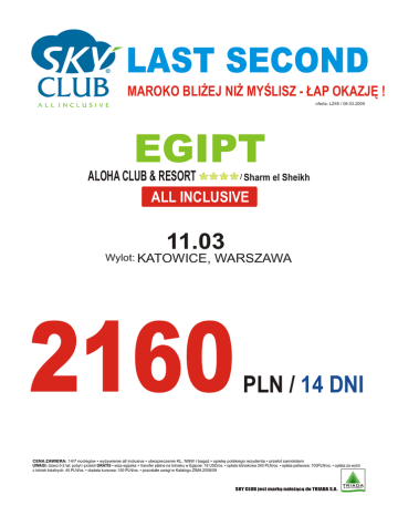 LAST SECOND MAROKO BLIŻEJ NIŻ MYŚLISZ - ŁAP OKAZJĘ ! oferta: LZ45 / 06.03.2009 EGIPT ALOHA CLUB & RESORT / Sharm el Sheikh ALL INCLUSIVE 11.03 Wylot: KATOWICE, WARSZAWA 2160 PLN / 14 DNI CENA ZAWIERA: 14/7 noclegów ▪ wyżywienie all inclusive ▪ ubezpieczenie KL, NNW i bagaż ▪ opiekę polskiego rezydenta ▪ przelot samolotem UWAGI: dzieci 0-2 lat: pobyt i przelot GRATIS ▪ wiza egipska + transfer płatne na lotnisku w Egipcie: 18 USD/os. ▪ opłata lotniskowa 240 PLN/os. ▪ opłata paliwowa: 100PLN/os. ▪ opłata za wylot z lotnisk lokalnych: 45 PLN/os. ▪ dopłata kursowa: 100 PLN/os. ▪ pozostałe uwagi w Katalogu ZIMA 2008/09 SKY CLUB jest marką należącą do TRIADA S.A. LAST SECOND MAROKO BLIŻEJ NIŻ MYŚLISZ - ŁAP OKAZJĘ ! oferta: LZ45 / 06.03.2009 EGIPT ALOHA CLUB & RESORT / Sharm el Sheikh ALL INCLUSIVE 18.03 Wylot: KATOWICE, WARSZAWA 1310 2030 PLN / 7 DNI PLN / 14 DNI CENA ZAWIERA: 14/7 noclegów ▪ wyżywienie all inclusive ▪ ubezpieczenie KL, NNW i bagaż ▪ opiekę polskiego rezydenta ▪ przelot samolotem UWAGI: dzieci 0-2 lat: pobyt i przelot GRATIS ▪ wiza egipska + transfer płatne na lotnisku w Egipcie: 18 USD/os. ▪ opłata lotniskowa 240 PLN/os. ▪ opłata paliwowa: 100PLN/os. ▪ opłata za wylot z lotnisk lokalnych: 45 PLN/os. ▪ dopłata kursowa: 100 PLN/os. ▪ pozostałe uwagi w Katalogu ZIMA 2008/09 SKY CLUB jest marką należącą do TRIADA S.A. LAST SECOND MAROKO BLIŻEJ NIŻ MYŚLISZ - ŁAP OKAZJĘ ! oferta: LZ45 / 06.03.2009 EGIPT NUBIAN ISLAND RESORT / Sharm el Sheikh ALL INCLUSIVE 11.03 Wylot: KATOWICE, WARSZAWA 2520 PLN / 14 DNI CENA ZAWIERA: 14/7 noclegów ▪ wyżywienie all inclusive ▪ ubezpieczenie KL, NNW i bagaż ▪ opiekę polskiego rezydenta ▪ przelot samolotem UWAGI: dzieci 0-2 lat: pobyt i przelot GRATIS ▪ wiza egipska + transfer płatne na lotnisku w Egipcie: 18 USD/os. ▪ opłata lotniskowa 240 PLN/os. ▪ opłata paliwowa: 100PLN/os. ▪ opłata za wylot z lotnisk lokalnych: 45 PLN/os. ▪ dopłata kursowa: 100 PLN/os. ▪ pozostałe uwagi w Katalogu ZIMA 2008/09 SKY CLUB jest marką należącą do TRIADA S.A. LAST SECOND MAROKO BLIŻEJ NIŻ MYŚLISZ - ŁAP OKAZJĘ ! oferta: LZ45 / 06.03.2009 EGIPT NUBIAN ISLAND RESORT / Sharm el Sheikh ALL INCLUSIVE 18.03 Wylot: KATOWICE, WARSZAWA 1690 2620 PLN / 7 DNI PLN / 14 DNI CENA ZAWIERA: 14/7 noclegów ▪ wyżywienie all inclusive ▪ ubezpieczenie KL, NNW i bagaż ▪ opiekę polskiego rezydenta ▪ przelot samolotem UWAGI: dzieci 0-2 lat: pobyt i przelot GRATIS ▪ wiza egipska + transfer płatne na lotnisku w Egipcie: 18 USD/os. ▪ opłata lotniskowa 240 PLN/os. ▪ opłata paliwowa: 100PLN/os. ▪ opłata za wylot z lotnisk lokalnych: 45 PLN/os. ▪ dopłata kursowa: 100 PLN/os. ▪ pozostałe uwagi w Katalogu ZIMA 2008/09 SKY CLUB jest marką należącą do TRIADA S.A.