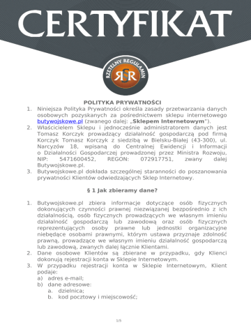 POLITYKA PRYWATNOŚCI 1. Niniejsza Polityka Prywatności określa zasady przetwarzania danych osobowych pozyskanych za pośrednictwem sklepu internetowego butywojskowe.pl (zwanego dalej: „Sklepem Internetowym”). 2. Właścicielem Sklepu i jednocześnie administratorem danych jest Tomasz Korczyk prowadzący działalność gospodarczą pod firmą Korczyk Tomasz Korczyk z siedzibą w Bielsku-Białej (43-300), ul. Narcyzów 18, wpisaną do Centralnej Ewidencji i Informacji o Działalności Gospodarczej prowadzonej przez Ministra Rozwoju, NIP: 5471600452, REGON: 072917751, zwany dalej Butywojskowe.pl. 3. Butywojskowe.pl dokłada szczególnej staranności do poszanowania prywatności Klientów odwiedzających Sklep Internetowy. § 1 Jak zbieramy dane? 1. Butywojskowe.pl zbiera informacje dotyczące osób fizycznych dokonujących czynności prawnej niezwiązanej bezpośrednio z ich działalnością, osób fizycznych prowadzących we własnym imieniu działalność gospodarczą lub zawodową oraz osób fizycznych reprezentujących osoby prawne lub jednostki organizacyjne niebędące osobami prawnymi, którym ustawa przyznaje zdolność prawną, prowadzące we własnym imieniu działalność gospodarczą lub zawodową, zwanych dalej łącznie Klientami. 2. Dane osobowe Klientów są zbierane w przypadku, gdy Klienci dokonują rejestracji konta w Sklepie Internetowym. 3. W przypadku rejestracji konta w Sklepie Internetowym, Klient podaje: a) adres e-mail; b) dane adresowe: a. dzielnica; b. kod pocztowy i miejscowość; 1/5 4. 5. 6. 7. c. kraj (państwo); d. ulica wraz z numerem domu/mieszkania; e. województwo. c) imię i nazwisko; d) płeć i data urodzenia; e) numer telefonu. Podczas rejestracji konta w Sklepie Internetowym Klient samodzielnie ustala indywidualne hasło dostępu do swojego konta. Klient może zmienić hasło, w późniejszym czasie, na zasadach opisanych w §4. W przypadku Przedsiębiorców, powyższy zakres danych jest dodatkowo poszerzony o: a) firmę Przedsiębiorcy; b) numer NIP. Podczas korzystania ze Stron Internetowych Sklepu mogą być pobierane dodatkowe informacje, w szczególności: adres IP przypisany do komputera Klienta lub zewnętrzny adres IP dostawcy Internetu, nazwa domeny, rodzaj przeglądarki, czas dostępu, typ systemu operacyjnego. Od Klientów mogą być także gromadzone dane nawigacyjne, w tym informacje o linkach i odnośnikach, w które zdecydują się kliknąć lub innych czynnościach, podejmowanych w naszym Sklepie Internetowym. § 2 Jak wykorzystujemy zebrane dane? 1. W przypadku dokonania rejestracji konta w Sklepie Internetowym dane Klientów wykorzystywane są w celu utworzenia indywidualnego konta i zarządzania tym kontem. 2. W przypadku dokonania zakupu w Sklepie Internetowym, dane osobowe mogą być przekazywane, w zależności od wyboru Klienta, następującym podmiotom w celu dostarczenia zamówionych towarów: a) firmie kurierskiej; b) Poczcie Polskiej S.A. z siedzibą w Warszawie. 3. Dane nawigacyjne mogą być wykorzystywane w celu zapewnienia Klientom lepszej obsługi, analizy danych statystycznych i dostosowania Sklepu Internetowego do preferencji Klientów, a także administrowania Sklepem Internetowym. § 3 Mechanizm cookies, adres IP 1. Sklep Internetowy używa niewielkich plików, zwanych cookies. Zapisywane są one przez Butywojskowe.pl na komputerze osoby odwiedzającej Sklep Internetowy, jeżeli przeglądarka internetowa na to pozwala. Plik cookie zwykle zawiera nazwę domeny, z której pochodzi, swój „czas wygaśnięcia" oraz indywidualną, losowo wybraną liczbę identyfikującą ten plik. Informacje zbierane za pomocą 2/5 2. 3. 4. 5. plików tego typu pomagają dostosowywać oferowane przez Butywojskowe.pl produkty do indywidualnych preferencji i rzeczywistych potrzeb osób odwiedzających Sklep Internetowy. Daje też możliwość opracowywania ogólnych statystyk odwiedzin prezentowanych produktów w Sklepie Internetowym. Butywojskowe.pl wykorzystuje dwa typy plików cookies: a) Cookies sesyjne: po zakończeniu sesji danej przeglądarki lub wyłączeniu komputera zapisane informacje są usuwane z pamięci urządzenia. Mechanizm cookies sesyjnych nie pozwala na pobieranie jakichkolwiek danych osobowych ani żadnych informacji poufnych z komputera Klientów. b) Cookies trwałe: są przechowywane w pamięci urządzenia końcowego Klienta i pozostają tam do momentu ich skasowania lub wygaśnięcia. Mechanizm cookies trwałych nie pozwala na pobieranie jakichkolwiek danych osobowych ani żadnych informacji poufnych z komputera Klientów. Butywojskowe.pl wykorzystuje cookies własne w celu: a) uwierzytelniania Klienta w Sklepie Internetowym i zapewnienia sesji Klienta w Sklepie Internetowym (po zalogowaniu), dzięki której Klient nie musi na każdej podstronie Sklepu Internetowego ponownie wpisywać loginu i hasła; b) analiz i badań oraz audytu oglądalności, a w szczególności do tworzenia anonimowych statystyk, które pomagają zrozumieć, w jaki sposób Klienci korzystają ze Strony Internetowej Sklepu, co umożliwia ulepszanie jej struktury i zawartości. Butywojskowe.pl wykorzystuje cookies zewnętrzne w celu: a) prezentowania treści multimedialnych na stronach internetowych Sklepu, które są pobierane z zewnętrznego serwisu internetowego www.youtube.com (administrator cookies zewnętrznego: Google Inc z siedzibą w USA); b) zbierania ogólnych i anonimowych danych statycznych za pośrednictwem narzędzi analitycznych Google Analytics (administrator cookies zewnętrznego: Google Inc z siedzibą w USA); c) prezentowania reklam dostosowanych do preferencji Klienta z wykorzystaniem narzędzia internetowej reklamy Google AdSense (administrator cookies zewnętrznego: Google Inc z siedzibą w USA); d) prezentacji Certyfikatu Rzetelny Regulamin za pośrednictwem serwisu internetowego rzetelnyregulamin.pl (administrator cookies zewnętrznego: Rzetelna Grupa sp. z o.o. z siedzibą w Warszawie). Mechanizm cookies jest