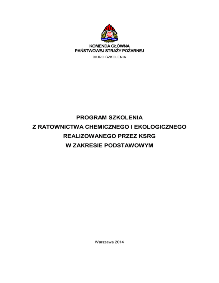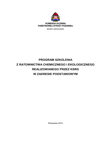 KOMENDA GŁÓWNA PAŃSTWOWEJ STRAŻY POŻARNEJ BIURO SZKOLENIA PROGRAM SZKOLENIA Z RATOWNICTWA CHEMICZNEGO I EKOLOGICZNEGO REALIZOWANEGO PRZEZ KSRG W ZAKRESIE PODSTAWOWYM Warszawa 2014 Opracowanie merytoryczne: bryg. Bogusław Dudek – KW PSP w Katowicach bryg. Rafał Jankowski – KG PSP st. kpt. Zdzisław Salamonowicz – SGSP st. kpt. Artur Ankowski – CS PSP w Częstochowie st. kpt. Paweł Fliszkiewicz – KW PSP w Warszawie kpt. Tomasz Otłowski – KW PSP w Poznaniu kpt. Michał Pająk – KW PSP w Kielcach mł. kpt. Dariusz Olcen – KM PSP w Elblągu Opracowanie metodyczne: Magdalena Stajszczak – KG PSP 2 Spis treści: I. ZAŁOŻENIA DYDAKTYCZNO-WYCHOWAWCZE strona 4 1. Cel szkolenia 4 2. Sylwetka absolwenta 4 3. Warunki przyjęcia na szkolenie 4 II. REALIZACJA PROCESU DYDAKTYCZNEGO 5 1. Organizacja szkolenia 5 2. Zalecenia i wskazówki metodyczne 5 3. Plan nauczania 6 III. TREŚCI KSZTAŁCENIA 7 1. Ratownictwo chemiczne i ekologiczne realizowane przez KSRG 7 2. Zagrożenia powodowane przez materiały niebezpieczne 8 3. Środki ochrony indywidualnej 10 4. Urządzenia i techniki pomiarowe 11 5. Techniki kontrolowania emisji substancji niebezpiecznych 12 6. Działania ratownicze 13 7. Dekontaminacja 14 Załączniki 15 3 Warszawa, dnia grudnia 2014 r. I. ZAŁOŻENIA DYDAKTYCZNO-WYCHOWAWCZE 1. Cel szkolenia Celem szkolenia jest przygotowanie ratownika do wykonywania zadań z ratownictwa chemicznego i ekologicznego realizowanego przez KSRG w zakresie podstawowym. 2. Sylwetka absolwenta Po ukończeniu szkolenia słuchacz powinien a) w sferze poznawczej: − omawiać zasady organizacji ratownictwa chemicznego i ekologicznego w KSRG, − wskazywać zagrożenia powodowane przez materiały niebezpieczne, − omawiać sposoby rozpoznania materiałów niebezpiecznych, − omawiać zasady prowadzenia działań ratownictwa chemicznego i ekologicznego, − omawiać sposoby ograniczania emisji substancji niebezpiecznych, − omawiać zasady BHP podczas działań ratownictwa chemicznego i ekologicznego, b) w sferze praktycznej: − dobierać środki ochrony indywidualnej, − obsługiwać urządzenia pomiarowe i odczytywać ich wyniki, − stosować techniki kontrolowania emisji substancji niebezpiecznych, − prowadzić działania ratownicze w zdarzeniach z zakresu ratownictwa chemicznego i ekologicznego, − prowadzić dekontaminację ludzi i sprzętu, c) w sferze motywacyjnej mieć ukształtowane postawy: − odpowiedzialności za zdrowie i życie swoje i innych, − odpowiedzialności za stan techniczny sprzętu, − odpowiedzialności za stan środowiska naturalnego. 3. Warunki przyjęcia kandydatów na szkolenie. Kandydat na szkolenie powinien posiadać skierowanie na szkolenie, według wzoru określonego w załączniku nr 1, potwierdzające określone w skierowaniu wymagania. 4 II. REALIZACJA PROCESU DYDAKTYCZNEGO 1. Organizacja szkolenia Szkolenie organizowane jest w szkołach Państwowej Straży Pożarnej i w ośrodkach szkolenia w komendach wojewódzkich Państwowej Straży Pożarnej. b) Podstawą organizacji procesu dydaktycznego jest plan nauczania. Podstawową formą nauczania jest lekcja, której odpowiada jedna godzina dydaktyczna trwająca 45 minut. Dopuszcza się łączenie dwóch jednostek lekcyjnych. c) Na realizację programu przewidziano 22 godziny dydaktyczne: − 13 godzin dydaktycznych teoretycznych, − 9 godzin dydaktycznych praktycznych*. d) Warunkiem ukończenia szkolenia jest obecność na 100% zajęć przewidzianych programem szkolenia oraz zaliczenie wszystkich elementów szkolenia określonych praktycznymi celami szczegółowymi. e) Słuchacz, który spełnił wymogi określone w punkcie d. otrzymuje zaświadczenie o ukończeniu szkolenia, zgodnie ze wzorem zawartym w załączniku nr 2. a) 2. Zalecenia i wskazówki metodyczne a) W celu prawidłowej realizacji zajęć praktycznych słuchaczy należy podzielić na grupy (w przypadku grupy szkoleniowej liczącej 20 słuchaczy – na dwie 10-osobowe grupy), zapewniające optymalny sposób realizacji zajęć oraz osiągnięcie przez każdego ze słuchaczy umiejętności opisanych praktycznymi celami szczegółowymi. b) Kadra dydaktyczna powinna śledzić zmiany wprowadzane w przepisach, zapoznawać się z wydawnictwami i prasą fachową oraz publikowanymi aktami prawnymi w celu aktualizowania materiałów niezbędnych do realizacji treści nauczania. c) Prowadzący zajęcia, w trakcie realizacji tematów przewidzianych w planie nauczania powinni zwracać szczególną uwagę na: − poprawną terminologię, − kształtowanie pożądanych umiejętności oraz koniecznych nawyków. d) Należy zapewnić warunki do realizacji celów dydaktycznych poprzez stosowanie różnorodnych form organizacji procesu nauczania. Skuteczność procesu dydaktycznego wymaga łączenia metod podających z metodami aktywizującymi. e) Realizację zajęć praktycznych ze słuchaczami należy poprzedzić instruktażem wstępnym, w czasie którego instruktor omawia m.in. temat, cel i organizację ćwiczeń oraz zapoznaje z budową i obsługą używanych pomocy oraz przepisami bhp. W czasie trwania ćwiczeń instruktor na bieżąco kontroluje w grupach poprawność wykonywania zadań i koryguje zauważone błędy i nieprawidłowości. Na zakończenie ćwiczeń, w ramach instruktażu końcowego, instruktor podsumowuje zajęcia, analizuje popełnione w czasie ćwiczeń błędy i przyczyny ich występowania oraz wskazuje prawidłowy sposób wykonania czynności. f) Zagadnienia bezpieczeństwa i higieny pracy powinny być zintegrowane z tematyką prowadzonych zajęć. W procesie nauczania należy zwracać uwagę na istniejące lub mogące wystąpić zagrożenia oraz wskazywać na sposoby bezpiecznego wykonywania zadań. * Przy założeniu, że grupa szkoleniowa liczy 20 słuchaczy, a zajęcia praktyczne realizowane są w dwóch 10-osobowych grupach, ćwiczących w tym samym czasie. W przypadku zwiększenia lub zmniejszenia liczby słuchaczy w grupi
