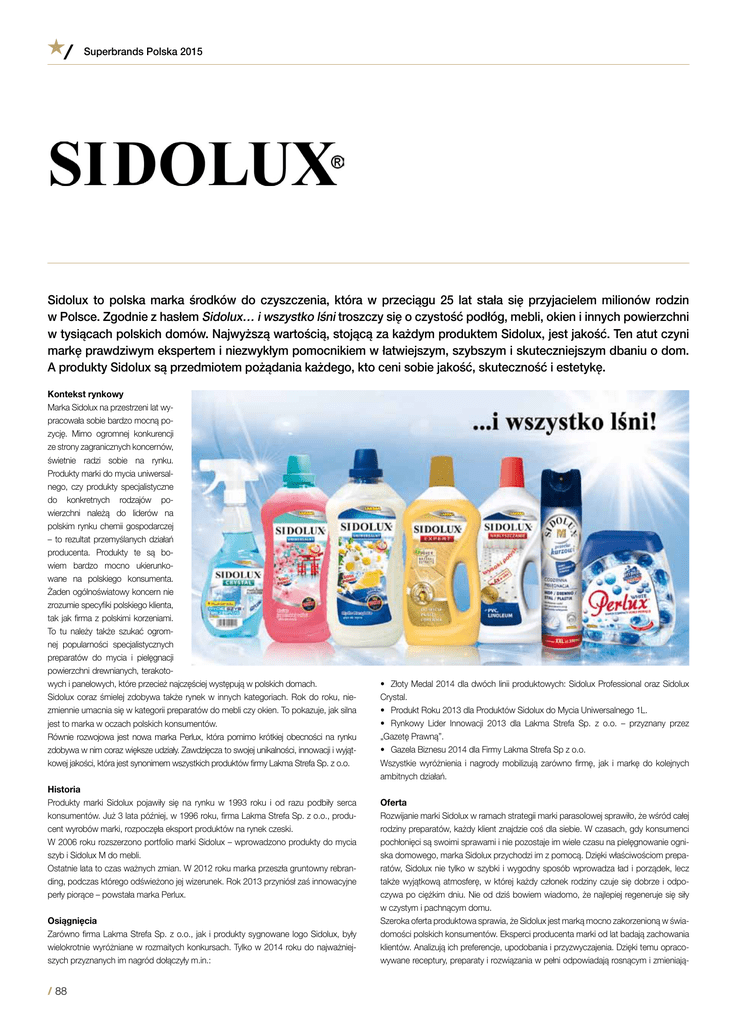 Superbrands Polska 2015 Sidolux to polska marka środków do czyszczenia, która w przeciągu 25 lat stała się przyjacielem milionów rodzin w Polsce. Zgodnie z hasłem Sidolux… i wszystko lśni troszczy się o czystość podłóg, mebli, okien i innych powierzchni w tysiącach polskich domów. Najwyższą wartością, stojącą za każdym produktem Sidolux, jest jakość. Ten atut czyni markę prawdziwym ekspertem i niezwykłym pomocnikiem w łatwiejszym, szybszym i skuteczniejszym dbaniu o dom. A produkty Sidolux są przedmiotem pożądania każdego, kto ceni sobie jakość, skuteczność i estetykę. Kontekst rynkowy Marka Sidolux na przestrzeni lat wypracowała sobie bardzo mocną pozycję. Mimo ogromnej konkurencji ze strony zagranicznych koncernów, świetnie radzi sobie na rynku. Produkty marki do mycia uniwersalnego, czy produkty specjalistyczne do konkretnych rodzajów powierzchni należą do liderów na polskim rynku chemii gospodarczej – to rezultat przemyślanych działań producenta. Produkty te są bowiem bardzo mocno ukierunkowane na polskiego konsumenta. Żaden ogólnoświatowy koncern nie zrozumie specyfiki polskiego klienta, tak jak firma z polskimi korzeniami. To tu należy także szukać ogromnej popularności specjalistycznych preparatów do mycia i pielęgnacji powierzchni drewnianych, terakotowych i panelowych, które przecież najczęściej występują w polskich domach. Sidolux coraz śmielej zdobywa także rynek w innych kategoriach. Rok do roku, niezmiennie umacnia się w kategorii preparatów do mebli czy okien. To pokazuje, jak silna jest to marka w oczach polskich konsumentów. Równie rozwojowa jest nowa marka Perlux, która pomimo krótkiej obecności na rynku zdobywa w nim coraz większe udziały. Zawdzięcza to swojej unikalności, innowacji i wyjątkowej jakości, która jest synonimem wszystkich produktów firmy Lakma Strefa Sp. z o.o. Historia Produkty marki Sidolux pojawiły się na rynku w 1993 roku i od razu podbiły serca konsumentów. Już 3 lata później, w 1996 roku, firma Lakma Strefa Sp. z o.o., producent wyrobów marki, rozpoczęła eksport produktów na rynek czeski. W 2006 roku rozszerzono portfolio marki Sidolux – wprowadzono produkty do mycia szyb i Sidolux M do mebli. Ostatnie lata to czas ważnych zmian. W 2012 roku marka przeszła gruntowny rebranding, podczas którego odświeżono jej wizerunek. Rok 2013 przyniósł zaś innowacyjne perły piorące – powstała marka Perlux. Osiągnięcia Zarówno firma Lakma Strefa Sp. z o.o., jak i produkty sygnowane logo Sidolux, były wielokrotnie wyróżniane w rozmaitych konkursach. Tylko w 2014 roku do najważniejszych przyznanych im nagród dołączyły m.in.: / 88 • Złoty Medal 2014 dla dwóch linii produktowych: Sidolux Professional oraz Sidolux Crystal. • Produkt Roku 2013 dla Produktów Sidolux do Mycia Uniwersalnego 1L. • Rynkowy Lider Innowacji 2013 dla Lakma Strefa Sp. z o.o. – przyznany przez „Gazetę Prawną”. • Gazela Biznesu 2014 dla Firmy Lakma Strefa Sp z o.o. Wszystkie wyróżnienia i nagrody mobilizują zarówno firmę, jak i markę do kolejnych ambitnych działań. Oferta Rozwijanie marki Sidolux w ramach strategii marki parasolowej sprawiło, że wśród całej rodziny preparatów, każdy klient znajdzie coś dla siebie. W czasach, gdy konsumenci pochłonięci są swoimi sprawami i nie pozostaje im wiele czasu na pielęgnowanie ogniska domowego, marka Sidolux przychodzi im z pomocą. Dzięki właściwościom preparatów, Sidolux nie tylko w szybki i wygodny sposób wprowadza ład i porządek, lecz także wyjątkową atmosferę, w której każdy członek rodziny czuje się dobrze i odpoczywa po ciężkim dniu. Nie od dziś bowiem wiadomo, że najlepiej regeneruje się siły w czystym i pachnącym domu. Szeroka oferta produktowa sprawia, że Sidolux jest marką mocno zakorzenioną w świadomości polskich konsumentów. Eksperci producenta marki od lat badają zachowania klientów. Analizują ich preferencje, upodobania i przyzwyczajenia. Dzięki temu opracowywane receptury, preparaty i rozwiązania w pełni odpowiadają rosnącym i zmieniają- sidolux cym się potrzebom klientów. W grupie prawie 150 produktów znajdziemy więc nie tylko środki do podłóg, z których marka jest znana najlepiej, ale także preparaty do mycia okien, pielęgnacji mebli oraz produkty specjalistyczne, stworzone z myślą o różnych powierzchniach. Choć zastosowanie środków Sidolux jest bardzo szerokie, to wszystkie preparaty tej marki łączy jedno – niezwykła jakość, nad którą każdego dnia czuwają specjaliści w nowoczesnym laboratorium. To dzięki ich pracy marka przoduje na polskim rynku pod kątem jakościowym, technologicznym i zapachowym. Miłośnicy czystości i pięknych zapachów z pewnością odnajdą odpowiednią dla siebie nutę zapachową spośród szerokiej gamy płynów do mycia uniwersalnego. Produkt o zapachu mydła marsylskiego, konwalii, bukietu wiosennych kwiatów, południowych cytrusów czy dalekowschodniego zapachu kwiatu japońskiej wiśni, wprowadzi do domu nie tylko ład i porządek, ale także cudowną atmosferę. Osoby oczekujące wyjątkowej pielęgnacji z pewnością znajdą produkt dla siebie wśród preparatów specjalistycznych i pielęgnacyjnych. Dbają one nie tylko o czystość konkretnej powierzchni, lecz także zabezpieczają czyszczone powierzchnie. Zastosowanie produktów specjalistycznych pozwala znacznie przedłużyć żywotność przedmiotów, która na co dzień nas otaczają: np. drewniane podłogi, armaturę łazienkową czy ulubione meble. Od kilkunastu miesięcy na rynku Sidolux ma nowego sprzymierzeńca. Są nim niezwykłe perły piorące Perlux. Łączą one w sobie to, co dla każdego konsumenta i jego ubrań jest najważniejsze – skuteczność proszku i delikatność żelu. Perlux to jedyne na rynku rozwiązanie, które gwarantuje czystość i świeżość prania, przy jednoczesnym zachowaniu bezpieczeństw