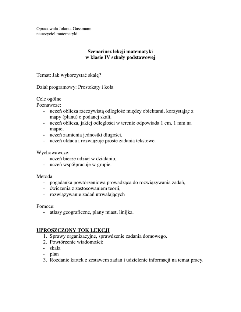 Opracowała Jolanta Gussmann nauczyciel matematyki Scenariusz lekcji matematyki w klasie IV szkoły podstawowej Temat: Jak wykorzysta skal ? Dział programowy: Prostok ty i koła Cele ogólne Poznawcze: - ucze oblicza rzeczywist odległo mi dzy obiektami, korzystaj c z mapy (planu) o podanej skali, - ucze oblicza, jakiej odległo ci w terenie odpowiada 1 cm, 1 mm na mapie, - ucze zamienia jednostki długo ci, - ucze układa i rozwi zuje proste zadania tekstowe. Wychowawcze: - ucze bierze udział w działaniu, - ucze współpracuje w grupie. Metoda: - pogadanka powtórzeniowa prowadz ca do rozwi zywania zada , - wiczenia z zastosowaniem teorii, - rozwi zywanie zada utrwalaj cych Pomoce: - atlasy geograficzne, plany miast, linijka. UPROSZCZONY TOK LEKCJI 1. Sprawy organizacyjne, sprawdzenie zadania domowego. 2. Powtórzenie wiadomo ci: - skala - plan 3. Rozdanie kartek z zestawem zada i udzielenie informacji na temat pracy. Zadanie 1(4 punkty) W Hadze, administracyjnej stolicy Holandii, doro li i dzieci ch tnie odwiedzaj park atrakcji – Madurodam. Znajduj si w nim setki miniaturowych zabytków zrekonstruowanych w skali 1 ÷ 25 . Jak wysoko w tej skali b dzie miała najwy sza budowla sakralna w Holandii – wie a katedry u Ultrechcie – mierz ca w rzeczywisto ci 112m. Zadanie 2 (4 punkty) Na mapie w skali 1 ÷ 4500000 odległo mi dzy stolic Macedonii – Skopje, a stolic Bo ni i Hercegowiny – Sarajewem wynosi 7 cm. Ile wynosi rzeczywista odległo mi dzy tymi miastami? Zadanie 3 (4 punkty) Turysta przywiózł z wycieczki do Pary a miniatur wie y Eiffla, głównej turystycznej atrakcji tego miasta, wykonan w skali 1 ÷ 2000 . Jej wysoko wynosiła 15 cm. Jak wysoko ma ta wie a w rzeczywisto ci? Zadanie 4 (4 punkty) Zmierz odległo dziel c Pary i Toru , a nast pnie korzystaj c ze skali oblicz, ile kilometrów dzieli te miasta? Zadanie 5 (6 punktów) Ułó cie dla swoich kolegów z innych grup dwa zadania na obliczanie rzeczywistych odległo ci na podstawie mapy lub planu i rozwi cie je w zeszytach. Nie zapomnijcie napisa , z którego planu lub mapy korzystali cie. 4. Omówienie rozwi za zada i wystawienie ocen. Za prac na lekcji wystawiłam oceny według nast puj cych kryteriów: Uzyskanie co najmniej: 19 punktów – ocena bardzo dobra 16 punktów – ocena dobra 11 punktów – ocena dostateczna 5. Podanie zadania domowego. Oblicz rzeczywist odległo z Torunia do Krakowa. Zapisz w jakiej skali została wykonana mapa, oraz jaka jest odległo mi dzy tymi miastami na planie.