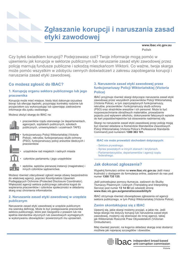Zgłaszanie korupcji i naruszania zasad etyki zawodowej www.ibac.vic.gov.au Polish Czy byłeś świadkiem korupcji? Podejrzewasz coś? Twoje informacje mogą pomóc w ujawnieniu jak korupcja w sektorze publicznym lub naruszanie zasad etyki zawodowej przez policję marnują fundusze publiczne i szkodzą mieszkańcom Wiktorii. Co ważne, twoja skarga może pomóc wszystkim w zdobyciu cennych doświadczeń z zakresu zapobiegania korupcji i naruszania zasad etyki zawodowej. Co możesz zgłosić do IBAC? 1. Korupcję organu sektora publicznego lub jego pracownika Korupcja może mieć miejsce, kiedy ktoś dokonuje oszustwa biorąc lub oferując łapówki, przyznając kontrakty rodzinie lub przyjaciołom czy wykorzystując lub ujawniając zastrzeżone informacje dla zysku osobistego. Możesz złożyć skargę do IBAC na: • p racowników rządu stanowego (w departamentach, agencjach, szpitalach publicznych, szkołach publicznych, uniwersytetach i uczelniach TAFE) • funkcjonariuszy Policji Wiktoriańskiej (Victoria Police), rekrutów, funkcjonariuszy służb ochrony (PSO), funkcjonariuszy policji aresztów śledczych i pracowników • urzędników rad miejskich i radnych miasta • członków parlamentu i jego urzędników • s ędziów, sędziów pierwszej instancji (magistrates) i innych członków sądownictwa. Możesz również zdecydować zgłosić swoje obawy bezpośrednio do właściwej agencji, poprzez Koordynatora Ujawnień Podlegających Ochronie (Protected Disclosure Coordinator). Większość agencji sektora publicznego zatrudnia kogoś do wspierania pracowników i członków społeczności w składaniu skarg oraz chronienia informatorów. 2. Naruszanie zasad etyki zawodowej w urzędzie publicznym Naruszanie zasad etyki zawodowej w urzędzie publicznym ma szeroką definicję. Może to być postępowanie pracownika sektora publicznego, które jest niezgodne z prawem lub nie spełnia standardów etycznych lub zawodowych wymaganych w wykonywaniu obowiązków i powierzonych mu uprawnień. 3. Naruszenie zasad etyki zawodowej przez funkcjonariuszy Policji Wiktoriańskiej (Victoria Police) IBAC przyjmuje również skargi dotyczące naruszania zasad etyki zawodowej przez wszystkich pracowników Policji Wiktoriańskiej (Victoria Police), w tym zaprzysiężonych funkcjonariuszy, rekrutów, pracowników i funkcjonariuszy służb ochrony (PSO) oraz strażników aresztów i ich personel. Może to być rozpowszechnianie obraźliwych materiałów, prowadzenie pojazdu pod wpływem alkoholu, dokonywanie fałszywych wpisów do kart pojazdów/rejestrów lub stosowanie nadmiernej siły. Skargi na naruszanie zasad etyki zawodowej przez policję mogą być również składane w Komendzie Standardów Zawodowych Policji Wiktoriańskiej (Victoria Police’s Professional Standards Command) pod numerem 1300 363 101. IBAC nie może prowadzić dochodzeń dotyczących: - Sektora prywatnego. - Spraw powstałych w innych stanach i terytoriach. - Parlamentarzystów, departamentów i agencji rządu federalnego. Jak dokonać zgłoszenia? Wypełnij formularz online na www.ibac.vic.gov.au Jeśli masz trudności z dostępem do formularza online, zadzwoń do nas pod numer 1300 735 135. Jeśli potrzebujesz pomocy tłumacza, zadzwoń do Służby Tłumaczy Pisemnych i Ustnych (Translating and Interpreting Service) pod numer 13 14 50 lub odwiedź stronę www.ibac.vic.gov.au/general/accessibility/tr IBAC otrzymuje również obowiązkowe zgłoszenia od agencji sektora publicznego, w tym Policji Wiktoriańskiej (Victoria Police). Zanim skontaktujesz się z IBAC Upewnij się, jakie skargi możemy przyjąć, a jakie nie. Jeśli twoja skarga nie dotyczy korupcji lub naruszenia zasad etyki zawodowej, możemy cię skierować do innej agencji, takiej jak Wiktoriański Rzecznik Praw Obywatelskich (Victorian Ombudsman). Miej również jasność, na kogo/co składasz skargę oraz dostarcz możliwie jak najwięcej szczegółów i dowodów. Będziesz chroniony Co IBAC robi z twoją informacją? IBAC postępuje z twoimi informacjami i danymi osobowymi w sposób ostrożny i poufny. Jeśli złożysz prawdziwą skargę: Zgodnie z prawem, IBAC nadaje pierwszeństwo zarzutom o poważną lub systemową korupcję oraz naruszanie zasad etyki zawodowej. Po wnikliwej ocenie skargi, IBAC może zdecydować: • n ikomu nie udostępnimy twojego imienia i nazwiska ani żadnych innych szczegółów osobistych • skierować skargę gdzie indziej • n ie możesz zostać zwolniony z pracy, poddany dyscyplinie lub zastraszony z powodu złożenia skargi • jesteś chroniony przed takimi postępowaniami prawnymi, jak o zniesławienie czy odpowiedzialność cywilną • twoi przyjaciele, rodzina i koledzy będą również chronieni. • prowadzić dochodzenie • umorzyć postępowanie. Aby pomóc w ustaleniu pierwszeństwa spraw, IBAC może również przeprowadzić wstępne dochodzenie dla poparcia swojej decyzji, co zrobić z twoją skargą. Jeśli twoja skarga będzie uznana, jako ujawnienie podlegające ochronie, sprawa ta będzie przedmiotem większych zabezpieczeń i ograniczeń. Jeśli jesteś bardzo zaniepokojony o swoją prywatność, możesz poprosić o dodatkowe zabezpieczenia: Chociaż nie możemy korzystać z wielu naszych szerokich uprawnień dochodzeniowych podczas wstępnego dochodzenia, możemy: Poufność Twoje dane osobowe będą traktowane w IBAC w sposób poufny, nawet jeśli twoja skarga zostanie przekazana innej agencji w celu zbadania. • pozwać osobę w celu przedstawienia dokumentów • zażądać dalszych informacji od kogokolwiek • wydać powiadomienie o poufności. Anonimowość Jeśli zdecydujesz się złożyć skargę anonimowo, nasze dochodzenie będzie ograniczone. A to dlatego, że nie możemy się z tobą skontaktować w celu uzyskania dodatkowych informacji czy przedyskutowania postępu dochodzenia. Twoje informacje są pomocne Niezależnie od wyniku twojej skargi, przekazane nam informacje pomagają nam zidentyfi