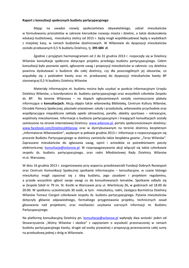 Raport z konsultacji społecznych budżetu partycypacyjnego Mając na uwadze rozwój społeczeństwa obywatelskiego, udział mieszkańców w formułowaniu priorytetów w zakresie kierunków rozwoju miasta i dzielnic, a także doskonalenia edukacji budżetowej, mieszkańcy stolicy od 2015 r. będą mogli współdecydować będą o wydatkach z miejskiej kasy, w ramach budżetów dzielnicowych. W Wilanowie do dyspozycji mieszkańców zostało przekazanych 0,5 % budżetu Dzielnicy, tj. 395 684 zł. Zgodnie z przyjętym harmonogramem od 2 do 31 grudnia 2013 r. rozpoczęły się w Dzielnicy Wilanów konsultacje społeczne dotyczące projektu przebiegu budżetu partycypacyjnego. Celem konsultacji było poznanie opinii, zgłoszenie uwag i propozycji mieszkańców w zakresie: czy dzielnica powinna dyskutować o budżecie dla całej dzielnicy, czy dla poszczególnych jej obszarów, co wiązałoby się z podziałem kwoty oraz nt. przekazanej do dyspozycji mieszkańców kwoty BP stanowiącej 0,5 % budżetu Dzielnicy Wilanów Materiały informacyjne nt. budżetu można było uzyskać w punkcie informacyjnym Urzędu Dzielnicy Wilanów, u koordynatora ds. budżetu partycypacyjnego oraz wszystkich członków Zespołu ds. BP. Na terenie Wilanowa – na słupach ogłoszeniowych zostały rozmieszczone plakaty informujące o konsultacjach. Akcją objęto także wilanowską Bibliotekę, Centrum Kultury Wilanów, Ośrodek Pomocy Społecznej, placówki oświatowe: szkoły i przedszkola, wilanowskie przychodnie oraz współpracujące niepubliczne zakłady opieki zdrowotnej, parafie, obiekty sportowo – rekreacyjne, wspólnoty mieszkaniowe. Informacje o budżecie partycypacyjnym i trwających konsultacjach zostały zamieszone na stronie internetowej Dzielnicy: www.wilanow.pl, portalu społecznościowym dzielnicy: www.facebook.com/DzielnicaWilanow oraz w dystrybuowanym na terenie dzielnicy bezpłatnym „Informatorze Wilanowskim”, wydanym w połowie grudnia 2013 r. Informacje o rozpoczynającym się procesie Budżetu Partycypacyjnego w dzielnicy zamieściła także bezpłatna gazeta: „Teraz Wilanów”. Zapraszano mieszkańców do zgłaszania uwag, opinii i wniosków za pośrednictwem poczty elektronicznej: [email protected]. W rozpropagowywanie akcji włączyli się także członkowie zespołu ds. budżetu partycypacyjnego, oraz radni Młodzieżowej Rady Dzielnicy Wilanów m.st. Warszawy. W dniu 16 grudnia 2013 r. zorganizowano przy wsparciu przedstawicieli Fundacji Dobrych Rozwiązań oraz Centrum Komunikacji Społecznej spotkanie informacyjno – konsultacyjne, w czasie którego mieszkańcy mogli zapoznać się z ideą budżetu, jego zasadami i projektem regulaminu, a przede wszystkim zgłosić swoje uwagi co do konsultowanych tematów. Spotkanie odbyło się w Zespole Szkół nr 79 im. St. Kostki w Warszawie przy ul. Wiertniczej 26, w godzinach od 18.00 do 20.00. W spotkaniu uczestniczyło 30 osób, w tym: mieszkańcy, radni, Zastępca Burmistrza Dzielnicy Wilanów Tomasz Ciorgoń członkowie zespołu ds. budżetu partycypacyjnego. Pytania mieszkańców dotyczyły głównie odpowiedniego, formalnego przygotowania projektu, technicznych zasad głosowania nad projektami, oraz możliwości uzyskania szerszych informacji nt. Budżetu Partycypacyjnego. Na platformę konsultacyjną Dzielnicy pn. [email protected] wpłynęły dwa wnioski: jeden od Stowarzyszenia „Wolny Wilanów i okolice” z zapytaniem o wysokość przeznaczonej w ramach budżetu partycypacyjnego kwoty, drugie od osoby prywatnej z propozycją przeznaczenia całej sumy na przebudowę jednej z dróg w Wilanowie. W dniu 16 stycznia 2014 r. Zarząd Dzielnicy Wilanów m.st. Warszawy Uchwałą nr 655/III/14 w sprawie realizacji budżetu partycypacyjnego w Dzielnicy Wilanów m.st. Warszawy przeznaczył na potrzeby budżetu partycypacyjnego kwotę 500 000,00 zł, co stanowi około 0,6 % planowanego budżetu Dzielnicy Wilanów na rok 2015. W załączeniu tabela z kwestiami poruszanymi przez mieszkańców Dzielnicy na spotkaniu. l.p. Autor Odniesienie, czego dotyczyła uwaga Treść Rozstrzygnięcie Dzielnicy Wilanów / Zespołu ds. budżetu partycypacyjnego w Dzielnicy Wilanów Uwaga uwzględniona Uzasadnienie Uwaga nieuwzględniona 1 mieszkaniec Regulamin – definicja mieszkańca Kto to jest mieszkaniec Warszawy? Jaka jest jego definicja jako osoby zgłaszającej projekt i głosującej? TAK Kwestie określa regulamin. 2 mieszkaniec Regulamin - projekty Jak projekty powinny wyglądać? Czy wystarczy wypełnić formularz? TAK Zgodnie z ‘”Formularzem zgłoszeniowym z propozycją projektu do budżetu partycypacyjnego w m.st. warszawa na rok 2015” 3 mieszkaniec Kto powinien podpisać się pod projektem? Czy sąsiedzi mogą podpisać się jeśli nie wiadomo czy są zameldowani? TAK Zgodnie z regulaminem – 15 osób (lista osób popierających propozycje projektu do budżetu partycypacyjnego w m.st. Warszawie) 4 mieszkaniec Regulamin - projekty Regulamin - projekty Czy przewidziane są projekty dla kilku połączonych dzielnic – międzydzielnicowe? Czy w razie przekroczenia przez projekty, które zbiorą największą liczbę głosów kwoty BP, to czy będzie poszukiwany projekt z pozycji niższych lokat? Wilanów jest bardzo zróżnicowany – obawa, o to, że projekty będą rozwiązywały bardzo lokalne problemy, a nie problem szerszy – to może spotkać się z niezadowoleniem. Jak zapobiec składania projektów, które nie mogą być zrealizowane? Potrzebna akcja informacyjna, aby nie tracić czasu mieszkańców i urzędników Złożone projekty będą sondą, która pokaże jakie działania brać w przyszłości pod uwagę, jak decydować o przyszłym podziale budżetu 5 mieszkaniec 6 mieszkaniec Regulamin - projekty 7 mieszkaniec Regulamin - projekty 8 mieszkaniec Regulamin - projekty 9 mieszkaniec Regulamin - projekty Czy to Zespół ds. budżetu Partycypacyjnego weryfikuje projekty? Regulamin - projekty 10 mieszkaniec Regulamin - projekt