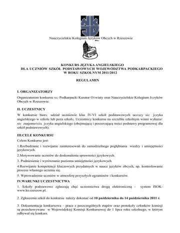 Nauczycielskie Kolegium Języków Obcych w Rzeszowie KONKURS JĘZYKA ANGIELSKIEGO DLA UCZNIÓW SZKÓŁ PODSTAWOWYCH WOJEWÓDZTWA PODKARPACKIEGO W ROKU SZKOLNYM 2011/2012 REGULAMIN I. ORGANIZATORZY Organizatorem konkursu są: Podkarpacki Kurator Oświaty oraz Nauczycielskie Kolegium Języków Obcych w Rzeszowie. II. UCZESTNICY W konkursie biorą udział uczniowie klas IV-VI szkół podstawowych uczący się języka angielskiego w szkole lub poza szkołą. Uczestnicy konkursu na szczeblu szkolnym winni wykazać się znajomością języka angielskiego (obejmującą i poszerzającą treści podstawy programowej dla szkół podstawowych). III.CELE KONKURSU Celem Konkursu jest: 1.Rozbudzanie i rozwijanie zainteresowań do samodzielnego pogłębiania wiedzy i umiejętności językowych. 2.Motywowanie uczniów do doskonalenia sprawności językowych. 3. Podniesienie i wyrównanie poziomu umiejętności językowych. 4.Rozwijanie kompetencji kluczowych przydatnych w nauce języków obcych, np. kontrolowanie procesu własnego uczenia się. 5. Wprowadzenie uczniów w atmosferę przyszłych egzaminów i konkursów. IV.WARUNKI UCZESTNICTWA 1. Szkoły podstawowe zgłaszają chęć uczestnictwa drogą elektroniczną www.ko.rzeszow.pl. system ISOK- 2. Zgłoszenia szkół do konkursu należy dokonać od 10 października do 14 października 2011 r. 3. Dokumentacja konkursowa – prace z poszczególnych etapów oraz protokoły członków komisji są przechowywane w Wojewódzkiej Komisji Konkursowej do 1 lipca roku szkolnego, w którym odbywał się konkurs. V.PRZEBIEG KONKURSU 1.Konkurs będzie przebiegał dwuetapowo: Etap I – eliminacje szkolne a) Eliminacje szkolne przeprowadzają poszczególne szkoły we własnym zakresie. Uczniowie zgłaszają się do konkursu, a nauczyciel zapoznaje ich z Regulaminem konkursu. Dyrektor Szkoły odpowiada za organizację. b) Dyrektor Szkoły zgłasza uczniów do udziału w konkursie poprzez system ISOK (Internetowy System Obsługi Konkursów) dostępny na stronie www.ko.rzeszow.pl. c) Dyrektor Szkoły powołuje Szkolną Komisję Konkursową, która to przeprowadza etap szkolny. d) Etap szkolny przewidziany jest na dzień 28 listopada 2011 r.(godz. 10.00). Zadania będą udostępnione w ISOK 2 dni przed konkursem. Hasło do zadań będzie podane w dniu danego konkursu o godzinie 9.00. Klucz odpowiedzi do zadań konkursowych będzie dostępny po zakończeniu konkursu na stronie www.nkjo-rz.neostrada.pl. oraz www.ko.rzeszow.pl. g) Na etapie szkolnym wymagania Konkursu obejmują sprawdzenie umiejętności czytania ze zrozumieniem, rozwiązywanie zadań gramatyczno-leksykalnych, sprawdzenie słownictwa oraz umiejętności pisania (czas testu: 60 min) h) Testy etapu szkolnego sprawdzane są przez Szkolną Komisję Konkursową. Komisja ta przesyła protokół z etapu szkolnego do Przewodniczącego Komisji Konkursowej (na adres Wojewódzkiej Komisji Konkursowej), najpóźniej do 9 grudnia 2011 r. (data stempla pocztowego) wraz z pracami uczniów, którzy uzyskali co najmniej 85% i więcej punktów. Przewodniczący i członkowie komisji szkolnych zobowiązani są do przestrzegania tajemnicy służbowej i regulaminów oraz zachowania bezstronności pod rygorem wyciągnięcia sankcji dyscyplinarnych. i) Listę rankingową uczniów zakwalifikowanych do etapu II wojewódzkiego ustala Przewodniczący Wojewódzkiej Komisji Konkursowej-z pośród zgłoszonych wyników kwalifikuje się nie więcej niż 200 uczniów. Lista uczniów zakwalifikowanych do etapu wojewódzkiego zostanie opublikowana na stronie kuratorium oraz na stronie www.nkjo-rz.neostrada.pl do 16 grudnia 2011 r. j) Wyniki konkursu etapu szkolnego ustalone przez Szkolną Komisję Konkursową i zatwierdzone przez dyrektora szkoły są ostateczne. Etap II -eliminacje wojewódzkie a) Eliminacje wojewódzkie przeprowadza Wojewódzka Komisja Kokursowa. Skład Komisji kompletuje Dyrektor Nauczycielskiego Kolegium Języków Obcych w Rzeszowie, a powołuje Podkarpacki Kurator Oświaty. Etap wojewódzki odbędzie się w czterech okręgach, adresy placówek, w których odbędą się eliminacje wojewódzkie zostaną podane na stronie organizatora konkursu www.ko.rzeszow.pl - www.nkjo-rz.neostrada.pl (Uwaga: w przypadku, gdy w danym okręgu liczba zakwalifikowanych uczniów będzie mniejsza niż 15, wówczas uczniowie przystępują do konkursu w najbliższym okręgu.) b) Etap wojewódzki przewidziany jest na dzień 16 lutego 2011 r. w danych okręgach. Przewodniczący Wojewódzkiej Komisji Konkursowej przedstawia listę uczestników etapu wojewódzkiego do danego okręgu organizującego konkurs. Testy są dostarczane w ilości odpowiadającej liczbie uczniów zakwalifikowanych do tego etapu w dniu przeprowadzania konkursu. c) Etap wojewódzki składa się z części pisemnej. Uczestnicy konkursu rozwiązują test zawierający: zadanie na czytanie ze zrozumieniem, słuchanie ze zrozumieniem, test gramatyczno-leksykalny z elementami wiedzy o krajach anglojęzycznych w zakresie kultury, literatury, historii, życia codziennego, który składa się wyłącznie z zadań zamkniętych oraz zadanie sprawdzające umiejętności pisania. Czas przeznaczony na wykonanie testu pisemnego wynosi 60 minut. e) Testy sprawdzane są przez Wojewódzką Komisję Konkursową. Wyniki etapu wojewódzkiego przesyłane będą do 29 lutego 2012 do Koordynatora konkursu. f) Wyniki zostaną opublikowane na stronie internetowej www.ko.rzeszow.pl oraz www.nkjo-rz.neostrada.pl do 15 marca 2012 r. g) Tytuł laureata konkursu otrzymują uczniowie, którzy uzyskali na etapie wojewódzkim co najmniej 85% punktów możliwych do zdobycia. Tytuł finalisty zostaje przyznany uczniom, którzy uzyskali co najmniej 65% punktów możliwych do zdobycia na etapie wojewódzkim. Laureaci (pierwsze trzy, najwyższe miejsca) otrzymują od organizatora konkursu dyplomy i nagrody. h) Udział w konkursie jest równoznaczny z wyrażeniem zgody na opublikowanie niezbędnych danych osobow