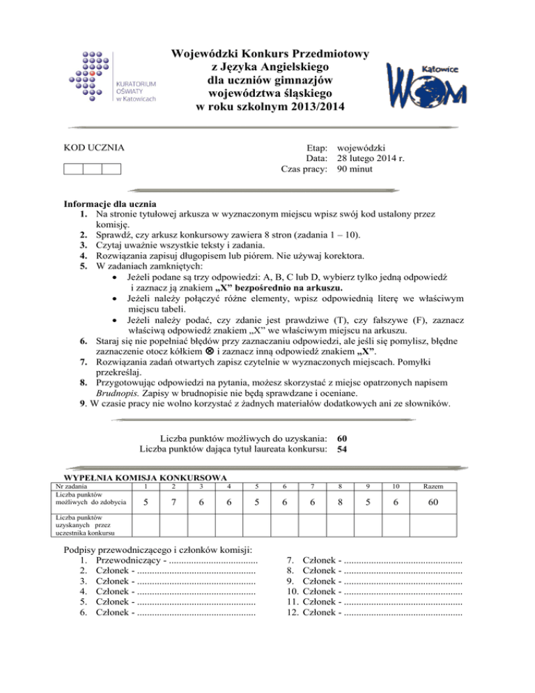 Wojewódzki Konkurs Przedmiotowy z Języka Angielskiego dla uczniów gimnazjów województwa śląskiego w roku szkolnym 2013/2014 Etap: wojewódzki Data: 28 lutego 2014 r. Czas pracy: 90 minut KOD UCZNIA Informacje dla ucznia 1. Na stronie tytułowej arkusza w wyznaczonym miejscu wpisz swój kod ustalony przez komisję. 2. Sprawdź, czy arkusz konkursowy zawiera 8 stron (zadania 1 – 10). 3. Czytaj uważnie wszystkie teksty i zadania. 4. Rozwiązania zapisuj długopisem lub piórem. Nie używaj korektora. 5. W zadaniach zamkniętych: Jeżeli podane są trzy odpowiedzi: A, B, C lub D, wybierz tylko jedną odpowiedź i zaznacz ją znakiem „X” bezpośrednio na arkuszu. Jeżeli należy połączyć różne elementy, wpisz odpowiednią literę we właściwym miejscu tabeli. Jeżeli należy podać, czy zdanie jest prawdziwe (T), czy fałszywe (F), zaznacz właściwą odpowiedź znakiem „X” we właściwym miejscu na arkuszu. 6. Staraj się nie popełniać błędów przy zaznaczaniu odpowiedzi, ale jeśli się pomylisz, błędne zaznaczenie otocz kółkiem i zaznacz inną odpowiedź znakiem „X”. 7. Rozwiązania zadań otwartych zapisz czytelnie w wyznaczonych miejscach. Pomyłki przekreślaj. 8. Przygotowując odpowiedzi na pytania, możesz skorzystać z miejsc opatrzonych napisem Brudnopis. Zapisy w brudnopisie nie będą sprawdzane i oceniane. 9. W czasie pracy nie wolno korzystać z żadnych materiałów dodatkowych ani ze słowników. Liczba punktów możliwych do uzyskania: 60 Liczba punktów dająca tytuł laureata konkursu: 54 WYPEŁNIA KOMISJA KONKURSOWA Nr zadania Liczba punktów możliwych do zdobycia 1 2 3 4 5 6 7 8 9 10 Razem 5 7 6 6 5 6 6 8 5 6 60 Liczba punktów uzyskanych przez uczestnika konkursu Podpisy przewodniczącego i członków komisji: 1. Przewodniczący - .................................... 2. Członek - ................................................ 3. Członek - ................................................ 4. Członek - ................................................ 5. Członek - ................................................ 6. Członek - ................................................ 7. 8. 9. 10. 11. 12. Członek - ................................................ Członek - ................................................ Członek - ................................................ Członek - ................................................ Członek - ................................................ Członek - ................................................ Zadanie 1 (0 – 5) Poniżej podano ważne wydarzenia historyczne. Do każdego wydarzenia dopasuj imię monarchy, który panował w tym okresie oraz nazwę dynastii, z której się wywodził. Odpowiedzi wpisz w odpowiednie miejsce w tabeli. Nazwa jednego monarchy i jednej dynastii została podana dodatkowo i nie pasuje do żadnego wydarzenia. Za każdą w pełni poprawną odpowiedź otrzymasz 1 punkt. KINGS/ QUEENS Charles II Elizabeth II Richard I the Lionheart William the Conqueror Elizabeth I Victoria HOUSES The Tudors The Plantagenets The Normans The Hanoverians The Windsors The Stuarts King / Queen House 1. Death of Princess Diana (1997) 2. English victory over the Spanish Armada (1588) 3. Opening of the London Underground (1863) 4. Battle of Hastings (1066) 5. Great Fire of London (1666) ...…../ 5 pkt Zadanie 2 (0 – 7) Uzupełnij brakujące informacje dotyczące Wielkiej Brytanii. Wpisz odpowiednie nazwy w języku angielskim. Za każdą w pełni poprawną odpowiedź otrzymasz 1 punkt. 1. The title of Prince of Wales, traditionally given to the successor to the British throne, is now held by .................................................................... (title and name). 2. .................................................................... (full name) , living in Sherwood Forest, was a legendary English outlaw who helped the poor. 3. Royal Ascot, attended by HM Elizabeth II, is a famous ................................................. (sport) event which takes place in June. 4. 'Speaker's Corner' is situated in ......................................................... (name) Park, in London. 5. The current British Prime Minister, ......................................................... (first name and surname), 6. lives at ................................................................ (address) Street. 7. ................................................................ (name) Pudding is a cooked mixture of eggs, flour and milk, traditionally served with roast meat and gravy. ...…../ 7 pkt Zadanie 3 (0 – 6) Uzupełnij luki, przekształcając wyraz w nawiasie tak, aby otrzymać logiczne i poprawne gramatycznie zdania. Wymagana jest pełna poprawność ortograficzna wpisywanych wyrazów. Za każdą poprawną odpowiedź otrzymasz 1 punkt. 1. There’s no industry or entertainment here. It’s a …................................. (RESIDE) district. 2. He considered himself a complete (FAIL) .............................. He had succeeded in nothing. 3. He can never make up his mind. He’s very (DECIDE)…………...................................….. . 4. I hope there will be no (REPEAT) …….........................……… of this shocking behaviour. 5. The doctor gave him an injection to (DEAD) …….................................…….. the pain. 6. "Excuse me, where's the (DEPART) ........................................................ lounge?" .....….p. / 6p. Zadanie 4 (0 – 6) Przetłumacz na język angielski podane w nawiasach fragmenty zdań, tak aby otrzymać logiczne i gramatycznie poprawne wypowiedzi. W częściach zdań w języku angielskim nie wolno niczego zmieniać. Za każdą poprawną odpowiedź otrzymasz 1 punkt. 1. (Co za okropna) ......................................................................... weather! Another rainy day. 2. As the meeting continued, the audience seemed to be (coraz mniej zainteresowani) ...................