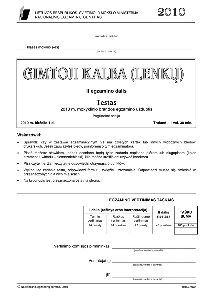 LIETUVOS RESPUBLIKOS ÐVIETIMO IR MOKSLO MINISTERIJA NACIONALINIS EGZAMINØ CENTRAS _________________________________________________________________________________________________ (savivaldybë, mokykla) _____ klasës mokinio (-ës) _________________________________________________________________________ (vardas ir pavardë) II egzamino dalis Testas 2010 m. mokyklinio brandos egzamino uþduotis Pagrindinë sesija 2010 m. birželio 1 d. Trukmė – 1 val. 30 min. Wskazówki: Sprawdź, czy w zestawie egzaminacyjnym nie ma czystych kartek lub innych widocznych błędów drukarskich. Jeżeli zauważyłeś błędy, poinformuj o tym egzaminatora. Pisać możesz ołówkiem, jednak oceniane będą tylko zadania napisane piórem lub długopisem (kolor atramentu, wkładu – ciemnoniebieski). Nie można kreślić ani używać korektora. Pisz czytelnie. Za nieczytelne odpowiedzi otrzymasz 0 punktów. Wykonując zadania testu, odpowiedzi formułuj zwięźle i zrozumiale. Odpowiedzi muszą się zmieścić w przeznaczonych dla nich miejscach. Na brudnopis jest przeznaczona ostatnia strona. EGZAMINO VERTINIMAS TAŠKAIS I dalis (rašinys arba interpretacija) Turinio vertinimas Raiðkos vertinimas Raðtingumo vertinimas 24 punkty 14 punktów 22 punkty II dalis (testas) TAŠKŲ SUMA 40 punktów 100 punktów Vertinimo komisijos pirmininkas: _______________________________________ (paraðas, vardas ir pavardë) Vertintojai (I) _______________________________________ (paraðas, vardas ir pavardë) (II) _______________________________________ (paraðas, vardas ir pavardë) © Nacionalinis egzaminø centras, 2010 101LEMU0 2010 m. gimtosios kalbos (lenkø) mokyklinis brandos egzaminas TESTAS Pagrindinë sesija TEKST I Ryszard Kapuściński ZAPROSZENIE DO GRUZJI Reportaż z tomu „Kirgiz schodzi z konia” (fragment) 1. Stół jest ogniskiem przyjaźni. Człowiek może istnieć tylko wśród przyjaciół. Największą karą dla Gruzina jest skazać go na samotność. Odcięty od innych, czuje się zagrożony, traci grunt pod nogami. Dopiero w gronie przyjaciół jest znowu sobą. Staje się na powrót elementem całości, gałęzią wyrastającą z pnia. Przyjaźń jest warunkiem życia i dlatego trzeba ją umacniać. Przyjaźń umacnia demonstracja. Stół jest okazją demonstrowania przyjaźni. Tak to jest rozumiane. 2. Za stołem wolno rozmawiać, ale z zachowaniem reguły obrządku. Reguła nie dopuszcza do żadnego chaosu, żadnego wiecowania, żadnego: panowie, dajcie mi wreszcie, do cholery, coś powiedzieć. Zagłoba to by nie wytrzymał w Gruzji jednego dnia. Można mówić, jak się dostanie głos. Ale i wtedy jest to mówienie specjalne: mówienie w formie toastu. Czym jest gruziński toast? Jest właśnie rodzajem rozmowy, jest etykietą i zarazem formą improwizacji panegirycznej1. Każdy, kto jest za stołem, dostanie głos i skwapliwie z niego skorzysta: wygłosi toast. Najpierw pójdą toasty obowiązkowe: za Gruzję, za przodków, za rodzinę, za partię przodowniczkę (...) A potem będzie seria toastów wzajemnych – jeden wznosi toast za drugiego. Toast mówi się kilka minut, można mówić pół godziny. Przy stole zapada cisza. Wszyscy słuchają z najwyższą uwagą. Jeżeli mówiącemu toast idzie dobrze, wszyscy kiwają głowami z uznaniem, jeżeli zaczyna mącić, odzywa się pomruk niezadowolenia. Toast to ważne exposé2, które się będzie potem długo dyskutować, roztrząsać, powtarzać. Są toasty, które przeszły do historii jak jakieś eposy czy kroniki. Są mistrzowie toastów, których się specjalnie zaprasza, bo pięknie improwizują. 3. Toast musi być poetycki, bo życiu trzeba dodawać piękna. Dobrze jest powiedzieć o błękicie nieba, o zapachu róż, o srebrnych wodach strumienia. Dobrze jest przyrównać wielkość człowieka do góry Kazbek, a jego wolę i upór do jodły wczepionej korzeniami w szczeliny skalne. Dobrze jest wyrazić nadzieję, że jutro będzie słoneczne i że plan wykonamy z nadwyżką. Najważniejsze jednak, żeby toast był afirmujący3, maksymalnie pozytywny. W tym jest zawarty cały sens obyczaju. Kto dostaje głos, wygłasza toast na cześć kogoś z obecnych. Nieważne, kim jest ten uczczony, jaka jest jego profesja, jakie jego talenty. Wystarczy, że siedzi przy stole, to znaczy, że został dopuszczony, a skoro tak, jest wspaniały, jest wielki, musi być wielki! I oto mając za swojego sąsiada przy stole cichego urzędnika poczty w Zugdidi4, dowiaduję się nagle z toastu, że to człowiek niezwykły, tytan pracy, dobry anioł, który roznosi po domach radość, dusza miasteczka, druh niezastąpiony i najlepszy, autor jakiegoś pomysłu, który zmienił pocztowe oblicze świata, przykładna głowa rodziny, wielbiony przez dzieci papa itd., itd. 4. Tak toczą się toasty, nastrój staje się wspaniały, bo każdemu dobrze, każdy po głowie pogłaskany. Jeden drugiemu może patrzeć w oczy. Jeden drugiego może mieć za brata. Ale te peany5 tylko dla niewprawnego ucha brzmią identycznie wysoko i pochwalnie. Kto ma rutynę, wie, że jest inaczej. W tych pochwałach jest gradacja, są setki niuansów, tysiące odcieni. Jednych chwalą bardzo, ale innych jeszcze bardziej! Ktoś dostaje pochlebstwo zwyczajne, a ktoś drugi pochlebstwo wspaniałe! A czas też się liczy. O jednym będą mówić pięć minut, a drugiemu dadzą dziesięć! Dadzą cały kwadrans! W takiej atmosferze samo jedzenie i picie spada do roli drugorzędnej, schodzi na margines. To wszystko jest wyparte przez toast. Wszystko pochłania toast. Biesiadnicy zajęci są toastem, sensem jego sformułowań, temperaturą wygłaszanych słów. W tych warunkach toast, choć zawsze pochwalny, ale jednak zróżnicowany, jednak stopniowany, staje się formą opinii publicznej, wyrazem poglądów otoczenia. (...) Toastem dwuznacznym można z kogoś pokpić, toast zbyt letni jest rozumiany jako krytyka. W tym obrzędzie toastów wyraża się kultura Gruzji. Gruzin nie będzi