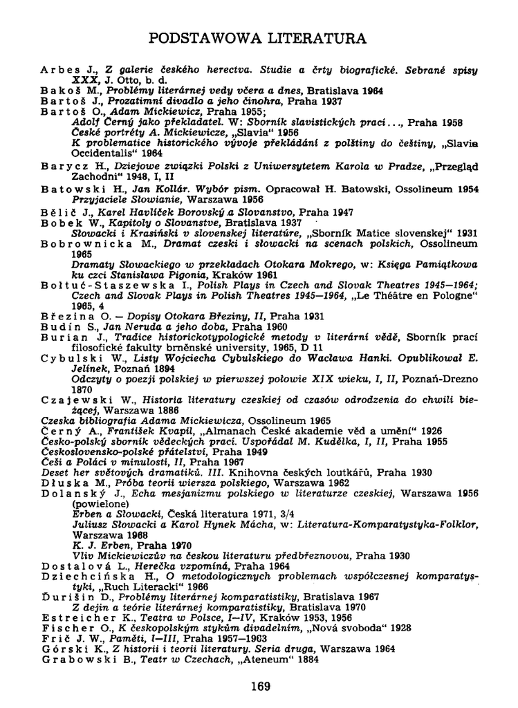 PODSTAWOWA LITERATURA A r b e s J . , Z galerie českého herectva. Studie a črty biografické. Sebrané spisy XXX, J . Otto, b. d. B a k o $ M . , Problémy literárně] vedy včera a dnes, B r a t i s l a v a 1064 B a r t o š J . , Prozatímní divadlo a jeho činohra, P r a h a 1937 B a r t o š O., Adam Mickiewicz, P r a h a 1955; Adolf Černý jako překladatel. W : Sborník slavistických práci..., P r a h a 1958 České portréty A. Mickiewicze, „Slávia" 1956 K problematice historického vývoje překládání z polštiny do češtiny, „Slávia Occidentalis" 1964 B a r y c z H . , Dziejowe związki Polski z Uniwersytetem Karola w Pradze, „Przegląd Zachodni" 1948, I, II B a t o w s k i H . , Jan Kollár. Wybór pism. Opracował H . Batowski, Ossolineum 1954 Przyjaciele Słowianie, Warszawa 1956 B ě l i č J., Karel Havlíček Borovský .a Slovanstvo, P r a h a 1947 B o b e k W., Kapitoly o Slovanstve, B r a t i s l a v a 1937 Słowacki i Krasiński v slovenskej literatuře, „Sborník Matice slovenskej" 1931 B o b r o w n i c k a M . , Dramat czeski i słowacki na scenach polskich, Ossolineum 1965 Dramaty Słowackiego w przekładach Otokara Mokrego, w : Księga Pamiątkowa ku czci Stanisława Pigonia, Kraków 1961 B o ł t u ć - S t a s z e w s k a I., Polish Plays in Czech and Slovák Theatres 1945—1964; Czech and Slovák Plays in Polish Theatres 1945—1964, „Le Théátre en Pologne" 1965, 4 B ř e z i n a O. — Dopisy Otokara Březiny, II, P r a h a 1931 B u d í n S., Jan Neruda a jeho doba, P r a h a 1960 B u r i a n J., Tradice historickotypologické metody v literární vědě, Sborník prací filosofické fakulty brněnské university, 1965, D 11 C y b u l s k i W., L i s t y Wojciecha Cybulskiego do Wacława Hanki. Opublikował E. Jelínek, Poznań 1894 Odczyty o poezji polskiej w pierwszej połowie XIX wieku, I, II, Poznań-Drezno 1870 C z a j e w s k i W., Historia literatury czeskiej od czasów odrodzenia do c h w i l i bie żącej, Warszawa 1886 Czeska bibliografia Adama Mickiewicza, Ossolineum 1965 Č e r n ý A . , František Kvapil, „Almanach České akademie věd a umění" 1926 česko-polský sborník vědeckých prací. Uspořádal M. Kudělka, I, II, P r a h a 1955 Československo-polské přátelství, Praha 1949 Ceši a Poláci v minulosti, II, P r a h a 1967 Deset her světových dramatiků. III. K n i h o v n a českých loutkářů, P r a h a 1930 D l u s k a M . , Próba teorii wiersza polskiego, Warszawa 1962 D o l a n s k ý J., Echa mesjanizmu polskiego w literaturze czeskiej, Warszawa 1956 (powielone) Erben o Słowacki, Česká literatura 1971, 3/4 Juliusz Słowacki a Karol Hynek Mácha, w : Literatura-Komparatystyka-Folklor, Warszawa 1968 K. J. Erben, P r a h a 1970 Vliv Mickiewiczův na českou literaturu předbřeznovou, P r a h a 1930 D o s t á l o v á L . , Herečka vzpomíná, P r a h a 1964 D z i e c h c i ń s k a H . , O metodologicznych problemach współczesnej komparatystyki, „Ruch L i t e r a c k i " 1966 Ď u r i š i n D., Problémy literárnej komparatistiky, B r a t i s l a v a 1967 Z dějin a teorie literárnej komparatistiky, B r a t i s l a v a 1970 E s t r e i c h e r K . , Teatra w Polsce, I-IV, Kraków 1953, 1956 F i s c h e r O., K českopolským stykům divadelním, „Nová svoboda" 1928 F r i c J . W., Paměti, l-IIl, P r a h a 1957-1963 G ó r s k i K . , Z historii i teorii literatury. Seria druga, Warszawa 1964 G r a b o w s k i B., Teatr w Czechach, „Ateneum" 1884 169 G r a b o w s k i T. S t , Dorobek literacko-naukowy Mariana Szyjkowskiego. W : Fran ku Wollmanovi k sedmdesátinám., P r a h a 1958 Romantyzm polski wśród Słowian. Wpływy i pokrewieństwa, Lwów, 1910 Słowacki w piśmiennictwach słowiańskich, „Pamiętnik L i t e r a c k i " 1909 Zygmunt Krasiński w piśmiennictwach słowiańskich, Kraków 1914 G u y a r d M . F., La liltěrature comparée, P a r i s 1958 H a h n W., Bibliografia w Dziełach wszystkich Juliusza Słowackiego Rok Słowackiego, Lwów 1911 Juliusz Słowacki w poezji polskiej (Antologia poetycka). Ułożył Wiktor Hahn, Wrocław 1955 H a n u s I., Stosunki polsko-czeskie na przestrzeni wieków, Poznań 1936 H e y d u k A . , Vzpomínky literární. Spisy LII, P r a h a 1911 H i 1 a r K . H . , Boje proti včerejšku, P r a h a 1925 H o f m a n L . K . , Sebrané spisy, I, II, P r a h a 1904, 1905 H o r a F . A . , Bronislav T. Grabowski. Obrázek jeho života a literární činnosti, Plzeň 1901 H o r á k J . , Pan Tadeusz w literaturách slovanských. W : Slovanský ústav A. Mickiewiczovi, Praha 1934 T. G . Masaryk a slovanské literatury, P r a h a 1931 Z dějin literatur slovanských. Stati a rozpravy. Redigovali a předmluvu na psali J. Dolanský a J. Thon, P r a h a 1948 H o v o r k a F. L . , Manželé spisovatelé. Nástin literární činnosti Bronislava a Marie Grabowských, „Světozor" 1880 H o r á l e k K . , Kapitoly z teorie překládání, P r a h a 1957 Počátky novočeského verse, P r a h a 1956 Studie o slovanském verši, „Sborník filologický" 1956 Zarys dziejów czeskiego wiersza, Ossolineum 1957 H r a b á k J . , K a p i t o l k y ze srovnávací metriky česko-polské, Ročenka pedagogické fakulty M U v Brně, 1947 Staropolský verš ve srovnání se staročeským, P r a h a 1937 Studie o českém verši, P r a h a 1959 Úvod do teorie verše, 3 wyd., P r a h a 1964 (Liczne studia, przeglądy, sprawozdania i recenzje z zakresu badań teoretycznoliterackich i wersologicznych) C h o j e c k i E., Czechia i Czechowie przy końcu pierwszej polowy XlXgo stulecia, I, II, B e r l i n 1847 H ý s e k M . , Antal Stašek, P r a h a 1933 Literární Morava v letech 1849—1885, P r a h a 1911 J a k ó b i e c M . , Świat słowiański Juliusza Słowackiego, Warszawa 1959 (powielone) U źródeł romantycznej ludowości niektórych literatur słowiańskich, „Pamiętnik Słowiański" 1963 J a k u b e c J . , Déjiny literatury české, 