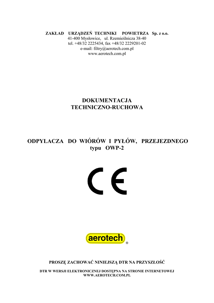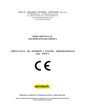 ZAKŁAD URZĄDZEŃ TECHNIKI POWIETRZA Sp. z o.o. 41-400 Mysłowice, ul. Rzemieślnicza 38-40 tel. +48/32 2225434, fax +48/32 2229201-02 e-mail: [email protected] www.aerotech.com.pl DOKUMENTACJA TECHNICZNO-RUCHOWA ODPYLACZA DO WIÓRÓW I PYŁÓW, PRZEJEZDNEGO typu OWP-2 PROSZĘ ZACHOWAĆ NINIEJSZĄ DTR NA PRZYSZŁOŚĆ DTR W WERSJI ELEKTRONICZNEJ DOSTĘPNA NA STRONIE INTERNETOWEJ WWW.AEROTECH.COM.PL ZAKŁAD URZĄDZEŃ TECHNIKI POWIETRZA Sp. z o.o. SPIS TREŚCI DTR OWP-2 1. Wiadomości ogólne 2. 2.1 2.2 2.3 2.3.1 2.3.2 2.3.3 2.3.4 Wyrób Przeznaczenie wyrobu Opis wyrobu Charakterystyka techniczna Dane techniczne Charakterystyka aerodynamiczna OWP-2 Zdjęcie odpylacza OWP-2 Rysunek odpylacza OWP-2 3. 3.1 3.2 3.3 3.3.1 3.3.2 3.3.3 WyposaŜenie odpylacza WyposaŜenie standardowe WyposaŜenie uzupełniające WyposaŜenie dodatkowe Rozdzielacze Przewody Worki na odpady wykonane z cienkiego brezentu 4. 4.1 4.2 4.3 Oznakowanie i transport odpylacza Oznakowanie Opakowanie i transport Rozpakowanie 5. 5.1 5.1.1 5.2 5.3 5.4 5.5 5.5.1 5.5.2 5.6 5.6.1 5.6.2 Instrukcja montaŜu, przygotowania do uruchomienia i konserwacji MontaŜ urządzenia Podłączenie elastycznego przewodu ssawnego i jego uziemienie Ustawienie urządzenia Podłączenie instalacji elektrycznej DemontaŜ i utylizacja Przygotowanie i uruchomienie Uruchomienie wstępne Uruchomienie eksploatacyjne Konserwacja, kontrola i serwis Konserwacja Przeglądy okresowe 6. 6.1 6.2 6.3 Eksploatacja Uruchamianie i zatrzymywanie odpylacza OpróŜnianie worków na odpady Eksploatacja filtrów 7. 7.1 7.2 7.2.1 7.2.2 7.2.3 7.2.4 Instrukcja bezpieczeństwa Niebezpieczeństwa podczas uruchamiania i eksploatacji Podstawowe wskazówki bezpieczeństwa Nieformalne środki bezpieczeństwa ZagroŜenie poŜarem ZagroŜenie energią elektryczną Szczególne miejsca zagroŜeń 8. Wykaz szybko zuŜywających się części strona 2 ZAKŁAD URZĄDZEŃ TECHNIKI POWIETRZA Sp. z o.o. 8.1 Kryteria wymiany szybko zuŜywających się części 9. Niedomagania urządzenia i sposoby ich usuwania 10. Wykaz podstawowych norm związanych 11. Karta Gwarancyjna (niedostępna w wersji elektronicznej) 12. Deklaracja Zgodności 13. Szczegółowy rysunek montaŜu odpylacza OWP-2 14. Schemat podłączenia wyłącznika silnikowego (niedostępna w wersji elektronicznej) OSTRZEśENIE: Odpylacza typu OWP-2 nie wolno uruchamiać zanim dokładnie nie przeczytasz i nie zrozumiesz wszystkich instrukcji, przepisów bezpieczeństwa i innych informacji zawartych w niniejszej DTR. Niestosowanie się do tego zalecenia moŜe być przyczyną powaŜnych wypadków – poŜaru, poraŜenia elektrycznego lub cięŜkiego zranienia. NaleŜy zachować na przyszłość niniejszą DTR, a takŜe często ją przeglądać w celu stałego zapewnienia bezpiecznej eksploatacji oraz instruowania innych osób, które mogą w przyszłości uŜywać tego urządzenia. DTR OWP-2 strona 3 ZAKŁAD URZĄDZEŃ TECHNIKI POWIETRZA Sp. z o.o. 1. Wiadomości ogólne Niniejsza Dokumentacja Techniczno – Ruchowa (DTR) zawiera instrukcje dotyczące bezpiecznego oddawania do eksploatacji odpylacza do wiórów i pyłów, przejezdnego typu OWP-2, oraz wytyczne w zakresie bezpieczeństwa podczas uruchamiania, przemieszczania, montaŜu, demontaŜu i utylizacji, konserwacji, obsługi i napraw oraz serwisu. Niniejsza DTR jest zgodna z zasadniczymi wymaganiami w zakresie bezpieczeństwa i ochrony zdrowia podczas projektowania oraz wytwarzania maszyn i elementów bezpieczeństwa. 2. Wyrób 2.1. Przeznaczenie wyrobu Przejezdny odpylacz do wiórów i pyłów typu OWP-2 jest nadciśnieniowym odpylaczem, słuŜącym do miejscowego odciągania, filtrowania i gromadzenia drobnych wiórów, powstających podczas obróbki technologicznej między innymi drewna, skóry, tkanin, tworzyw sztucznych, itp. materiałów suchych i nie klejących, których temperatura nie przekracza 60oC. Dla róŜnych zastosowań powinny być dobrane odpowiednie materiały filtracyjne. Odpylacz OWP-2 przeznaczony jest głównie do pracy z pojedynczą obrabiarką. MoŜliwe jest odpylanie z większej liczby stanowisk (maszyn) o ile zapotrzebowanie powietrza do ich odpylania nie przekroczy wydajności odpylacza. Odpylacz przeznaczony jest do pracy w pomieszczeniach, w zakresie występujących w nich temperatur (od -20oC do +40oC) i wilgotności do 90%. 2.2. Opis wyrobu ( patrz rysunek nr 2.3.3.) Obudowa (1) działa jako urządzenie ssące oraz jako uproszczony cyklon. Silnik z wirnikiem (2) zabudowany jest w obudowie odpylacza (1). Obudowa spoczywa na podstawie (3) posiadającej koła umoŜliwiające swobodne przemieszczanie odpylacza w dowolne miejsce pracy. Dwa filtry workowe (4) mocowane są do pierścieni górnej części obudowy za pomocą opasek mocujących (6). Pierścienie znajdują się symetrycznie po obu stronach silnika. Do pierścieni dolnej części obudowy mocowane są równieŜ opaskami (6) worki na odpady (7). Worki mogą być wykonane z folii, lub z brezentu. Workowe filtry powietrza podtrzymywane są w pozycji pionowej za pomocą prętów podtrzymujących (8) umieszczonych wewnątrz filtrów (tylko dla standardowych długości filtrów równej 1200mm. Dla filtrów wyŜszych - prętów podtrzymujących nie dostarcza się, i w takim przypadku filtry naleŜy podwiesić do stropu pomieszczenia). Na pokrywie puszki zaciskowej silnika zabudowany jest wyłącznik (9). Obudowa (1) posiada w centralnej części króciec ssawny ∅ 180 mm (5) skierowany do dołu, do którego mocowany jest, przy pomocy opaski, króciec przyłączeniowy ∅ 180 mm x 100 mm z siatką zabezpieczającą, do którego moŜe być zamocowany za pomocą opasek elastycznych wąŜ ssawny. Istnieje moŜliwość zastosowania stałych przewodów ssących, kształtek i rozdzielaczy z pominięciem króćca przyłączeniowego ∅ 180 mm x 100 mm z siatką zabezpieczającą, pod warunkiem, Ŝe łączna długość zastosowanych przewodów, kształtek i rozdzielaczy wynosi minimum 850 mm. Zmiany usytuow