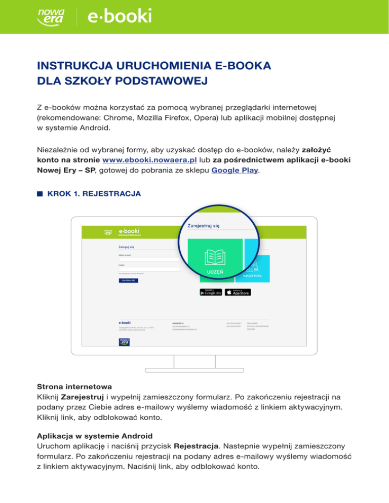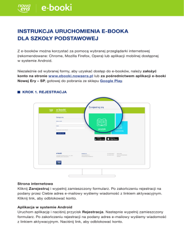 INSTRUKCJA URUCHOMIENIA E-BOOKA DLA SZKOŁY PODSTAWOWEJ Z e-booków można korzystać za pomocą wybranej przeglądarki internetowej (rekomendowane: Chrome, Mozilla Firefox, Opera) lub aplikacji mobilnej dostępnej w systemie Android. Niezależnie od wybranej formy, aby uzyskać dostęp do e-booków, należy założyć konto na stronie www.ebooki.nowaera.pl lub za pośrednictwem aplikacji e-booki Nowej Ery – SP, gotowej do pobrania ze sklepu Google Play. KROK 1. REJESTRACJA Strona internetowa Kliknij Zarejestruj i wypełnij zamieszczony formularz. Po zakończeniu rejestracji na podany przez Ciebie adres e-mailowy wyślemy wiadomość z linkiem aktywacyjnym. Kliknij link, aby odblokować konto. Aplikacja w systemie Android Uruchom aplikację i naciśnij przycisk Rejestracja. Nastepnie wypełnij zamieszczony formularz. Po zakończeniu rejestracji na podany adres e-mailowy wyślemy wiadomość z linkiem aktywacyjnym. Naciśnij link, aby odblokować konto. KROK 2. LOGOWANIE Strona internetowa Aby się zalogować, wpisz swój adres e-mail i hasło podane w trakcie rejestracji w pola widoczne w oknie przeglądarki internetowej. Aplikacja w systemie Android W pole Login wpisz swój adres e-mailowy, a w pole Hasło – hasło podane podczas rejestracji. Po zalogowaniu nastąpi przekierowanie do półki z książkami, czyli aplikacji, w której są widoczne okładki wszystkich dostępnych e-booków. KROK 3. AKTYWACJA E-BOOKA Strona internetowa Kliknij ikonę aktywacji podręczników. Pojawi się pole przeznaczone do wpisania kodu. Wpisz otrzymany od wydawnictwa kod aktywacyjny dla wybranego e-booka. Po aktywacji pojawi się okładka podręcznika, a sam e-book będzie gotowy do użytku. Aplikacja w systemie Android Naciśnij strzałkę w prawym górnym rogu ekranu i wpisz dowolny otrzymany od wydawnictwa kod aktywacyjny. Po aktywacji odblokowany e-book będzie gotowy do pobrania na urządzenie. Jeśli nie masz jeszcze kodu, napisz do nas: [email protected].