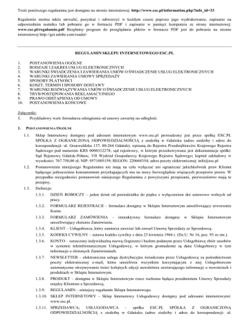 Treść poniższego regulaminu jest dostępna na stronie internetowej: http://www.esc.pl/information.php?info_id=33 Regulamin można także utrwalić, pozyskać i odtworzyć w każdym czasie poprzez jego wydrukowanie, zapisanie na odpowiednim nośniku lub pobranie go w formacie PDF i zapisanie w pamięci komputera ze strony internetowej: www.esc.pl/regulamin.pdf Bezpłatny program do przeglądania plików w formacie PDF jest do pobrania na stronie internetowej http://get.adobe.com/reader/ REGULAMIN SKLEPU INTERNETOWEGO ESC.PL 1. 2. 3. 4. 5. 6. 7. 8. 9. 10. POSTANOWIENIA OGÓLNE RODZAJE I ZAKRES USŁUG ELEKTRONICZNYCH WARUNKI ŚWIADCZENIA I ZAWIERANIA UMÓW O ŚWIADCZENIE USŁUG ELEKTRONICZNYCH WARUNKI ZAWIERANIA UMOWY SPRZEDAŻY SPOSOBY PŁATNOŚCI KOSZT, TERMIN I SPOSOBY DOSTAWY WARUNKI ROZWIĄZYWANIA UMÓW O ŚWIADCZENIE USŁUG ELEKTRONICZNYCH TRYB POSTĘPOWANIA REKLAMACYJNEGO PRAWO ODSTĄPIENIA OD UMOWY POSTANOWIENIA KOŃCOWE Załączniki: 1. Przykładowy wzór formularza odstąpienia od umowy zawartej na odległość. 1. POSTANOWIENIA O GÓLNE 1.1. Sklep Internetowy dostępny pod adresem internetowym www.esc.pl prowadzony jest przez spółkę ESC.PL SPÓŁKA Z OGRANICZONĄ ODPOWIEDZIALNOŚCIĄ z siedzibą w Gdańsku (adres siedziby i adres do korespondencji: ul. Grunwaldzka 137, 80-264 Gdańsk); wpisaną do Rejestru Przedsiębiorców Krajowego Rejestru Sądowego pod numerem KRS 0000312278; sąd rejestrowy, w którym przechowywana jest dokumentacja spółki: Sąd Rejonowy Gdańsk-Północ, VII Wydział Gospodarczy Krajowego Rejestru Sądowego; kapitał zakładowy w wysokości: 767.750,00 zł; NIP: 9571005159; REGON: 220668354; adres poczty elektronicznej: [email protected] 1.2. Postanowienia niniejszego Regulaminu nie mają na celu wyłączać ani ograniczać jakichkolwiek praw Klienta będącego jednocześnie konsumentem przysługujących mu na mocy bezwzględnie wiążących przepisów prawa. W przypadku niezgodności postanowień niniejszego Regulaminu z powyższymi przepisami, pierwszeństwo mają te przepisy. 1.3. Definicje: 1.3.1. DZIEŃ ROBOCZY – jeden dzień od poniedziałku do piątku z wyłączeniem dni ustawowo wolnych od pracy. 1.3.2. FORMULARZ REJESTRACJI – formularz dostępny w Sklepie Internetowym umożliwiający utworzenie Konta. 1.3.3. FORMULARZ ZAMÓWIENIA – interaktywny formularz dostępny w Sklepie Internetowym umożliwiający złożenie Zamówienia. 1.3.4. KLIENT – Usługobiorca, który zamierza zawrzeć lub zawarł Umowę Sprzedaży ze Sprzedawcą. 1.3.5. KODEKS CYWILNY – ustawa kodeks cywilny z dnia 23 kwietnia 1964 r. (Dz.U. Nr 16, poz. 93 ze zm.). 1.3.6. KONTO – oznaczony indywidualną nazwą (loginem) i hasłem podanym przez Usługobiorcę zbiór zasobów w systemie teleinformatycznym Usługodawcy, w którym gromadzone są dane Usługobiorcy w tym informacje o złożonych Zamówieniach. 1.3.7. NEWSLETTER – elektroniczna usługa dystrybucyjna świadczona przez Usługodawcę za pośrednictwem poczty elektronicznej e-mail, która umożliwia wszystkim korzystającym z niej Usługobiorcom automatyczne otrzymywanie treści kolejnych edycji newslettera zawierającego informacje o nowościach i produktach w Sklepie Internetowym. 1.3.8. PRODUKT – dostępna w Sklepie Internetowym rzecz ruchoma będąca przedmiotem Umowy Sprzedaży między Klientem a Sprzedawcą. 1.3.9. REGULAMIN – niniejszy regulamin Sklepu Internetowego. 1.3.10. SKLEP INTERNETOWY - Sklep Internetowy Usługodawcy dostępny pod adresami internetowymi: www.esc.pl. 1.3.11. SPRZEDAWCA; USŁUGODAWCA – spółka ESC.PL SPÓŁKA Z OGRANICZONĄ ODPOWIEDZIALNOŚCIĄ z siedzibą w Gdańsku (adres siedziby i adres do korespondencji: ul. Grunwaldzka 137, 80-264 Gdańsk); wpisana do Rejestru Przedsiębiorców Krajowego Rejestru Sądowego pod numerem KRS 0000312278; sąd rejestrowy, w którym przechowywana jest dokumentacja spółki: Sąd Rejonowy Gdańsk-Północ, VII Wydział Gospodarczy Krajowego Rejestru Sądowego; kapitał zakładowy w wysokości: 767.750,00 zł; NIP: 9571005159; REGON: 220668354; adres poczty elektronicznej: [email protected]. 1.3.12. UMOWA SPRZEDAŻY – Umowa Sprzedaży Produktu zawarta między Klientem, a Sprzedawcą za pośrednictwem Sklepu Internetowego. 1.3.13. USŁUGA ELEKTRONICZNA – usługa świadczona drogą elektroniczną przez Usługodawcę na rzecz Usługobiorcy za pośrednictwem Serwisu Internetowego. 1.3.14. USŁUGOBIORCA – osoba fizyczna posiadająca pełną zdolność do czynności prawnych, a w wypadkach przewidzianych przez przepisy powszechnie obowiązujące także osoba fizyczna posiadająca ograniczoną zdolność do czynności prawnych; osoba prawna albo jednostka organizacyjna nieposiadająca osobowości prawnej, której ustawa przyznaje zdolność prawną korzystająca z Usługi Elektronicznej. 1.3.15. ZAMÓWIENIE - oświadczenie woli Klienta stanowiące ofertę zawarcia Umowy Sprzedaży Produktu ze Sprzedawcą. 2. RODZAJE I ZAKRES USŁUG ELEKTRONICZNYCH 2.1. 3. Usługodawca świadczy za pośrednictwem Sklepu Internetowego następujące Usługi Elektroniczne: 2.1.1. Prowadzenie Konta w Sklepie Internetowym. 2.1.2. Umożliwienie złożenia Zamówienia w Sklepie Internetowym poprzez wypełnienie Formularza Zamówienia. 2.1.3. Newsletter. WARUNKI ŚWIADCZENIA I ZAWIERANIA UMÓW O ŚWIADCZENIE USŁUG ELEKTRONICZNYCH 3.1. Odpłatność: 3.1.1. 3.2. 3.3. 4. Świadczenie Usług Elektronicznych przez Usługodawcę jest nieodpłatne. Okres na jaki umowa zostaje zawarta: 3.2.1. Umowa o świadczenie Usługi Elektronicznej polegającej na prowadzeniu Konta w Sklepie Internetowym zawierana jest na czas nieoznaczony. 3.2.2. Umowa o świadczenie Usługi Elektronicznej polegającej na umożliwieniu złożenia Zamówienia w Sklepie Internetowym poprzez wypełnienie Formularza zamówienia zawierana jest na czas oznaczony i ulega rozwiązaniu z chwilą złożenia Zamówienia. 3.2.3. Umowa o świadczenie Usługi Elektronicznej Newsletter zawierana jest na czas nieozn