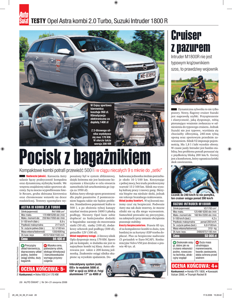 TESTY Opel Astra kombi 2.0 Turbo, Suzuki Intruder 1800 R Cruiser z pazurem Intruder M1800R nie jest typowym krążownikiem szos, to prawdziwy wojownik W Enjoy sportowa kierownica kosztuje 950 zł. Klimatyzacja elektroniczna za dopłatą 1400 zł Z 2-litrowego silnika wydobywa się moc 170 KM. W ofercie także wersja 200 KM Pocisk z bagażnikiem Dynamiczna sylwetka to nie tylko pozory. Nowy, flagowy cruiser Suzuki jest naprawdę szybki. Przyspieszenie i elastyczność, jaką dysponuje, robią piorunujące wrażenie zwłaszcza w odniesieniu do typowego cruisera. Jednak Suzuki nie jest typowe, wyróżnia się chociażby olbrzymią, 240-mm tylną oponą oraz sportowym przednim zawieszeniem. Silnik V2 imponuje pojemnością. Ma 1,8 l i lubi wysokie obroty. W czasie jazdy Intruder jest bardzo stabilny, bez problemu potrafi poruszać się z prędkością bliską 200 km/h. Gorzej jest z komfortem, który ogranicza krótki skok zawieszenia. Kompaktowe kombi potrafi przewieźć 500 l i w ciągu niecałych 9 s mknie do „setki” Nad wo zie/ja kość. Karoseria Astry udanie łączy praktyczność kompaktu oraz dynamiczną stylistykę kombi. We wnętrzu znajdziemy także sportowe akcenty. Są tu mocno wyprofilowane fotele Recaro, gruba skórzana kierownica oraz chromowane wstawki na desce rozdzielczej. Testowy egzemplarz wy- ASTRA III KOMBI 2.0 TURBO Silnik/pojemność R4/1998 cm3 Moc maks. 170 KM/5200 obr./min Maks. moment obr. 250 Nm/1950 obr./min 0-100 km/h (fabr.) 8,9 s Pr´dkoÊç maksymalna 217 km/h Śr. zużycie paliwa (fabr.) 9,1 l/100 km Masa własna/ładowność 1350/600 kg Dł./szer./wys 4515/1804/1500 mm 84 400 z∏ Precyzyjny układ kierowniczy, dopracowany układ jezdny, świetne osiągi silnika, duży bagażnik Wysoka cena, paliwożerny silnik, obsługa klimatyzacji i kierunkowskazów wymaga przyzwyczajenia Licznik do 240 km/h to nie pomyłka, ten cruiser osiąga ponad 200 km/h SUZUKI INTRUDER M1800R Silnik/pojemność V2/1783 cm3 Moc maks. 125 KM/ 6200 obr./min Maks. moment obr. 160 Nm/3200 obr./min 0-100 km/h (test.) 4,2 s Prędkośc maksymalna ponad 200 km/h Śr. zużycie paliwa (test.) 6,8 l/100 km Masa własna/ładowność 315/- kg Dł./szer./wys. 2480/875/1185 mm Cena 53 000 z∏ Doskonałe osiągi, dobre jak na cruisera własności jezdne, nowoczesna technika, atrakcyjny wygląd Duża masa utrudniająca manewrowanie, twarde zawieszenie, słaba ochrona przed wiatrem OCENA KOŃCOWA: 4+ Konkurenci: Honda VTX 1800, Kawasaki Vulcan 2000, Triumph Rocket III s Konkurenci: Volvo V50 2.4 170 KM Interaktywny system jazdy IDS+ to wydatek 5000 zł. ESP w opcji za 3250 zł. Felgi aluminiowe 17” za 4000 zł ładowana jednostka średnio potrzebuje około 10 l/100 km. Korzystając z pełnej mocy, bez trudu przekroczymy wartość 15 l/100 km. Silnik ma wysoką kulturę pracy i rasowy gang. Skrzynia biegów ma nieduże skoki, jednak nie toleruje brutalnego traktowania. Uk∏ad jezd ny/kom fort. W tej kwestii możemy czuć się bezpieczni. Podwozie Astry ma tak duże rezerwy, że mocne silniki nie są dla niego wyzwaniem. Samochód prowadzi się precyzyjnie, na zakrętach i przy zmianie obciążenia pozostaje stabilny. Kosz ty/bez pie czeń stwo. Prawie 85 tys. zł za kompaktowe kombi to dużo, tym bardziej że za kurtyny i ESP trzeba dopłacać. Plus za bezpieczne nadwozie (5 gwiazdek w Euro-NCAP). Konkurencyjne Volvo V50 jest droższe o prawie 40 tys. zł. s s OCENA KOŃCOWA: 5s Fot. Robert Magdziak, Wojciech Denisiuk Cena posażony był w system zbliżeniowy, dzięki któremu nie jest konieczne korzystanie z kluczyka w celu otwarcia samochodu lub uruchomienia go (opcja za 1950 zł). Kabina Astry oferuje sporo przestrzeni dla piątki pasażerów. Z pomieszczeniem bagażu także nie będzie problemu. Standardowa pojemność kufra to 500 l, a po złożeniu tylnej kanapy uzyskać można prawie 1600 l i płaską podłogę. Niestety Opel każe sobie dopłacać za funkcjonalne dodatki w bagażniku: zaczepy do mocowania siatki (50 zł), siatkę (100 zł), dodatkowy schowek pod podłogą (500 zł), gniazdko 12V (100 zł). Uk∏ad na pę do wy/osią gi. 2-litrowy silnik Opla dysponuje mocą 170 KM. Sporo jak na kompakt, w dodatku nie jest to najszybsze kombi tej klasy. Astra oferowana jest także z 200-konną jednostką. Znakomite osiągi silnika okupione są wysokim spalaniem. Do- 28 AUTO ŚWIAT | Nr 34 • 21 sierpnia 2006 28_AS_34_06_01.indd 28 17.8.2006 15:28:42