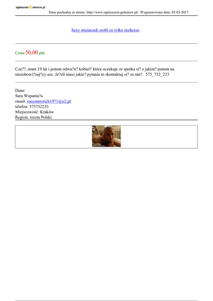 Dane pochodzą ze strony: http://www.ogloszenia-goleniow.pl/. Wygenerowano dnia: 03-03-2017. Sexy misiaczek zrobi co tylko zechcesz Cena:50,00 pln Cze??, mam 19 lat i jestem odwa?n? kobiet? która oczekuje ze spotka si? z jakim? panem na niezobowi?zuj?cy sex. Je?eli masz jakie? pytania to skontaktuj si? ze mn?. 575_752_233 Dane: Sara Wspania?a email: [email protected] telefon: 575752233 Miejscowość: Kraków Region: reszta Polski