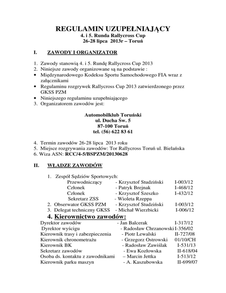 REGULAMIN UZUPEŁNIAJĄCY 4. i 5. Runda Rallycross Cup 26-28 lipca 2013r – Toruń I. ZAWODY I ORGANIZATOR 1. Zawody stanowią 4. i 5. Rundę Rallycross Cup 2013 2. Niniejsze zawody organizowane są na podstawie : • Międzynarodowego Kodeksu Sportu Samochodowego FIA wraz z załącznikami • Regulaminu rozgrywek Rallycross Cup 2013 zatwierdzonego przez GKSS PZM • Niniejszego regulaminu uzupełniającego 3. Organizatorem zawodów jest: Automobilklub Toruński ul. Ducha Św. 5 87-100 Toruń tel. (56) 622 83 61 4. Termin zawodów 26-28 lipca 2013 roku 5. Miejsce rozgrywania zawodów: Tor Rallycross Toruń ul. Bielańska 6. Wiza ASN: RCC/4-5/BSPZM/20130628 II. WŁADZE ZAWODÓW 1. Zespół Sędziów Sportowych: Przewodniczący - Krzysztof Studziński Członek - Patryk Brejnak Członek - Krzysztof Szeszko Sekretarz ZSS - Wioleta Rzeppa 2. Obserwator GKSS PZM - Krzysztof Studziński 3. Delegat techniczny GKSS - Michał Wierzbicki I-003/12 I-468/12 I-432/12 I-003/12 I-006/12 4. Kierownictwo zawodów: Dyrektor zawodów - Jan Balcerak I-317/12 Dyrektor wyścigu - Radosław Chrzanowski I-356/02 Kierownik trasy i zabezpieczenia - Piotr Lewalski II-727/08 Kierownik chronometrażu - Grzegorz Ostrowski 01/10/CH Kierownik BK - Radosław Zawiślak I-531/13 Sekretarz zawodów - Ewa Kozłowska II-618/04 Osoba ds. kontaktu z zawodnikami – Marcin Jettka I-513/12 Kierownik parku maszyn - A. Kaszubowska II-699/07 Komisarz ds. ochrony środowiska Lekarz zawodów III. – Stanisław Marasek - TBA PROGRAM ZAWODÓW Piątek: 16:00 16:00 16:00-20:00 16:00-21:00 20.00 Sobota: 08:00 09:00-09:45 09:45 10:15 10:30-11:15 11:30 12:00 Otwarcie Biura Zawodów Otwarcie Parku Maszyn Odbiór Administracyjny Badanie Kontrolne I posiedzenie ZSS (część pierwsza) (analiza i sprawdzenie dokumentów zawodów) Otwarcie Biura Zawodów Trening Wolny I posiedzenie ZSS (część druga) Obowiązkowa Odprawa z zawodnikami /kierowcami Trening Oficjalny II posiedzenie ZSS I kwalifikacja 15 minut po I kwalifikacji - II kwalifikacja 15 minut po II kwalifikacji - III kwalifikacja III posiedzenie ZSS 16:00 Finały 15 min po Finałach – Bieg Handicap IV posiedzenie ZSS 17:30 Wręczenie nagród 18:00-20:00 Badanie Kontrolne dla V Rundy RCC Niedziela: 08:00 Otwarcie Biura Zawodów 09:00-09:45 Trening Wolny 09;45 I posiedzenie ZSS 10:15 Odprawa z zawodnikami /kierowcami 10:30-11:15 Trening Oficjalny 11:30 II posiedzenie ZSS 12:00 I kwalifikacja 15 minut po I kwalifikacji - II kwalifikacja 15 minut po II kwalifikacji - III kwalifikacja III posiedzenie ZSS 16:00 Finały 15 min po Finałach – Bieg Handicap IV posiedzenie ZSS 17:30 Wręczenie nagród IV. POSTANOWIENIA OGÓLNE 1. Wszystkich zawodników / kierowców obowiązuje całkowity zakaz treningów na torze poza wyznaczonymi godzinami, jak również na terenie dróg dojazdowych i parku maszyn, pod rygorem kary finansowej do wykluczenia z zawodów włącznie. 2. Treningi wolne zostaną zorganizowane wg harmonogramu zawodów. Będą miały formę wyjazdu na 3 okrążenia toru. W czasie przeznaczonym na trening wolny, ilość wyjazdów dowolna. 3. Na zawodniku / kierowcy spoczywa obowiązek prawidłowego wypełnienia zgłoszenia oraz umieszczenia w serwisie Inside PZM kompletu wymaganych, aktualnych dokumentów (określonych w pkt. 8.1.4. Regulaminu RCC). Dokumenty umieszczone na Inside PZM będą udostępnione do wglądu organizatorom zawodów PZM w celu zweryfikowania ich przed OA. Formularz zgłoszenia wypełnia zawodnik/kierowca wyłącznie przez stronę internetową zgloszenia.pzm.pl dostępną na www.inside.pzm.pl. Po prawidłowym wypełnieniu, dołączeniu potwierdzenia wpłaty wpisowego i zatwierdzeniu zgłoszenie zostanie automatycznie wysłane pocztą elektroniczną do danego organizatora oraz do zawodnika na wskazany przez niego w formularzu adres e-mail. Zgłoszenie będzie przyjęte tylko i wyłącznie po opłaceniu wpisowego. 4. Zgłoszenia www.inside.pzm.pl 5. Terminy zgłoszeń: • 1 termin zgłoszeń upływa z dniem: 11.07.2013 • 2 termin zgłoszeń upływa z dniem: 19.07.2013 6. Wysokość wpisowego na rundę Rallycross Cup wynosi: dla zawodników prywatnych w I terminie dla zawodników prywatnych w II terminie za zespół sponsorski od każdego kierowcy w I terminie za zespół sponsorski od każdego kierowcy w II terminie Jedna runda 400,- PLN Dwie rundy 600,- PLN 600,- PLN 800,- PLN 60,- PLN 100,- PLN 80,- PLN 150,- PLN 7. Podział na Grupy / Klasy: Grupa AWD - Klasa Supercars – samochody z napędem na 4 koła zgodne z Regulaminem FIA CEZ Rallycross Championship 2013; dopuszczone są auta z utraconą homologacją, (lub auta , w których wygasła homologacja) - Klasa Proto – auta z napędem na 4 koła zgodne z Regulaminem Rallycross Cup (Zał. nr 1 Regulamin Techniczny Grupy H dla regulaminu Rallycross Cup). Min. waga (łącznie z kierowcą i jego wyposażeniem) zgodnie z Art. 279 Załącznika J do MKS (zwanego dalej Zał. J). Dla klas Grup Supercars oraz Proto z silnikami doładowanymi, dla silników wolnossących obowiązuje przelicznik zgodny z art. 252.3.1 do 252.3.5 Zał. J. +1600-2000 cm3 = 1100 kg; +2000-2500 cm3 = 1130 kg; +2500-3000 cm3 = 1210 kg; +3000-3500 cm3 = 1300 kg; +3500-4000 cm3 = 1380 kg Grupa Super1600 Samochody z napędem na przednią oś, zgodne z art. 279 Zał. J dopuszczone są dopuszcza się auta z wygasłą homologacją, Grupa SuperNationals Samochody z napędem na 2 koła, również z utraconą homologacją o pojemności skokowej silnika do 4000 cm3, zgodne z Regulaminem Dywizji SuperNationals dla FIA CEZ Rallycross Championship 2013, lub Regulaminu Technicznego Grupy H dla Rallycross Cup 2013, lub Art. 254 Zał. J (Grupa N). Podział na klasy pojazdów z Grupy SuperNationals - Pojazdy Grupy H (pojazdy Grupy SuperNationals spełniające ww. wymagania inne niż Art. 254 Zał. J dla Grupy N oraz Art. 260 Zał. J. dla Grupy R) podzielone będą według pojemności skokowej (przeliczeniowej) silnika na poniższe klasy: Klasa H0 do 652 cm3