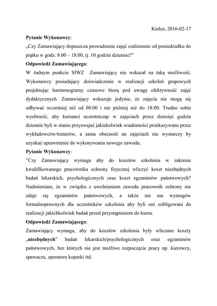 Kielce, 2016-02-17 Pytanie Wykonawcy: „Czy Zamawiający dopuszcza prowadzenie zajęć codziennie od poniedziałku do piątku w godz. 8.00 – 18.00, tj. 10 godzin dziennie?” Odpowiedź Zamawiającego: W żadnym punkcie SIWZ Zamawiający nie wskazał na taką możliwość. Wykonawcy posiadający doświadczenie w realizacji szkoleń grupowych projektując harmonogramy czasowe biorą pod uwagę efektywność zajęć dydaktycznych. Zamawiający wskazuje jedynie, że zajęcia nie mogą się odbywać wcześniej niż od 08:00 i nie później niż do 18:00. Trudno sobie wyobrazić, aby kursanci uczestnicząc w zajęciach przez dziesięć godzin dziennie byli w stanie przyswajać jakiekolwiek wiadomości przekazywane przez wykładowców/trenerów, a sama obecność na zajęciach nie wystarczy by uzyskać uprawnienie do wykonywania nowego zawodu. Pytanie Wykonawcy: ”Czy Zamawiający wymaga aby do kosztów szkolenia w zakresie kwalifikowanego pracownika ochrony fizycznej wliczyć koszt niezbędnych badań lekarskich, psychologicznych oraz koszt egzaminów państwowych? Nadmieniam, że w związku z uwolnieniem zawodu pracownik ochrony nie zdaje się egzaminów państwowych, a także nie ma wymogów formalnoprawnych dla uczestników szkolenia aby byli oni zobligowani do realizacji jakichkolwiek badań przed przystąpieniem do kursu. Odpowiedź Zamawiającego: Zamawiający wymaga, aby do kosztów szkolenia były wliczane koszty „niezbędnych” badań lekarskich/psychologicznych oraz egzaminów państwowych, bez których nie jest możliwe rozpoczęcie pracy np. kierowcy, spawacza, operatora koparki itd. Pytanie Wykonawcy: „Zwracamy się z prośbą o informację jaka jest dopuszczalna maksymalna liczba godzin zajęć w ciągu dnia lub w ciągu tygodnia na kursie spawalniczym (część 4 zamówienia). Jednocześnie informujemy, że zgodnie z wytycznymi Instytutu Spawalnictwa dopuszczalna liczba godzina zajęć dydaktycznych wynosi 10. Odpowiedź Zamawiającego: Wykonawca projektuje harmonogram szkolenia w taki sposób, aby zajęcia odbywały się w godzinach od 08:00 do 18:00. Biorąc jednak pod uwagę możliwości przyswajania przez kursantów specjalistycznej wiedzy spawalniczej nie może być akceptacji dla haromonogramu opartego na modelu codziennie 10 godzin zajęć. W ciągu tygodnia może wystąpić maksymalnie jeden dzień z wymiarem 10 godzin szkolenia.