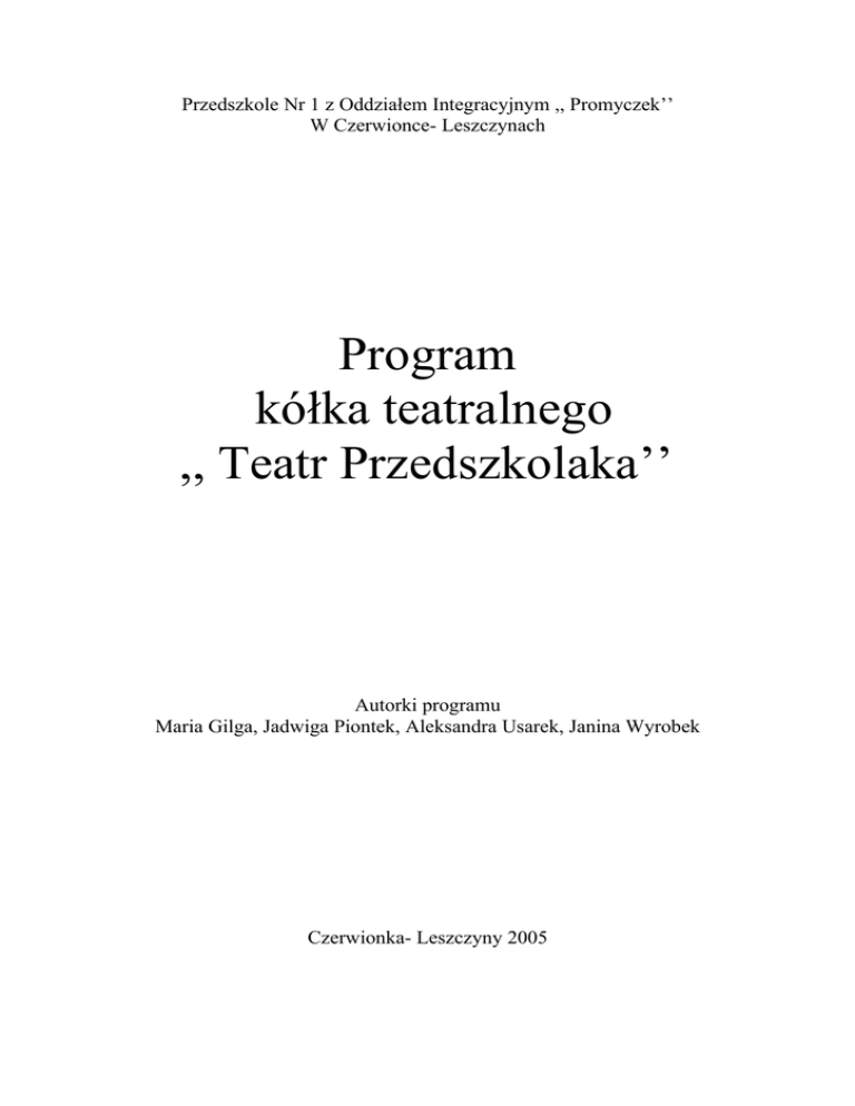 Przedszkole Nr 1 z Oddziałem Integracyjnym ,, Promyczek’’ W Czerwionce- Leszczynach Program kółka teatralnego ,, Teatr Przedszkolaka’’ Autorki programu Maria Gilga, Jadwiga Piontek, Aleksandra Usarek, Janina Wyrobek Czerwionka- Leszczyny 2005 Spis treści Wstęp …………………………………………………….2 Cele ogólne……………………………………………….3 Cele szczegółowe…………………………………………3 Metody i formy……………………………………………4 Przewidywane osiągnięcia…………………………………5 Treści……………………………………………………….6 Uwagi o realizacji………………………………………….8 Ewaluacja………………………………………….………9 Literatura…………………………………………………..10 Wstęp Teatr w życiu dziecka jest bardzo ważnym czynnikiem wspomagającym rozwój, podobnie jak zabawa i książka. Zajęcia teatralne uaktywniają fantazję dziecka, a także marzenia i zainteresowania. Opierają się przede wszystkim na zabawie. W trakcie spotkań dzieci pracują nad umacnianiem wiary w siebie sprawdzają i rozwijają swoje umiejętności: autorskie, wokalne, a także organizacyjne. Inscenizacje uczą współpracy w zespole, odpowiedzialności, tolerancji, kształtują ogromne więzi emocjonalne między członkami zespołu. Zajęcia te będą dla dzieci przyjemnością, zabawą i ciekawym sposobem spędzania wolnego czasu. Cele ogólne 1. Rozbudzanie zainteresowań dzieci teatrem. 2. Przygotowanie do świadomego uczestnictwa w kulturze, obcowania ze sztuką, bywania w teatrze. 3. Rozwijanie wrażliwości estetycznej. 4. Udział w życiu kulturalnym przedszkola i środowiska. Cele szczegółowe Dziecko : • poznaje nowe słownictwo, • wzbogaca swoją wyobraźnię, • uczy się wrażliwości i inwencji twórczej, doskonali pamięć mechaniczną i logiczną, • uczy się ról społecznych, • rozwija uzdolnienia aktorskie i muzyczne, potrafi na miarę swoich możliwości odbierać sztukę teatralną, • uczy się odpowiedzialności i wytrwałości, rzetelności w pracy, • poznaje utwory literackie, wzmacnia poczucie własnej wartości. Przewidywane osiągnięcia 1. Poznawanie różnorodnych form teatralnych. 2. Kontrolowanie własnej wymowy i posługiwanie się poprawną polszczyzną. 3. Zapoznanie dzieci z wybranymi utworami literackimi. 4. Wygłaszanie ról z pamięci z zastosowaniem odpowiedniej intonacji, znaków przystankowych, modulacji i siły głosu, a także z wykorzystaniem sposobów poruszania się po scenie. 5. Integracja zespołu grupowego. 6. Twórcze uczestnictwo w życiu przedszkolnym i społecznym. 7. Zaspokojenie potrzeby uznania i poczucia własnej wartości. 8. Wyrażanie w sposób werbalny i niewerbalny różnorodnych emocji. Treści • ,, Teatr Przedszkolaka’’- prezentacja przedstawień • Przedstawienia dla dzieci naszego przedszkola • Przedstawienia dla rodziców • Przedstawienia dla szkół SP1, SP3 • Udział w przeglądach Teatralnych i Recytatorskich,, Bliskie Spotkania’’ Ponadto realizowane są następujące zadania 1. Analiza treści utworu- omawianie i ocenianie postępowania bohaterów z próba uzasadnienia własnego stanowiska. 2. Ćwiczenie dykcji, modulacji głosu mimiki i gestu. 3. Tworzenie scenografii z udziałem rodziców- dekoracja teatralna i kostiumy. 4. Teatr lalek – kukiełki, pacynki. 5. Ekspresja artystyczna: ruch scenicznym rytmika, spontaniczna postawa. 6. Percepcja filmów i sztuki teatralnej- wyjazdy na spektakle do Teatru Banialuka w Bielsku Białej. 7. Reklama- zawiadomienie, ogłoszenie, plakaty, zaproszenia na przedstawienia. Uwagi o realizacji programu 1. Prowadzenie cotygodniowych zajęć trwających w godzinach od 13.00 do 13, 45z chętnymi dziećmi, zapisanymi przez rodziców na zajęcia dodatkowe, bezpłatne. 2. Prowadzenie kroniki teatralnej. 3. Organizowanie przedstawień dla rodziców, dzieci przedszkolnych i szkolnych. 4. Udział w konkursach i przeglądach teatralnych. 5. Prowadzenie cyklu spotkań z rodzicami celu przygotowania dekoracji, pomocy w transporcie rekwizytów i scenek, opieki nad dziećmi9 w czasie wyjazdów na występy 6. Ankieta dla rodziców w celu uzyskania informacji o wpływie kółka teatralnego na twórczy rozwój dziecka. 7. Wywiad z dzieckiem. Ewaluacja Ewaluacja pozwoli nam sprawdzić czy zamierzone cele zostały osiągnięte i czy podjęte działania przyniosły jakikolwiek skutek. Pozwoli nam to na kontynuowanie i poszerzanie działań bądź i zaniechanie. W celu sprawdzenia realizacji naszych zadań ważne będą dla nas opinie rodziców i dzieci. Do uzyskania tych opinii posłuży nam ankieta dla rodziców i wywiad oraz obserwacja dzieci. Wyniki ewaluacji będą opracowane w formie wniosków na podstawie w/w narzędzi badawczych i zostaną przedstawione Radzie Pedagogicznej oraz rodzicom. Literatura 1. Ciarkowska., U Sienkiewicz M., Wilczewski A., Baśniowy świat na scenie Wydawnictwo ,, Innowacje’’ s.c.1999 2. Szczepańska M., Program autorski jak go napisać? Wyd. IMANE 1999 3. Wierzbicka U. Szkolny teatr małych form w moim doświadczeniu pedagogicznym Warszawa, W S i P 1979 4. Fiatowska T., Przedstawienia na dzień dobry i na do widzenia Wydawnictwo Didasko Warszawa 1997 5. Kamińska – Bayer., Baśnie i legendy przedstawiają nam dzieciaki Wydawnictwo Akord Poznań 2005