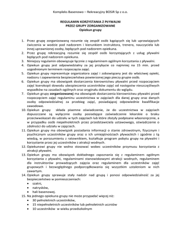 Kompleks Basenowo – Rekreacyjny BOSiR Sp z o.o. REGULAMIN KORZYSTANIA Z PŁYWALNI PRZEZ GRUPY ZORGANIZOWANE Opiekun grupy 1. Przez grupę zorganizowaną rozumie się zespół osób kąpiących się lub uprawiających ćwiczenia w wodzie pod nadzorem i kierunkiem instruktora, trenera, nauczyciela lub innej uprawnionej osoby, będących pod nadzorem opiekuna. 2. Przez grupę rekreacyjną rozumie się zespół osób korzystających z usług pływalni będących pod nadzorem opiekuna. 3. Niniejszy regulamin obowiązuje łącznie z regulaminem ogólnym korzystania z pływalni. 4. Opiekun grupy jest odpowiedzialny za jej przybycie co najmniej na 15 min. przed uzgodnionym terminem rozpoczęcia zajęć. 5. Opiekun grupy reprezentuje organizatora zajęć i zobowiązany jest do właściwej opieki, nadzoru i zapewnienia bezpieczeństwa powierzonej jego pieczy grupie osób. 6. Opiekun grupy ma obowiązek dostarczenia kierownictwu pływalni przed rozpoczęciem zajęć kserokopii dowodu ubezpieczenia uczestników zajęć od następstw nieszczęśliwych wypadków na zasadach ogólnych oraz oryginału dokumentu do wglądu. 7. Opiekun grupy zorganizowanej ma obowiązek dostarczenia kierownictwu pływalni przed rozpoczęciem zajęć regulaminu uczestnictwa w zajęciach dla danej grupy oraz danych osoby odpowiedzialnej za przebieg zajęć, posiadającej odpowiednie kwalifikacje zawodowe. 10. Opiekun grupy składa pisemne oświadczenie, że do uczestnictwa w zajęciach dopuszczane są wyłącznie osoby posiadające zaświadczenie lekarskie o braku przeciwwskazań do udziału w tych zajęciach lub które złożyły podpisane własnoręcznie, a w przypadku osób niepełnoletnich przez przedstawiciela ustawowego, oświadczenie o zdolności do udziału w zajęciach. 11. Opiekun grupy ma obowiązek posiadania informacji o stanie zdrowotnym, fizycznym i psychicznym uczestników grupy oraz o ich umiejętnościach pływackich i zgodnie z tą wiedzą, w porozumieniu z ratownikiem, kształtuje program pobytu grupy na pływalni i korzystanie przez jej uczestników z atrakcji wodnych. 12. Opiekunowi grupy nie wolno stosować wobec uczestników przymusu korzystania z atrakcji pływalni. 13. Opiekun grupy ma obowiązek dokładnego zapoznania się z regulaminem ogólnym korzystania z pływalni, regulaminami stanowiskowymi atrakcji wodnych, regulaminem dla instruktorów prowadzących zajęcia oraz regulaminem dla uczestników zajęć grupowych i bezwzględnego podporządkowania się wszystkim ustaleniom w nich zawartym. 14. Opiekun grupy sprawuje stały nadzór nad grupą i ponosi odpowiedzialność za jej bezpieczeństwo w pomieszczeniach: szatni, natrysków, hali basenowej. 15. Na jednego opiekuna grupy nie może przypadać więcej niż: 30 pełnoletnich uczestników, 15 niepełnoletnich uczestników lub pełnoletnich uczniów 10 uczestników w wieku przedszkolnym Kompleks Basenowo – Rekreacyjny BOSiR Sp z o.o. ustalona i zaakceptowana przez kierownictwo pływalni ilość osób niepełnosprawnych, w zależności od rodzaju niepełnosprawności oraz stanu zdrowia podopiecznych 16. W czasie pobytu grupy na pływalni opiekunowie są zobowiązani dopilnować, żeby jej uczestnicy przestrzegali regulaminów, zachowywali się bezpiecznie, spokojnie i kulturalnie, nie hałasowali i nie niszczyli urządzeń oraz mienia znajdującego się na terenie obiektu. 17. Opiekunowie grup wchodzą na pływalnię bezpłatnie. 18. Grupy bez opiekuna nie będą wpuszczone na pływalnię. 19. Opiekunowie grup zobowiązani są przebrać się w strój kąpielowy lub sportowy i przez cały czas pobytu grupy w hali basenowej przebywać razem z grupą oraz kontrolować zachowanie jej uczestników. 20. Opiekun grupy w czasie zajęć w wodzie powinien znajdować się w takim miejscu blisko lustra wody, z którego widziałby wszystkich uczestników i sam był przez nich widziany 21. Do obowiązków opiekuna grupy należy w szczególności: poruszanie się po terenie pływalni razem z grupą, wprowadzenie grupy do holu głównego pływalni i wskazanie miejsca oczekiwania na wejście do szatni, zapoznania uczestników grupy z regulaminem ogólnym korzystania z pływalni, regulaminami stanowiskowymi atrakcji wodnych oraz zobowiązanie uczestników do ich przestrzegania załatwienie w kasie wszelkich formalności związanych z wejściem grupowym, pobranie transponderów i czepków pływackich dla członków grupy, przekazanie transponderów i czepków pływackich uczestnikom grupy, pouczenie podopiecznych o sposobie korzystania z szafek i transponderów oraz przypomnienie o obowiązku noszenia czepków pływackich przez cały czas pobytu grupy na hali basenowej, dopilnowanie by wszyscy podopieczni pozostawili w szatni okrycia zewnętrzne oraz obuwie i założyli klapki basenowe, podpisanie zobowiązania do bezwzględnego przestrzegania regulaminów krytej pływalni, podanie nazwy i adresu placówki, nazwiska opiekuna i liczebności grupy, wprowadzenie grupy do szatni i dopilnowanie przebrania się w stroje kąpielowe, umieszczenia odzieży w szafkach oraz właściwego zamknięcia szafek, wprowadzenie grupy z szatni do pomieszczeń z natryskami i sanitariatów wskazanie sanitariatów i ubikacji oraz zwrócenie uwagi na obowiązek korzystania z ubikacji i sanitariatów w czasie całego pobytu w hali basenowej, dopilnowanie starannego umycia się przy użyciu środków myjących, dopilnowanie właściwego rodzaju, kompletności i stanu higienicznego stroju kąpielowego uczestnika, dopilnowanie założenia czepka pływackiego i egzekwowanie jego noszenia przez cały czas pobytu grupy na hali basenowej, wprowadzenie grupy z pomieszczeń natryskowych do hali basenu oraz przypilnowanie, żeby wszyscy podopieczni przy wejściu na basen opłukali stopy środkiem dezynfekującym, zgłoszenie ratownikowi faktu wprowadzenia grupy do hali basenowej, w celu ustalenia zasad korzystania z kąpieli zarządzanie zbiórki i sprawdzenie stanu liczebnego grupy Kompleks Ba