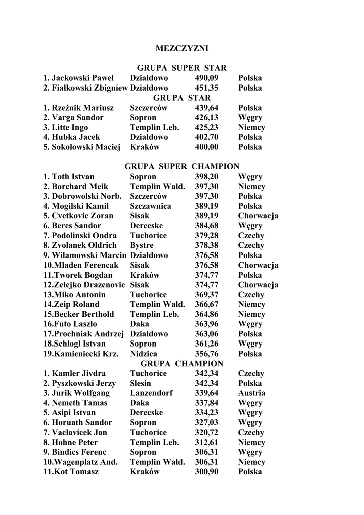 MEZCZYZNI GRUPA SUPER STAR 1. Jackowski Paweł Działdowo 490,09 2. Fiałkowski Zbigniew Działdowo 451,35 GRUPA STAR 1. Rzeźnik Mariusz Szczerców 439,64 2. Varga Sandor Sopron 426,13 3. Litte Ingo Templin Leb. 425,23 4. Hubka Jacek Działdowo 402,70 5. Sokołowski Maciej Kraków 400,00 Polska Polska Polska Węgry Niemcy Polska Polska GRUPA SUPER CHAMPION 1. Toth Istvan Sopron 398,20 Węgry 2. Borchard Meik Templin Wald. 397,30 Niemcy 3. Dobrowolski Norb. Szczerców 397,30 Polska 4. Mogilski Kamil Szczawnica 389,19 Polska 5. Cvetkovic Zoran Sisak 389,19 Chorwacja 6. Beres Sandor Derecske 384,68 Węgry 7. Podolinski Ondra Tuchorice 379,28 Czechy 8. Zvolanek Oldrich Bystre 378,38 Czechy 9. Wilamowski Marcin Działdowo 376,58 Polska 10.Mladen Ferencak Sisak 376,58 Chorwacja 11.Tworek Bogdan Kraków 374,77 Polska 12.Zelejko Drazenovic Sisak 374,77 Chorwacja 13.Miko Antonin Tuchorice 369,37 Czechy 14.Zeip Roland Templin Wald. 366,67 Niemcy 15.Becker Berthold Templin Leb. 364,86 Niemcy 16.Futo Laszlo Daka 363,96 Węgry 17.Prochniak Andrzej Działdowo 363,06 Polska 18.Schlogl Istvan Sopron 361,26 Węgry 19.Kamieniecki Krz. Nidzica 356,76 Polska GRUPA CHAMPION 1. Kamler Jivdra Tuchorice 342,34 Czechy 2. Pyszkowski Jerzy Slesin 342,34 Polska 3. Jurik Wolfgang Lanzendorf 339,64 Austria 4. Nemeth Tamas Daka 337,84 Węgry 5. Asipi Istvan Derecske 334,23 Węgry 6. Horuath Sandor Sopron 327,03 Węgry 7. Vaclavicek Jan Tuchorice 320,72 Czechy 8. Hohne Peter Templin Leb. 312,61 Niemcy 9. Bindics Ferenc Sopron 306,31 Węgry 10.Wagenplatz And. Templin Wald. 306,31 Niemcy 11.Kot Tomasz Kraków 300,90 Polska 1. Rzepkowski Jan 2. Simon Lajos 3. Sidlo Martin 4. Schroter Manfred 5. Strege Christian 6. Bohme Lais 7. Zapotocny Dawid 8. Vajda Norbert 9. Matura Vladimir 10.Sonntag Bein 11.Huscheck Mario 12. Damaschk Ewald GRUPA MASTER Szczerców 296,40 Derecske 284,68 Bystre 283,78 Heilbrunn 283,78 Templin Wald. 281,08 Heilbrunn 275,68 Tuchorice 264,86 Daka 262,16 Bystre 261,26 Heilbrunn 255,86 Hausleben 253,15 Heilbrunn 251,35 GRUPA PRETENDENT 1. Urbaniak Marek Szczawnica 248,65 2. Molenda Mariusz Działdowo 247,75 3. Toth Janos Derecske 227,03 4. Kaldowski Jan Hausleben 221,62 5. Fijałkowski Łukasz Nidzica 203,60 6. Seyda Bernhard Heilbrunn 200,90 GRUPA SPORTMAN 1. Gałka Marcin Olsztyn 198,20 2. Koszek Kamil Szczerców 186,49 3. Bielski Stanisław Szczawnica 180,18 4. Zieska Maik Hausleben 176,58 5. Pesak Jan Tuchorice 170,27 6. Smolich Jerzy Slesin 160,36 7. Pyć Janusz Olsztyn 153,15 8. Lenzenhofer Heinz Lanzendorf 152,25 GRUPA KANDYDAT 1. Kamecki Łukasz Szczerców 127,03 2. Walczak Jan Slesin 118,02 3. Posepny Jindrich Bystre 115,32 4. Prochazka Antonin Bystre 112,61 GRUPA KADET 1. Rusbeck Andreas Lanzendorf 90,99 2. Mikołajewski Daniel Nidzica 77,48 3. Krause Sigfried Heilbrunn 59,46 1. Rutkowski Detmar 2. Lakatos Ferenc GRUPA BEGINNER Hausleben 36,94 Daka 27,93 Polska Węgry Czechy Niemcy Niemcy Niemcy Czechy Węgry Czechy Niemcy Niemcy Niemcy Polska Polska Węgry Niemcy Polska Niemcy Polska Polska Polska Niemcy Czechy Polska Polska Austria Polska Polska Czechy Czechy Austria Polska Niemcy Niemcy Węgry