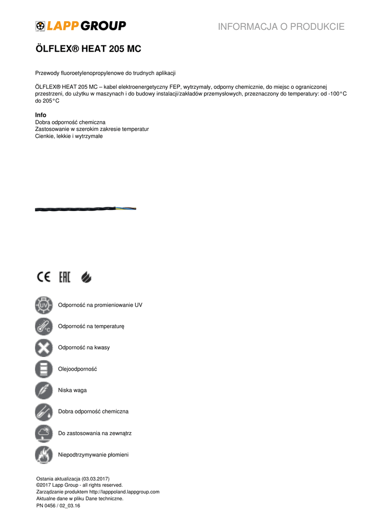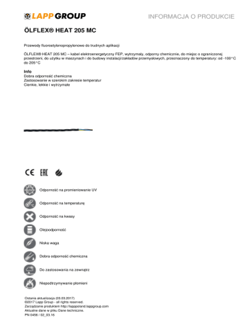 INFORMACJA O PRODUKCIE ÖLFLEX® HEAT 205 MC Przewody fluoroetylenopropylenowe do trudnych aplikacji ÖLFLEX® HEAT 205 MC – kabel elektroenergetyczny FEP, wytrzymały, odporny chemicznie, do miejsc o ograniczonej przestrzeni, do użytku w maszynach i do budowy instalacji/zakładów przemysłowych, przeznaczony do temperatury: od -100°C do 205°C Info Dobra odporność chemiczna Zastosowanie w szerokim zakresie temperatur Cienkie, lekkie i wytrzymałe Odporność na promieniowanie UV Odporność na temperaturę Odporność na kwasy Olejoodporność Niska waga Dobra odporność chemiczna Do zastosowania na zewnątrz Niepodtrzymywanie płomieni Ostania aktualizacja (03.03.2017) ©2017 Lapp Group - all rights reserved. Zarządzanie produktem http://lapppoland.lappgroup.com Aktualne dane w pliku Dane techniczne. PN 0456 / 02_03.16 INFORMACJA O PRODUKCIE ÖLFLEX® HEAT 205 MC Odporny na działanie niskich temperatur Korzyści Oszczędność miejsca i redukcja masy instalacji dzięki małej średnicy przewodu Odporny w kontakcie z większością szczególnie agresywnych chemikaliów Niska emisja gazów Dzięki swoim właściwościom elektrycznym i mechanicznym doskonały do podłączania czujników Zakres zastosowania Stosowany w środowisku, gdzie występują bardzo wysokie temperatury, agresywne media chemiczne oraz ograniczona przestrzeń Typowe obszary zastosowania: - Budowa pieców przemysłowych - Odlewnie - Przemysł chemiczny - Przemysł energetyczny - Linie lakiernicze - Elementy grzejne - Przetwórstwo tworzyw sztucznych - Elektrownie wiatrowe Systemy pomiarowe np. poziom oczujnikowania Cechy produktu ÖLFLEX® HEAT 205 z FEP: - doskonała odporność na działanie kwasów, rozpuszczalników, lakierów, benzyny, olejów i wiele innych środków chemicznych - trudnopalność - wysoka wytrzymałość na przebicia elektryczne i ścieranie - niska chłonność wody - odporność na mikroby - izolacja o małej przyczepności - odporność na warunki pogodowe i ozon - hydrofobowość i odporność na brud - wysoka plastyczność i odporność na rozdarcie - odporność na płyny hydrauliczne Samogasnący zgodnie z IEC 60332-1-2 Budowa produktu Żyły z cienkich drucików z miedzi cynowanej Izolacja żyły: na bazie FEP Żyły skręcone razem Płaszcz zewnętrzny na bazie FEP, kolor czarny Ostania aktualizacja (03.03.2017) ©2017 Lapp Group - all rights reserved. Zarządzanie produktem http://lapppoland.lappgroup.com Aktualne dane w pliku Dane techniczne. PN 0456 / 02_03.16 INFORMACJA O PRODUKCIE ÖLFLEX® HEAT 205 MC Dane techniczne Klasyfikacja: ETIM 5.0 Class-ID: EC001578 Opis klasy ETIM 5.0: Przewód giętki Oznaczenie żył: Do 5 żył: według VDE 0293-308 Od 7 żył: kod koloru ÖLFLEX® – patrz załącznik T7 Budowa żyły: Z cienkich drucików według VDE 0295, klasa 5/IEC 60228, klasa 5 od 0,5 mm² Minimalny promień gięcia: Sporadycznie ruchome: 15 x średnica zewnętrzna Połączenia nieruchome: 4 x średnica zewnętrzna Napięcie nominalne: U 0 /U: 300/500 V Napięcie próbne: 2500 V Żyła ochronna: G = z żyłą ochronną żółto - zieloną X = bez żyły ochronnej Zakres temperatury: Połączenia nieruchome: od -100°C do +205°C Wskazówka Wszystkie podane wartości dotyczące produktów są wartościami nominalnymi (o ile nie wskazano inaczej). Inne wartości, takie jak np. tolerancje mogą być przedstawione na zamówienie (jeżeli są dostępne i przeznaczone do publikacji). Standardowe odcinki proszę sprawdzić na: www.lapppolska.pl Rodzaj opakowania: krążek ≤ 30 kg lub ≤ 250 m, w przeciwnym razie bęben Prosimy określić wielkość opakowania (np. 1 x 500 m bęben lub 5 x 100 m krążek) Fotografie nie mogą być używane do wymiarowania oraz nie stanowią szczegółowego odwzorowania przedstawionych produktów. * Podane ceny to ceny netto bez podatku VAT i dodatkowych opłat. Sprzedaż klientom biznesowym. Ostania aktualizacja (03.03.2017) ©2017 Lapp Group - all rights reserved. Zarządzanie produktem http://lapppoland.lappgroup.com Aktualne dane w pliku Dane techniczne. PN 0456 / 02_03.16 Powered by TCPDF (www.tcpdf.org) Średnica zewnętrzna [mm] Indeks miedzi [kg/km] Waga [kg/km] 0091200 2 X 0,25 3,1 5 17,2 0091201 3 G 0,25 3,3 7,5 22,2 00912023 4 G 0,25 3,6 10 27,5 0091210 2 X 0,5 3,8 9,8 21,6 0091211 3 G 0,5 4 14,7 32,8 00912123 4 G 0,5 4,4 19,6 44,4 0091220 2 X 0,75 4,2 14,4 31,5 0091221 3 G 0,75 4,6 21,6 46,1 00912223 4 G 0,75 4,9 29 57,9 0091230 2X1 4,5 19 41,6 0091231 3G1 4,8 29 55,6 00912323 4G1 5,3 38 70 0091100 3 G 1,5 5,6 43 70 00911033 4 G 1,5 6,1 58 98 00911013 5 G 1,5 6,8 72 117 0091102 7 G 1,5 7,4 101 184 0091236 3 G 2,5 6,6 72 86 00912353 4 G 2,5 7,3 96 115 00912373 5 G 2,5 8,2 120 144 00912423 4G4 8,7 154 180 00912433 5G4 9,6 192 225 ÖLFLEX® HEAT 205 MC INFORMACJA O PRODUKCIE Liczba żył i przekrój [mm²] ÖLFLEX® HEAT 205 MC Ostania aktualizacja (03.03.2017) ©2017 Lapp Group - all rights reserved. Zarządzanie produktem http://lapppoland.lappgroup.com Aktualne dane w pliku Dane techniczne. PN 0456 / 02_03.16 Powered by TCPDF (www.tcpdf.org) Numer katalogowy